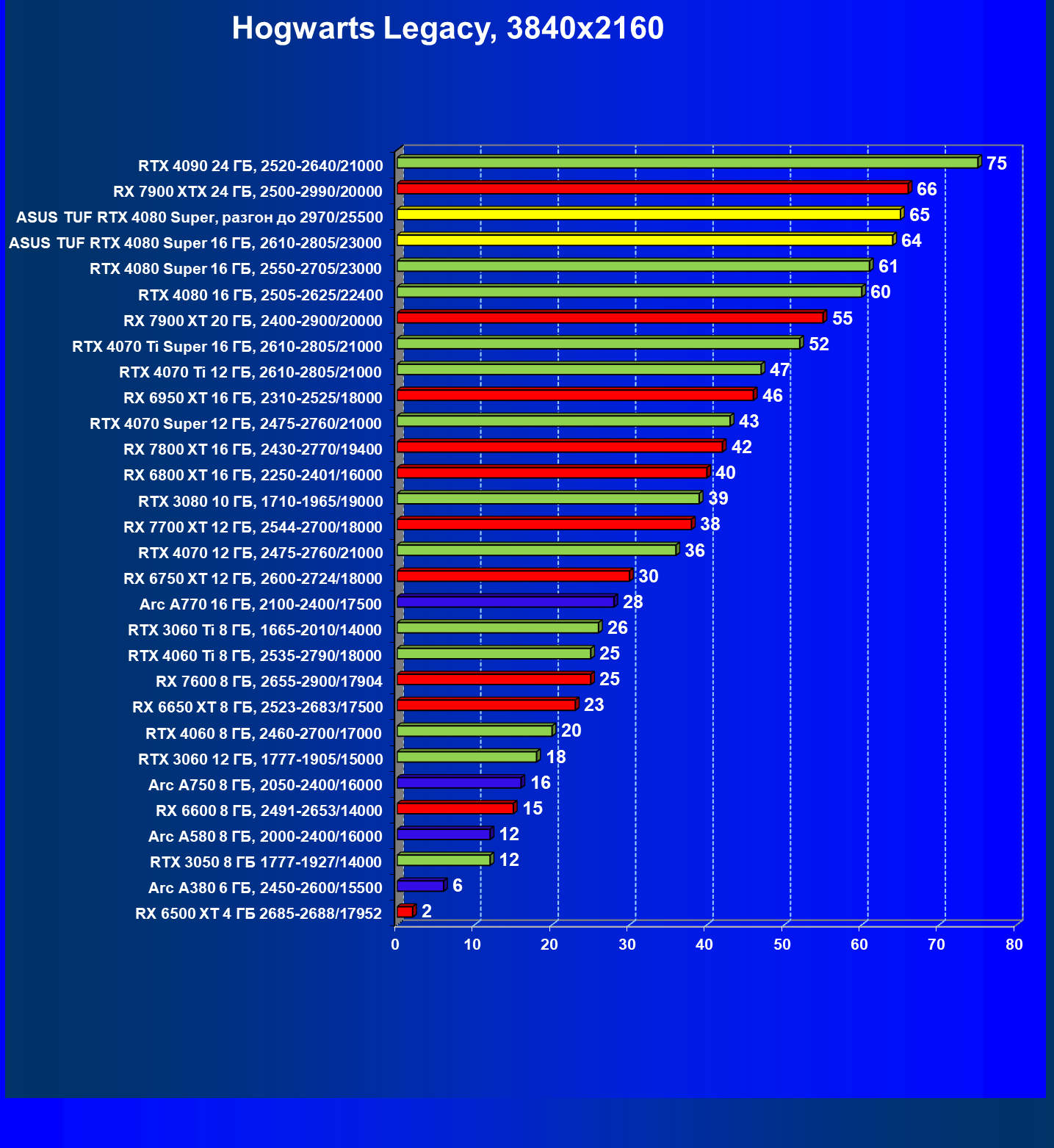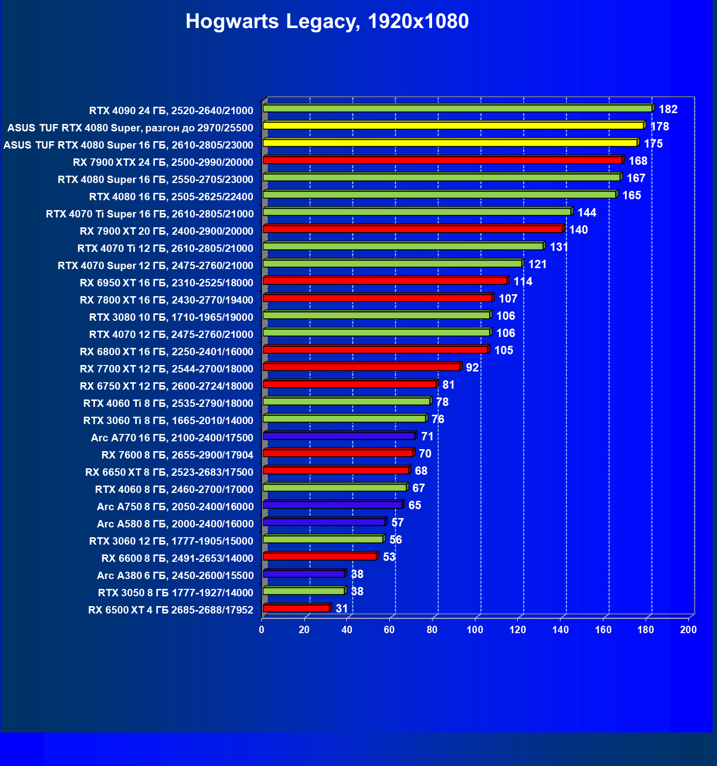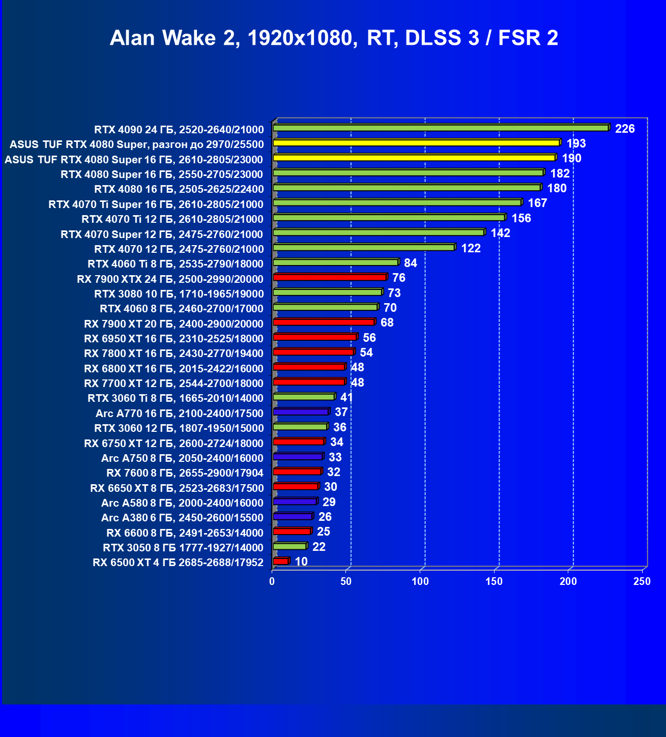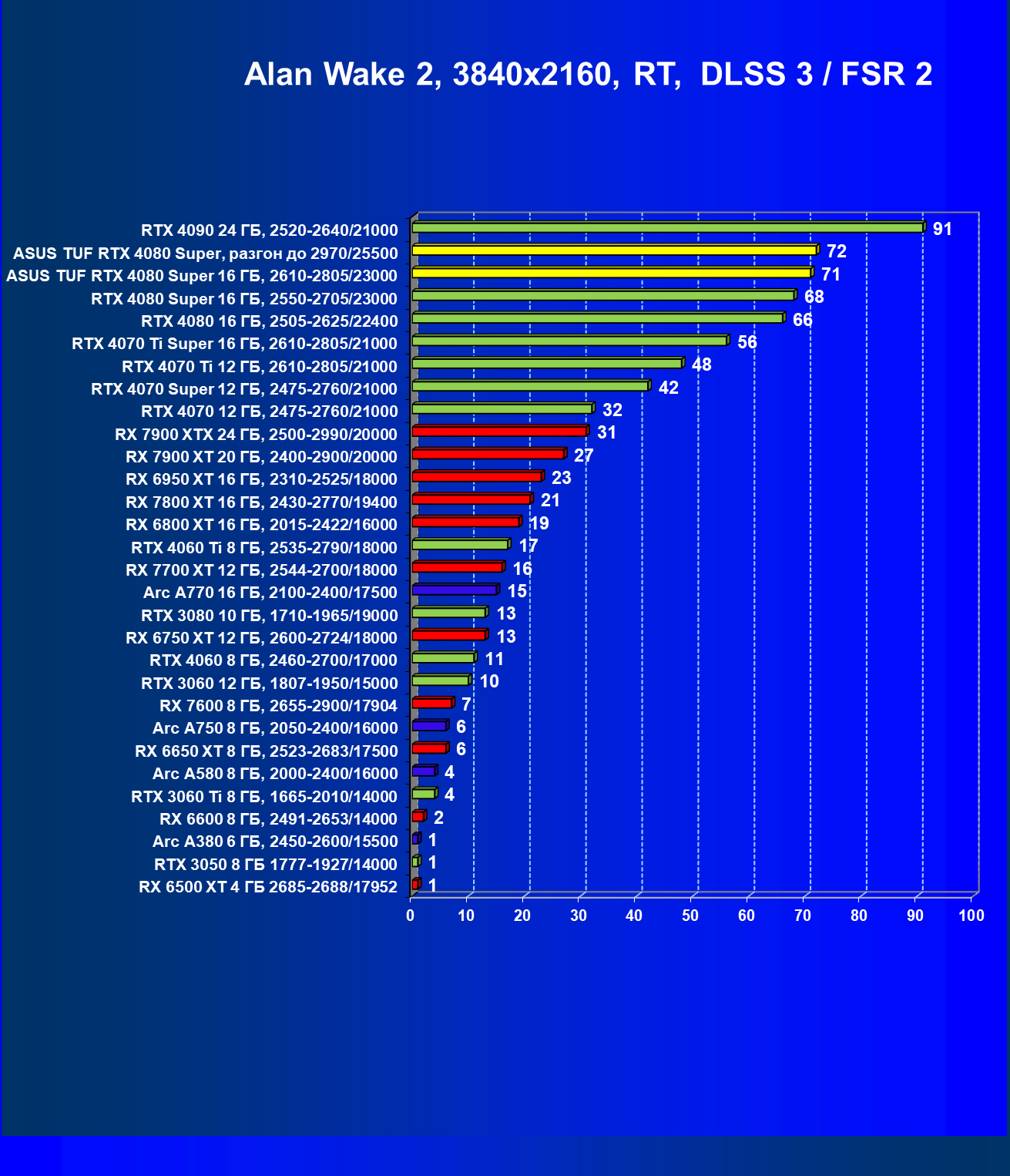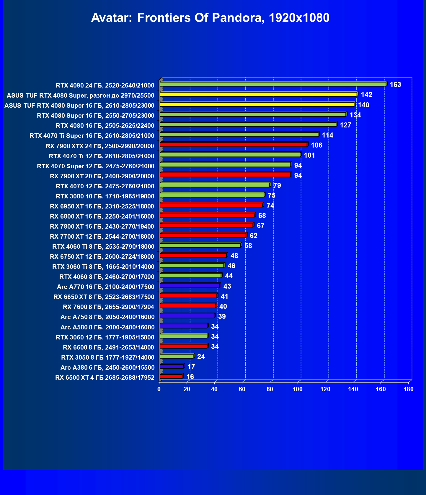 | 11 | Asus TUF RTX 4080 Super, разгон до 2970/25500 | 238 | 3218 | 135 000 |