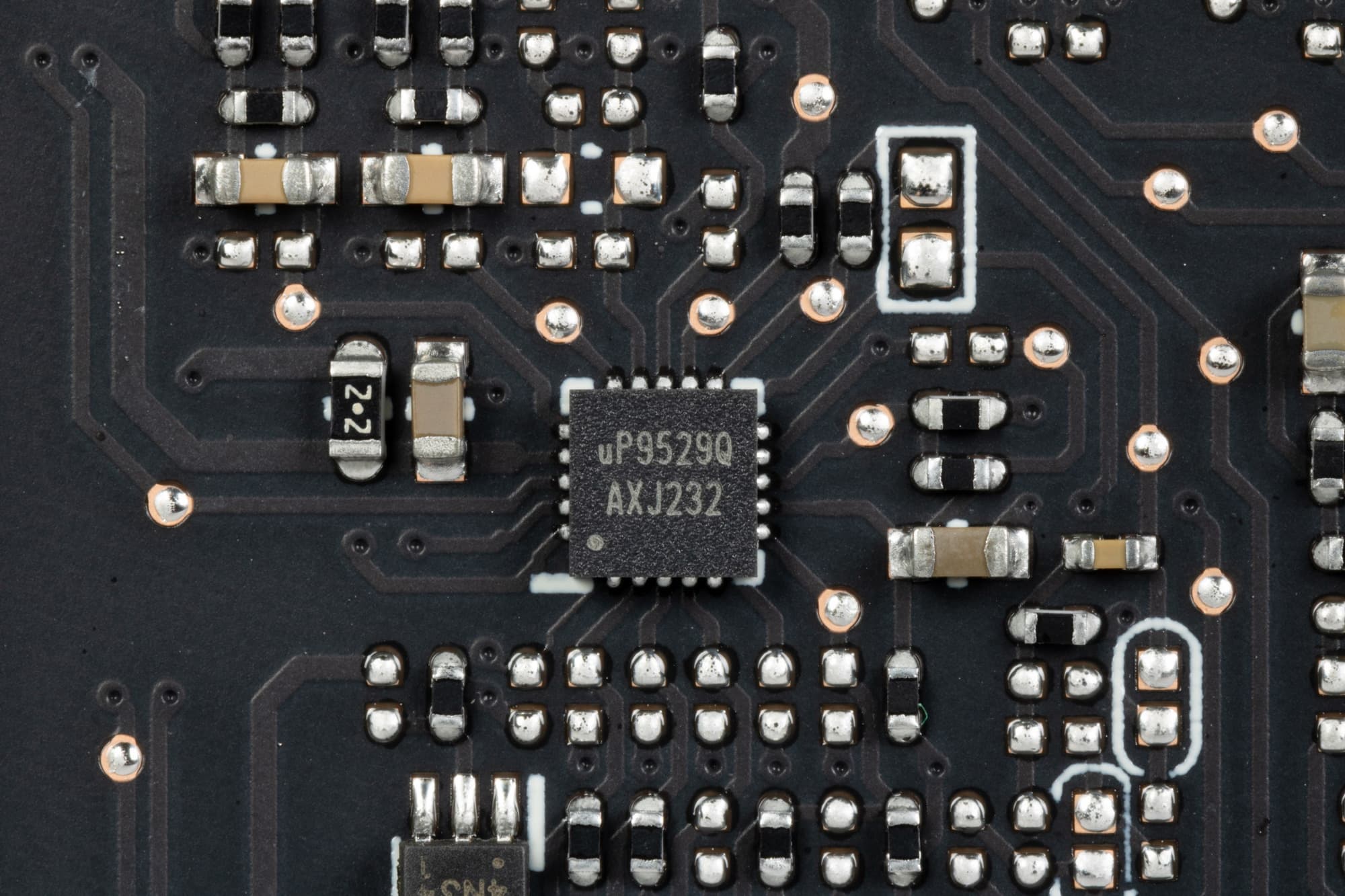 Питанием микросхем памяти управляет ШИМ-контроллер uP9529Q (uPI Semiconductor).