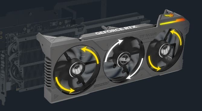 Поверх радиатора установлен кожух с тремя вентиляторами типа Axial-tech, у которых концы лопастей соединены кольцом для более четкого направления потоков воздуха на радиатор. Каждый вентилятор использует два шарикоподшипника. Как заявляет производитель, такая схема позволяет пропускать на 23% больше воздуха, что улучшает охлаждение, но при этом шум не возрастает.