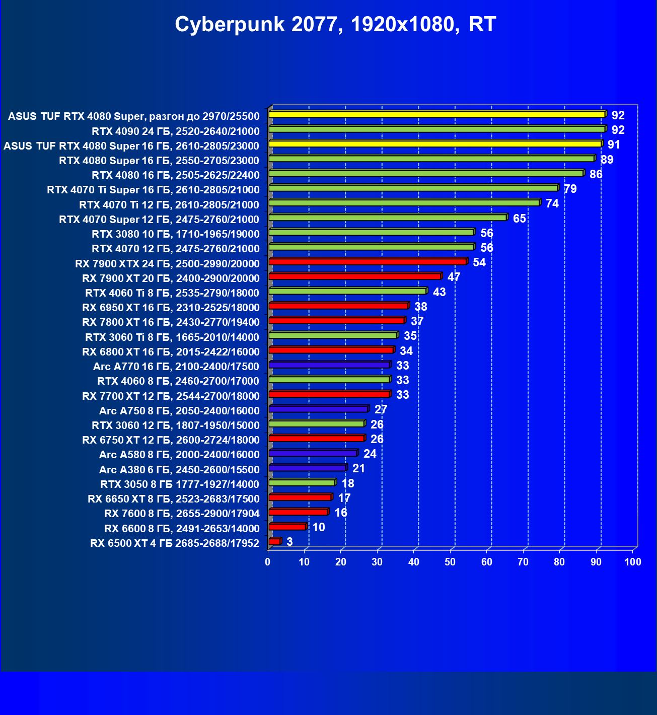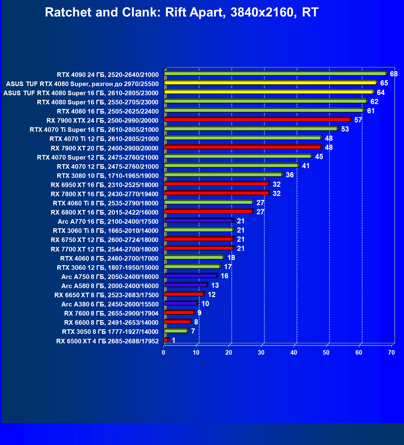 Однако это рейтинг производительности без использования RT и технологий масштабирования. Уверен, что в 2024 году глупо покупать флагманский ускоритель и не использовать все возможности современных игр.