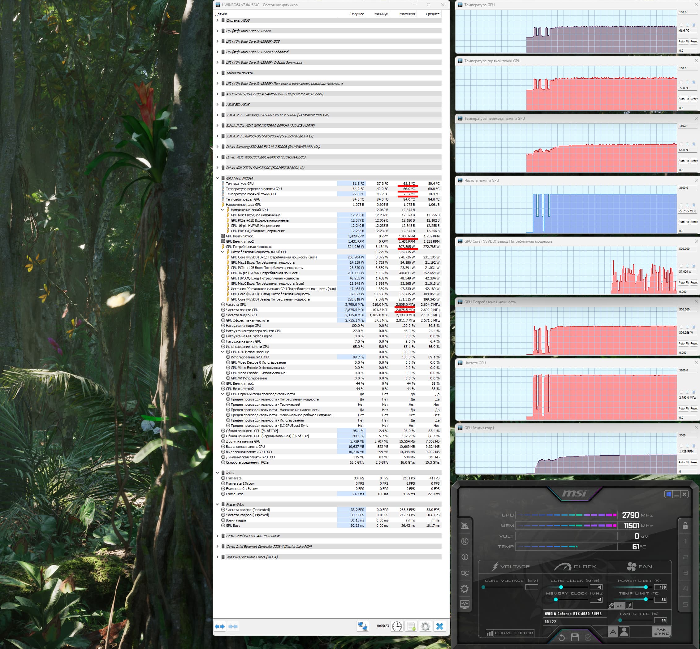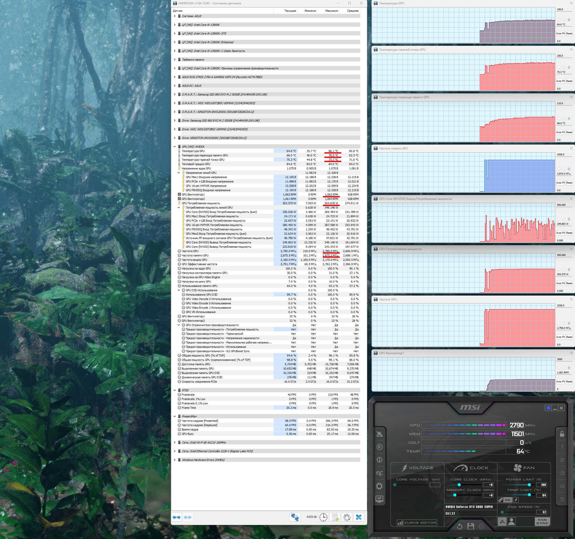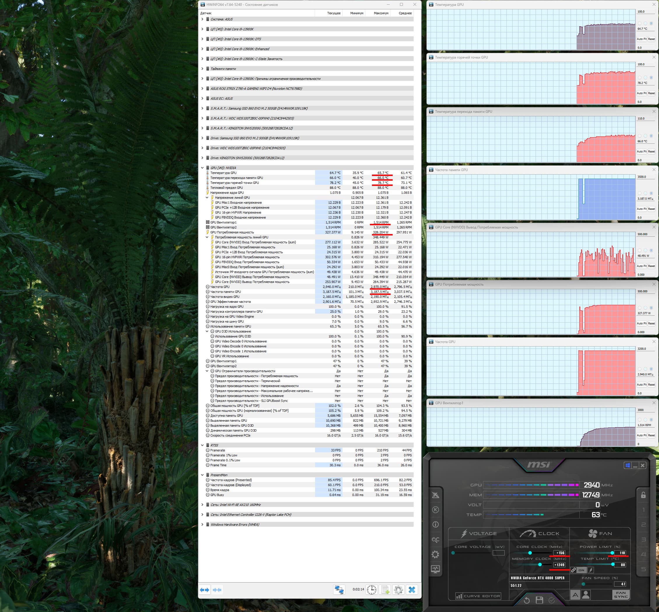 При ручном разгоне параметры нагрева и шума менялись мало (66/66 °С), но максимальное потребление выросло до 328 Вт (пиковое 349 Вт), прибавилось 5,5% производительности, при этом температура самой горячей точки ГП (hot spot) составляла 79 °C.