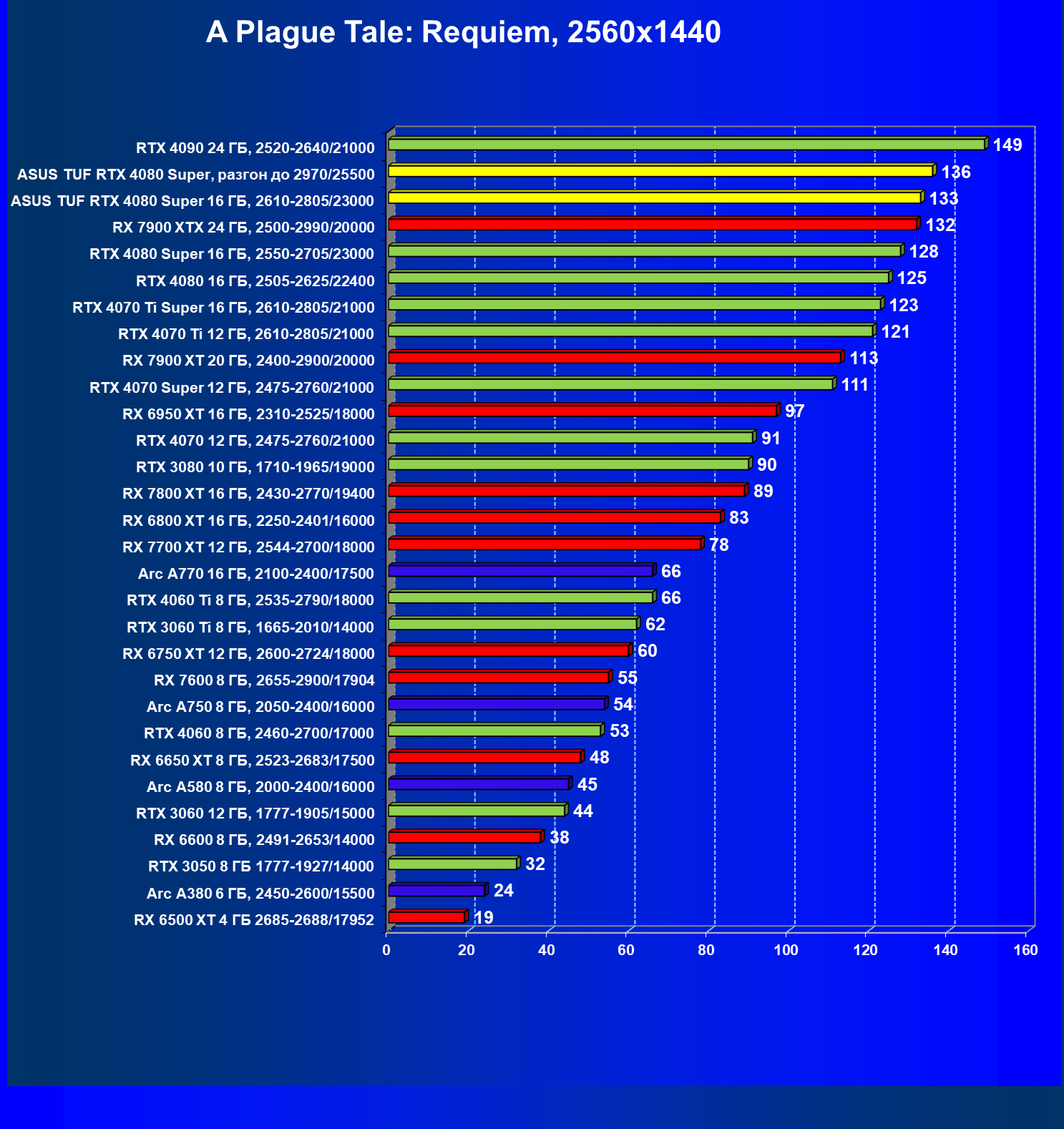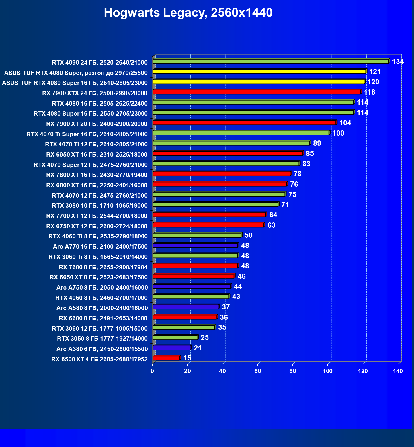| 23 | RTX 4080 Super 16 ГБ, 2550—2705/23000 | 134 | 1671 | 125 000 |