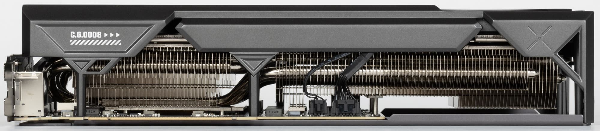 Задняя пластина не только служит элементом защиты PCB, но и участвует в охлаждении оборотной стороны платы через термопрокладки, которые отводят тепло в зоне VRM. Также пластина оснащена большими вырезами для лучшего сквозного продува радиатора.