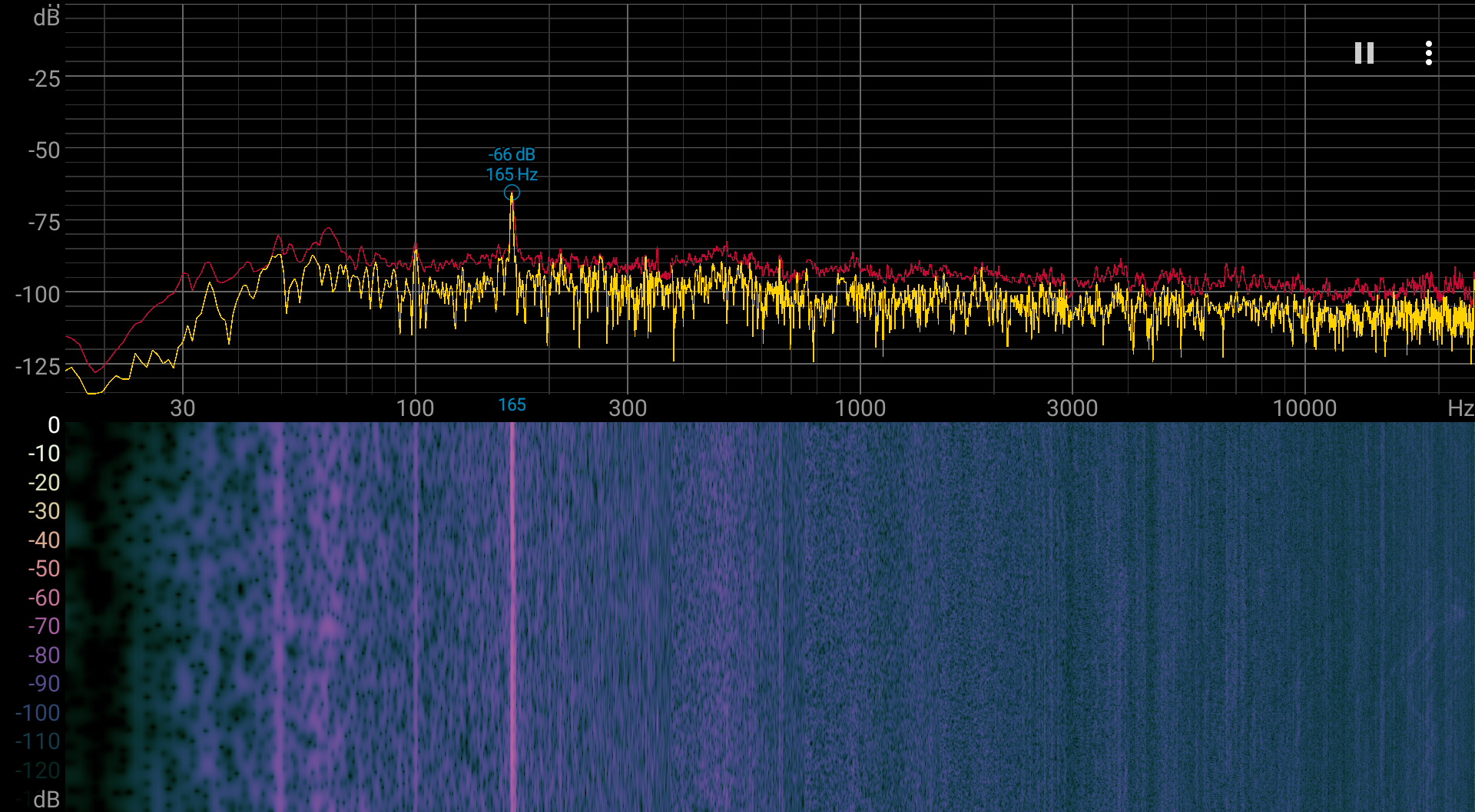Спектрограмма шума достаточно ровная, но есть выраженный пик на 165 Гц.