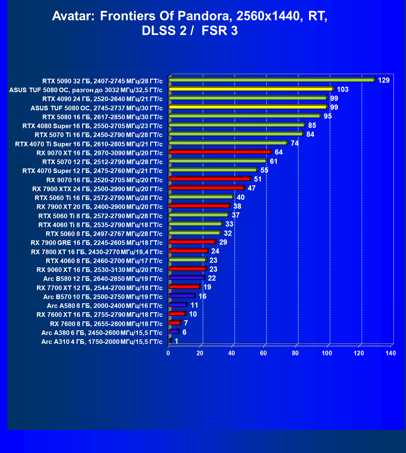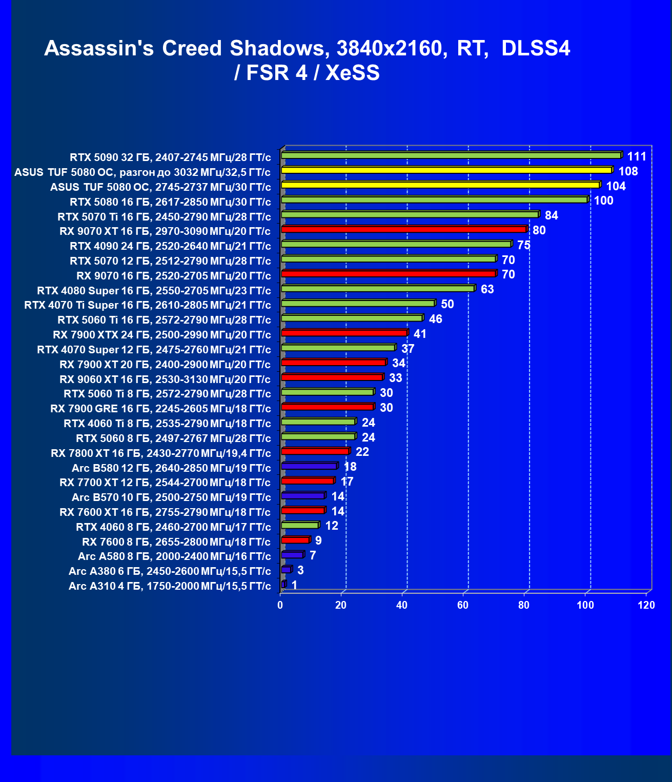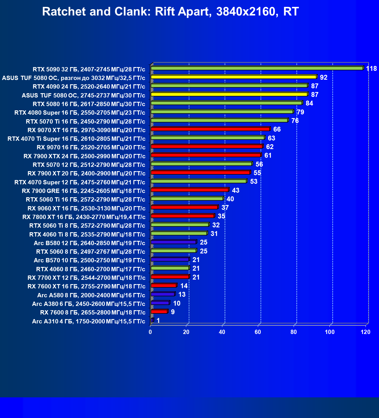 | 26 | RX 7900 XTX 24 ГБ, 2500—2990 МГц/20 ГТ/с | 475 | 5979 | 126 000 |