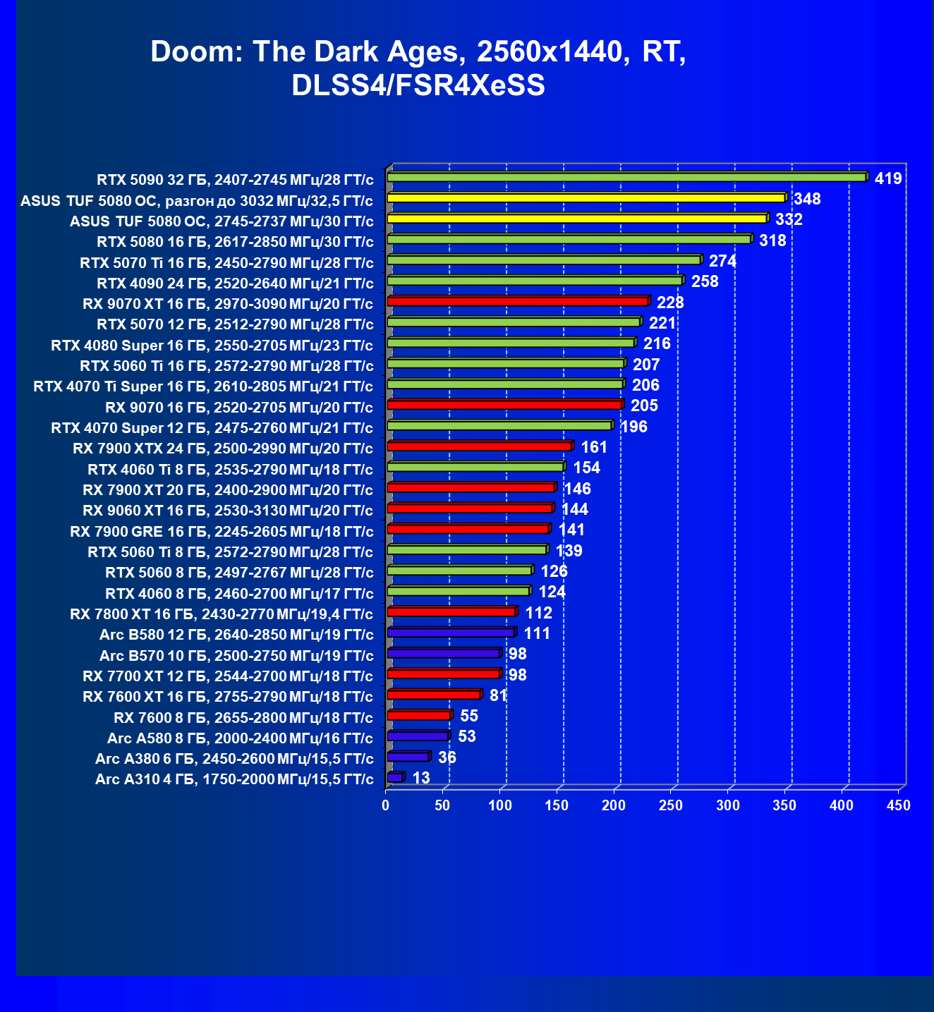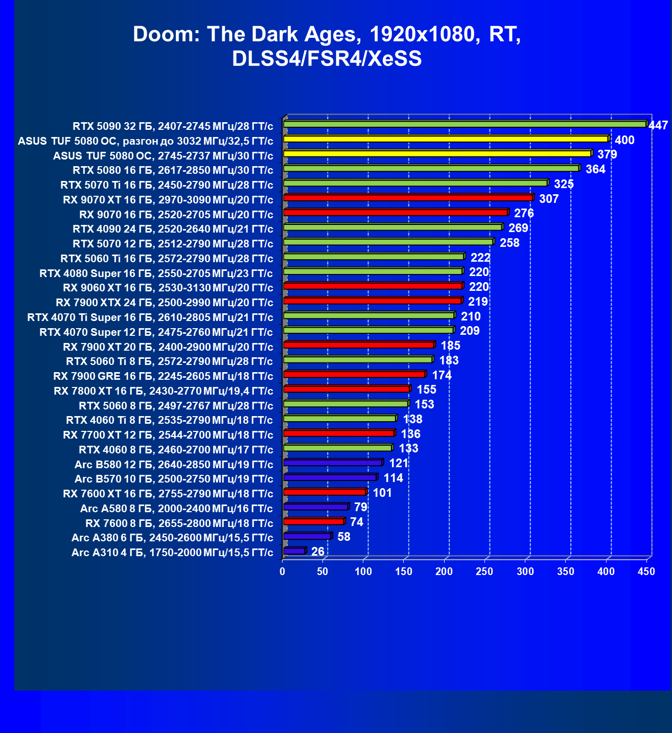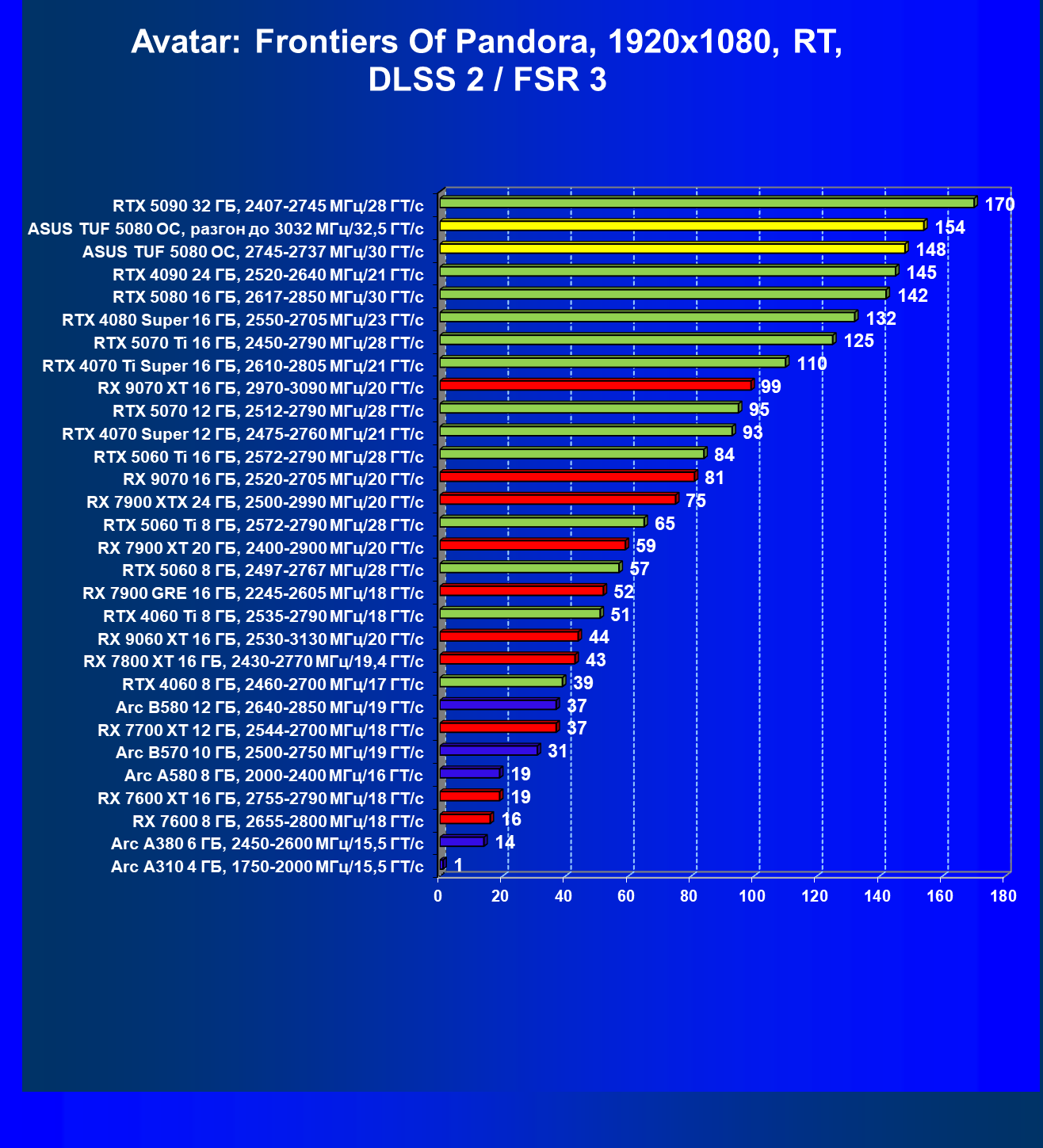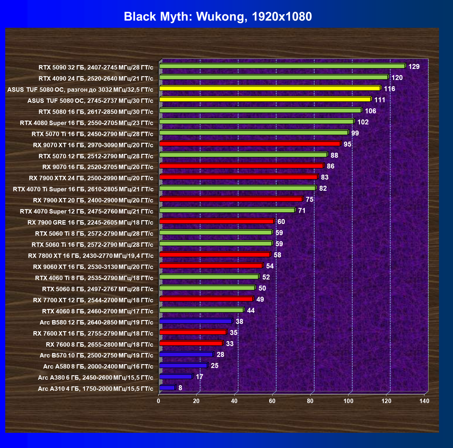 | 26 | RX 7900 XTX 24 ГБ, 2500—2990 МГц/20 ГТ/с | 475 | 5979 | 126 000 |