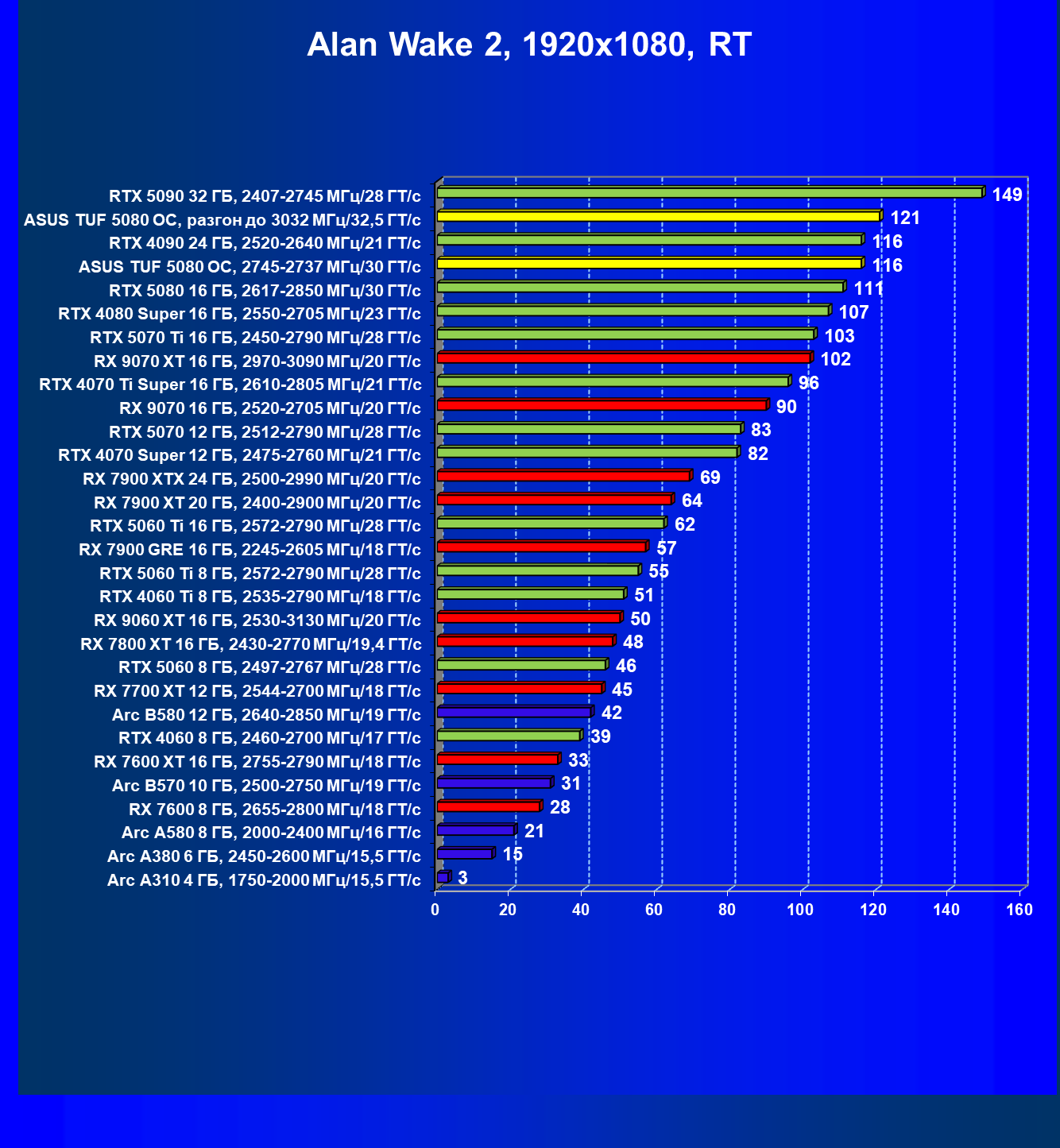В классических играх в разрешении 4K GeForce RTX 5080 опережает GeForce RTX 4080 Super в среднем на 7%, Radeon RX 9070 XT — на 6%, а Radeon RX 7900 XTX — на 12%. При этом GeForce RTX 5080 отстает от флагмана предыдущего поколения GeForce RTX 4090 на 9%. Карта Asus из-за фабрично повышенных частот GPU превосходит референсный вариант на 3,5 — 3,8%, а при ручном разгоне — на 8 — 8,5%.