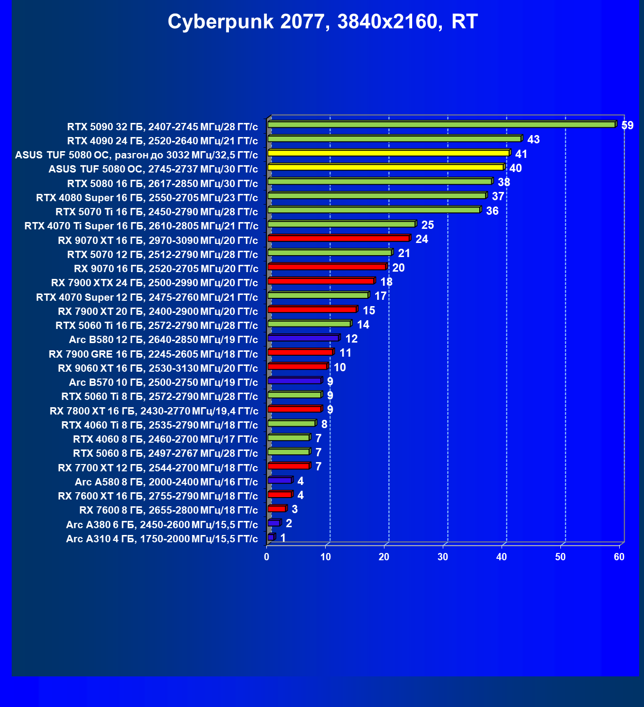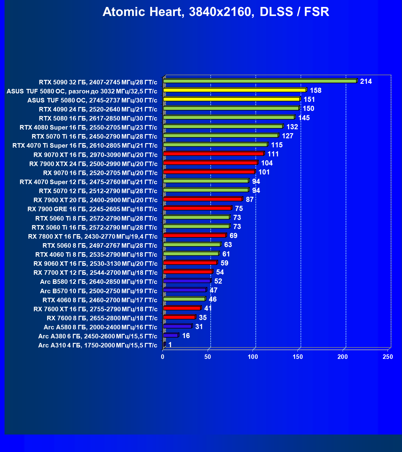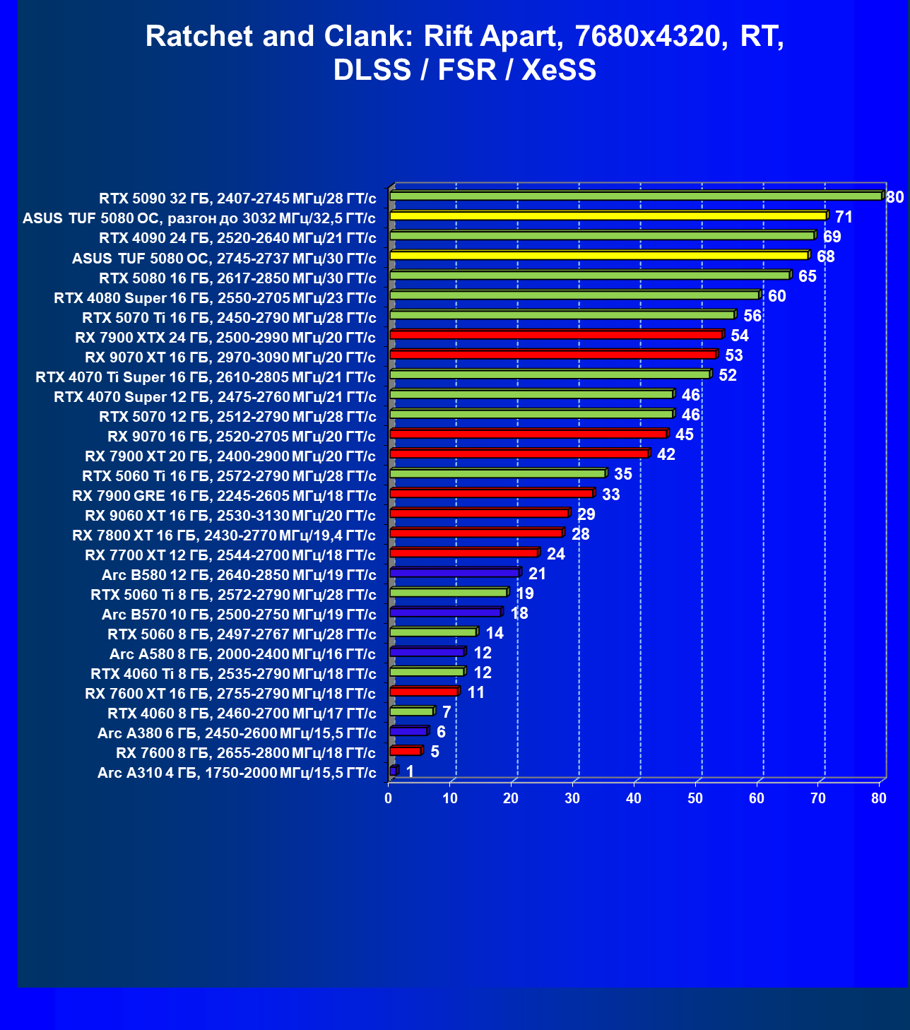 | 08 | RX 9070 XT 16 ГБ, 2970—3090 МГц/20 ГТ/с | 7979 | 1078 | 74 000 |
