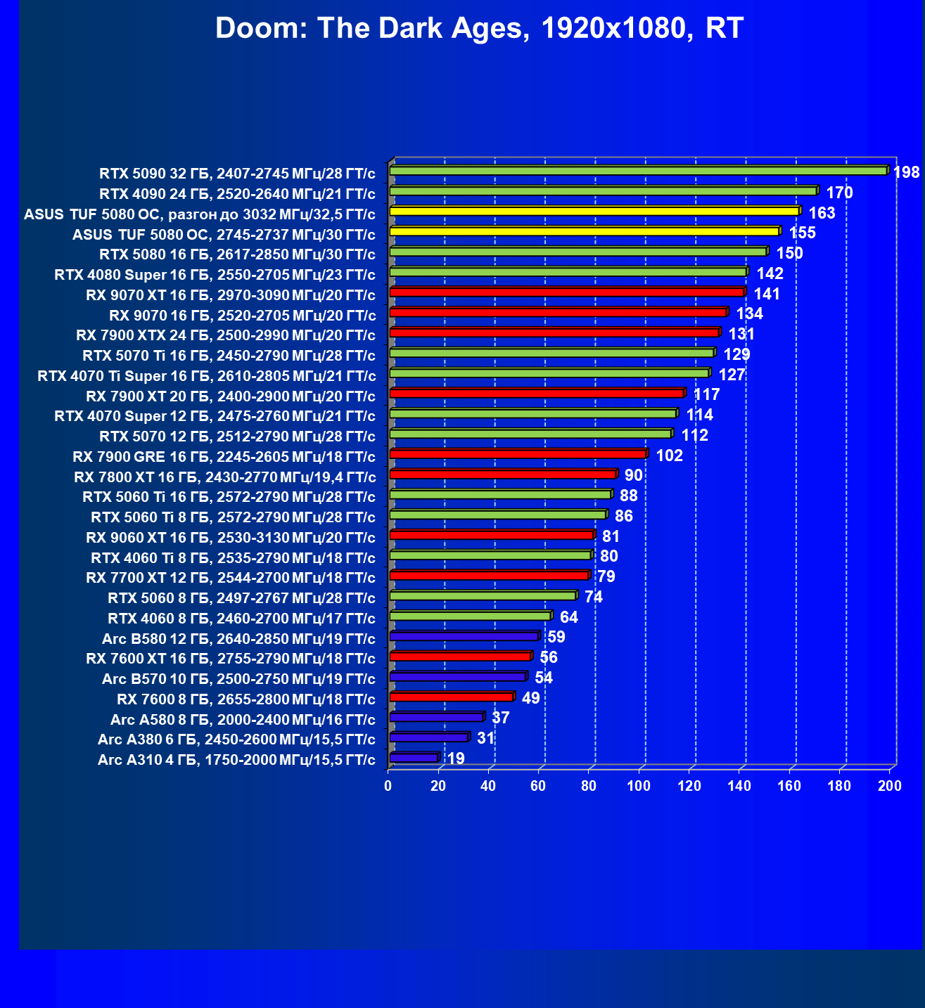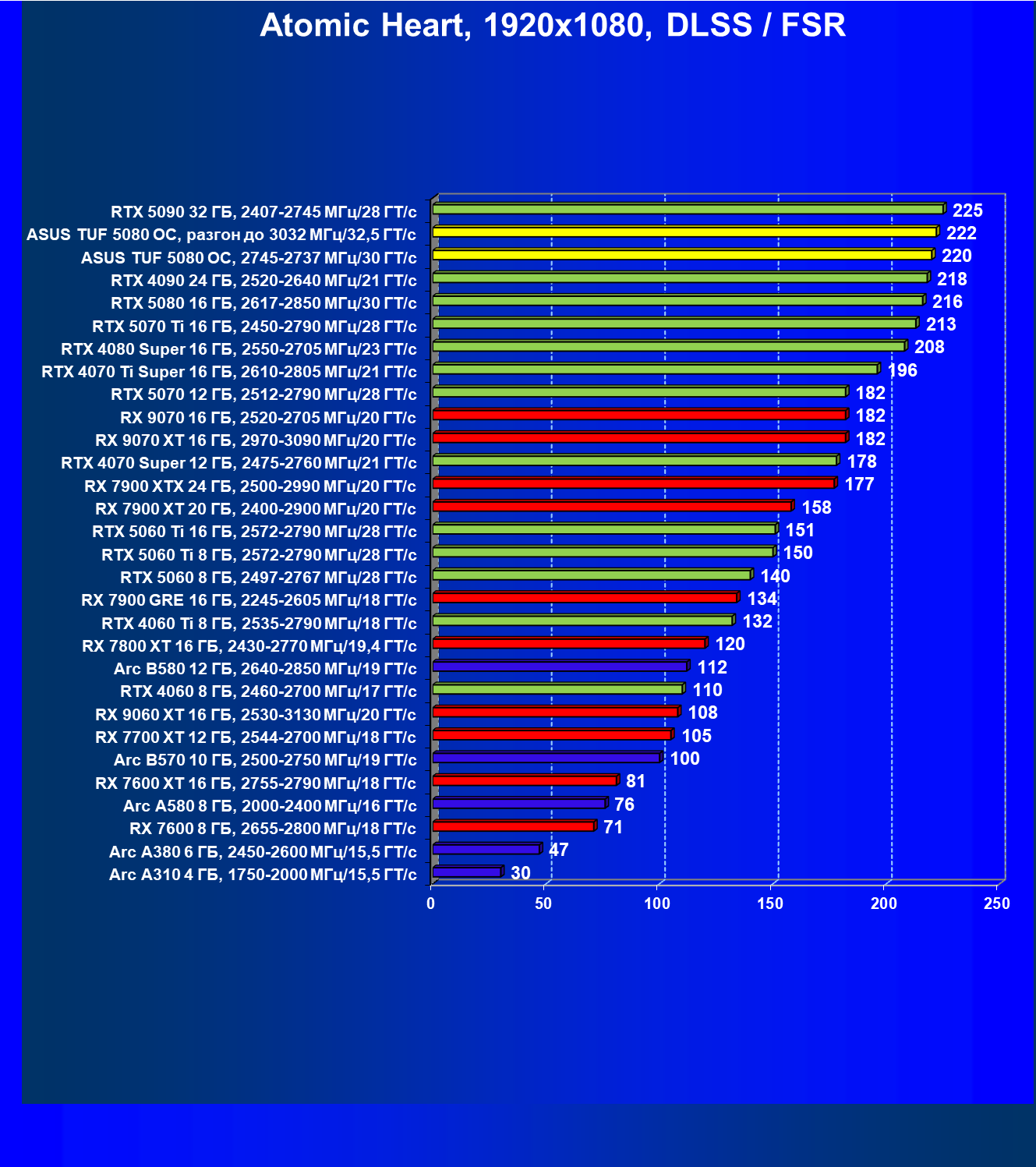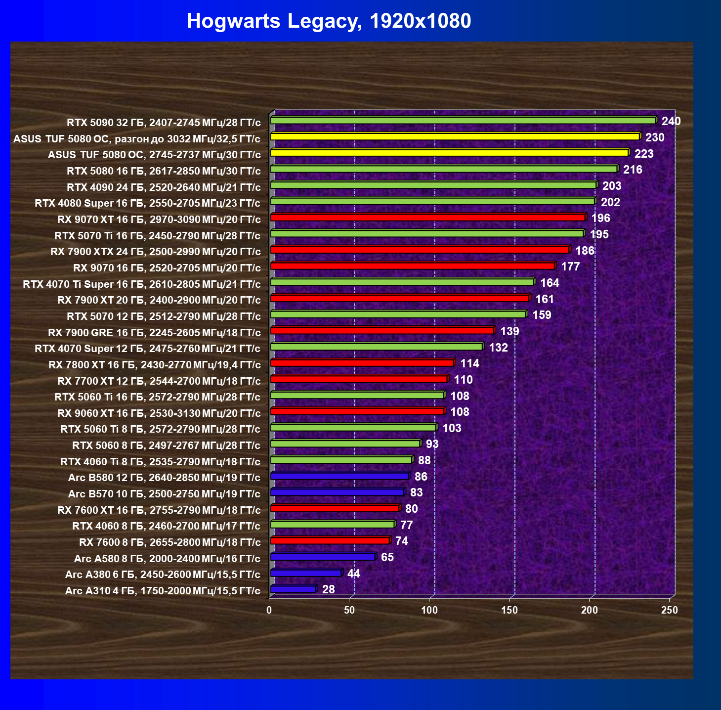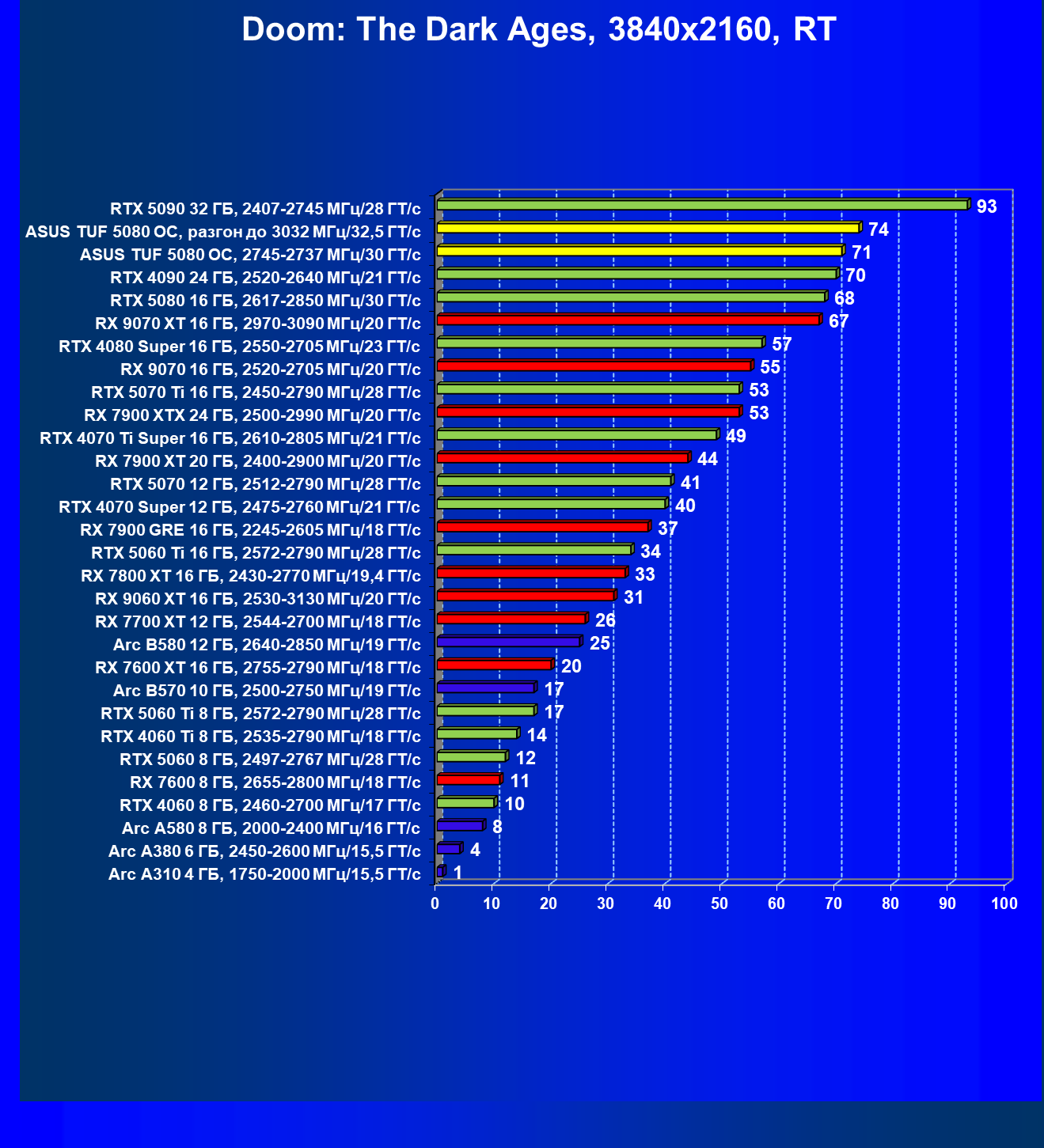 | 08 | RX 9070 XT 16 ГБ, 2970—3090 МГц/20 ГТ/с | 7979 | 1078 | 74 000 |