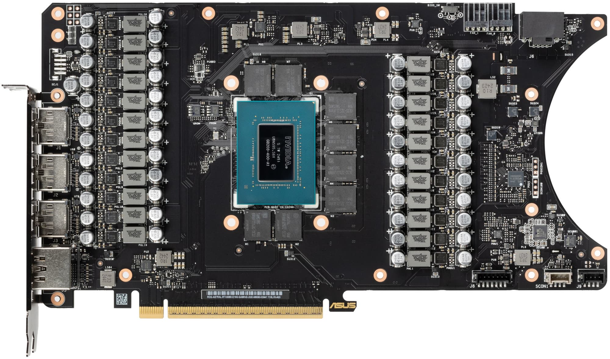 Очевидно, что платы имеют сходства в плане размещения ядра и микросхем памяти, а также в целом по системе питания. Но и отличие видны невооруженным глазом: у карты ROG Astral печатная плата на хвосте имеет округлый вырез для крепления четвертого вентилятора, также претерпела изменения область GPU+VRAM: у карты серии TUF Gaming на 4 фазы питания меньше.
