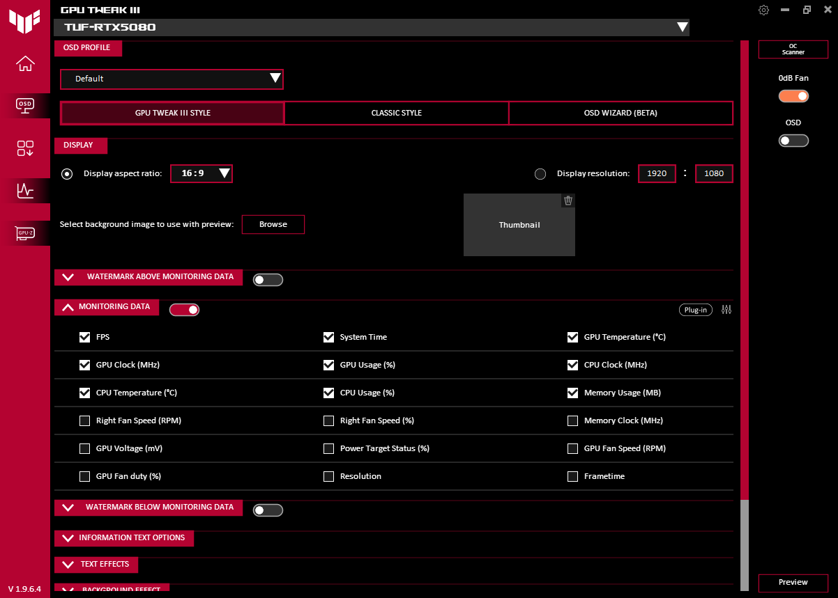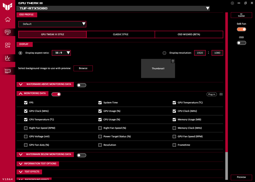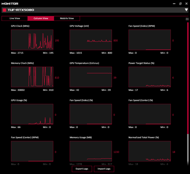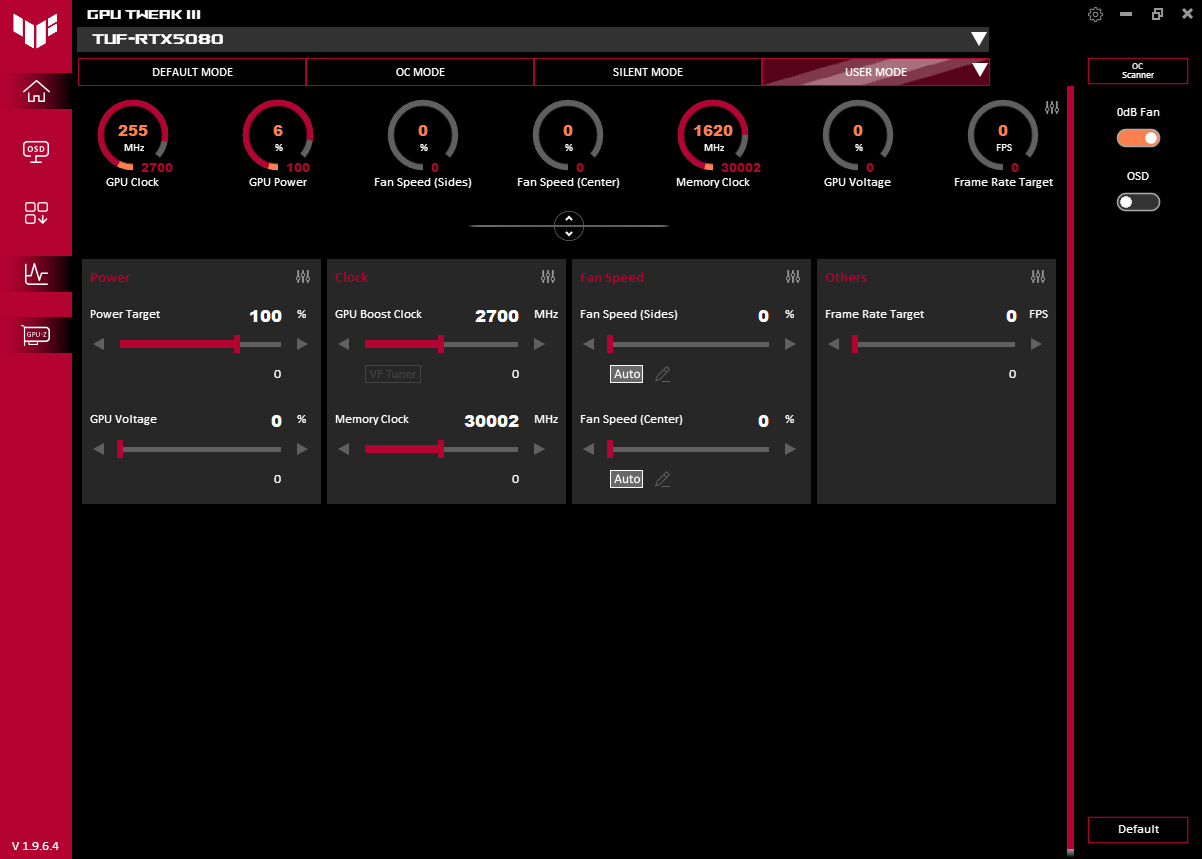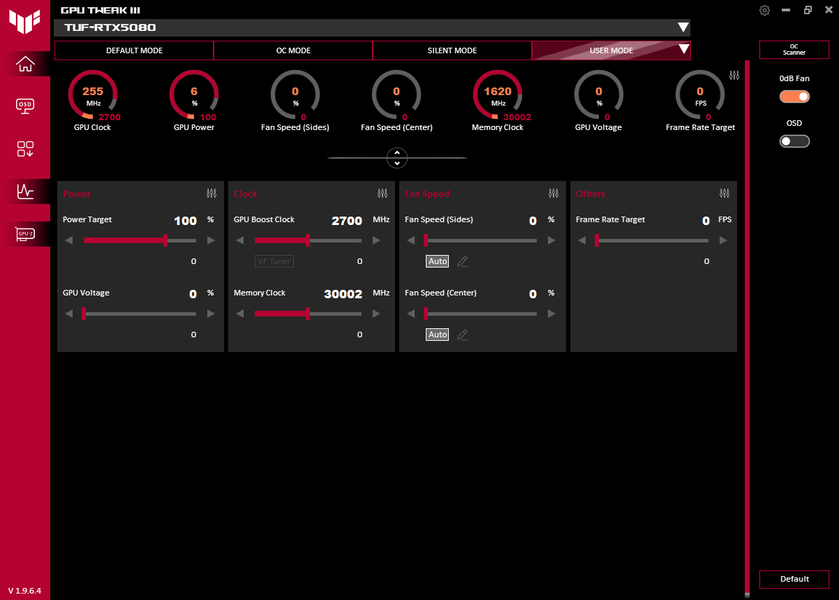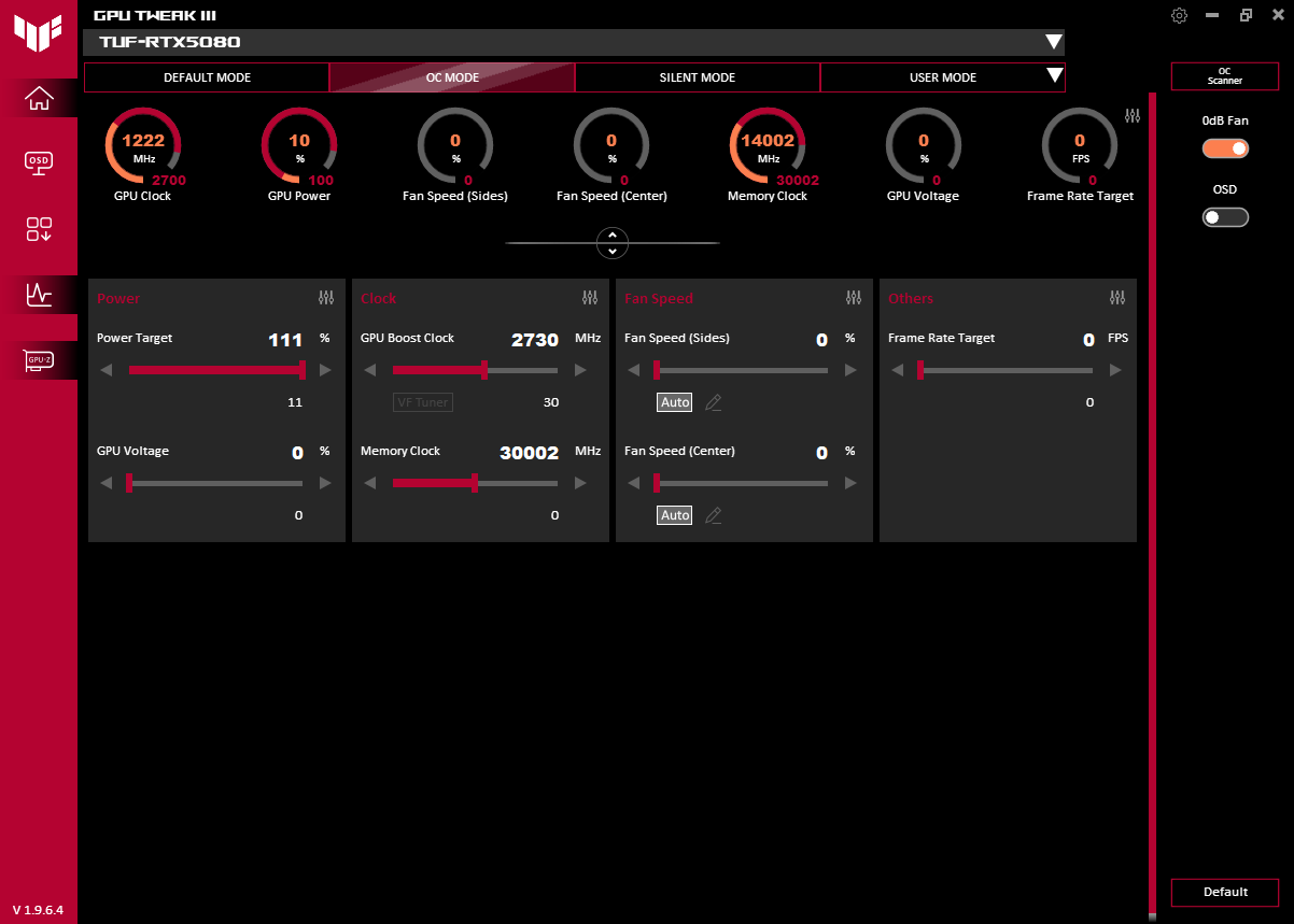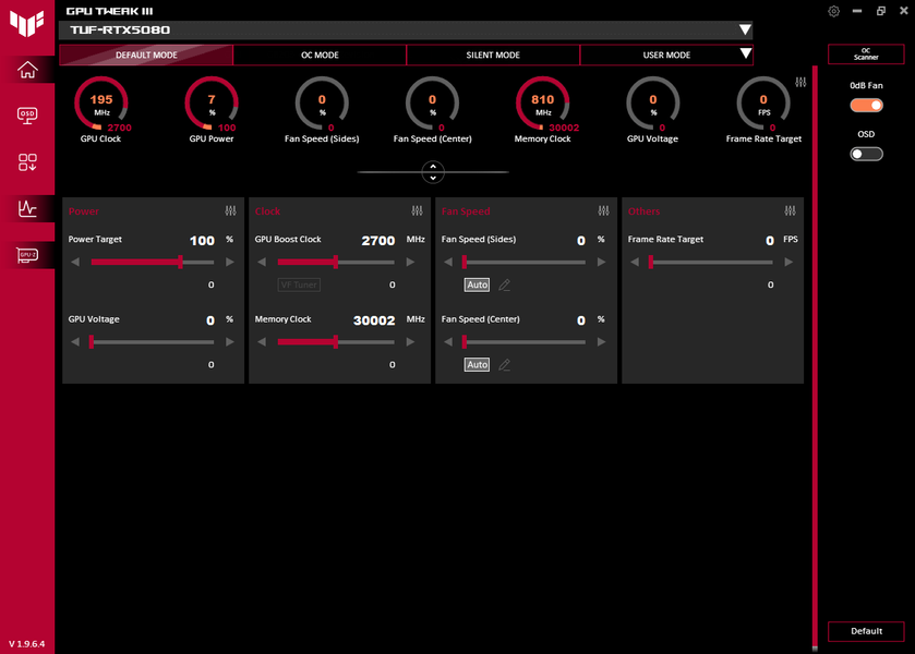 Управление работой карты обеспечивается с помощью фирменной программы Asus GPU Tweak III, мы о ней уже много раз писали: программа предоставляет управление вентиляторами, частотами работы карты и напряжением ядра, слежение за состоянием карты (мониторинг) и многое иное.