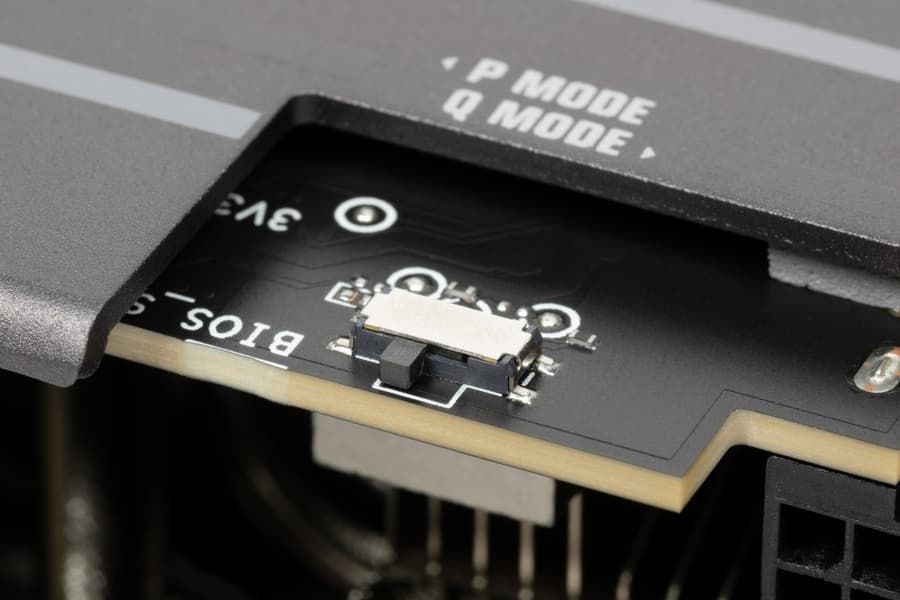 Карта имеет два режима работы, они заложены в двух вариантах BIOS, которые переключаются с помощью переключателя на переднем торце карты: P mode (P — Performance / производительный) и Q mode (Q — Quiet / тихий). Разница между режимами заключается только в настройке работы вентиляторов (предел энергопотребления у BIOS P и BIOS Q — 360 Вт (это номинал для RTX 5080)). В обоих случаях предел потребления можно поднять вручную на 12%.