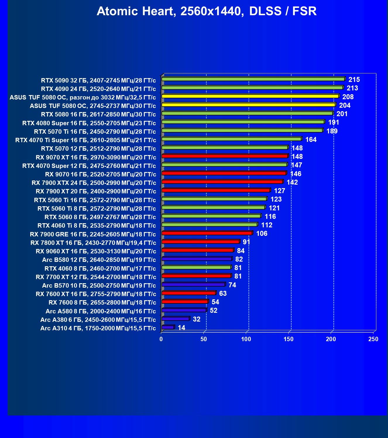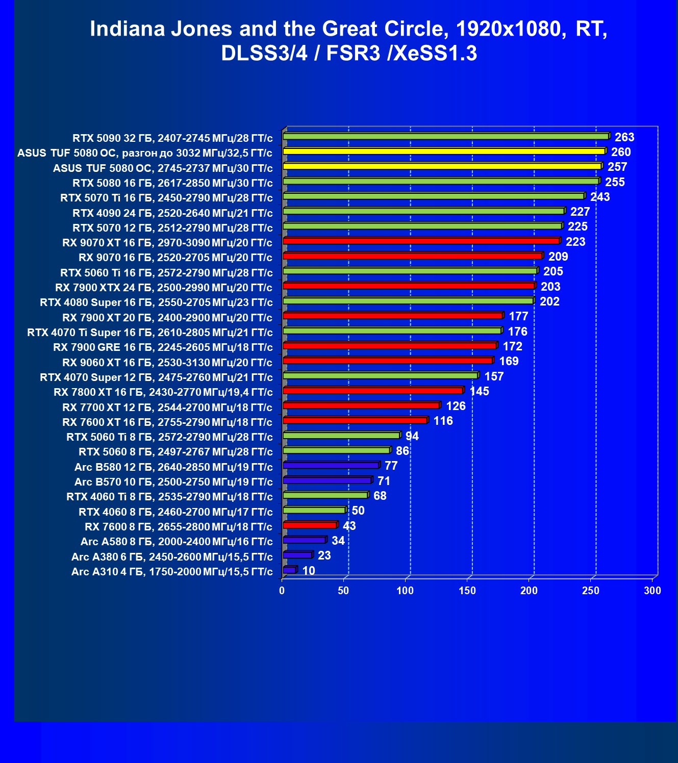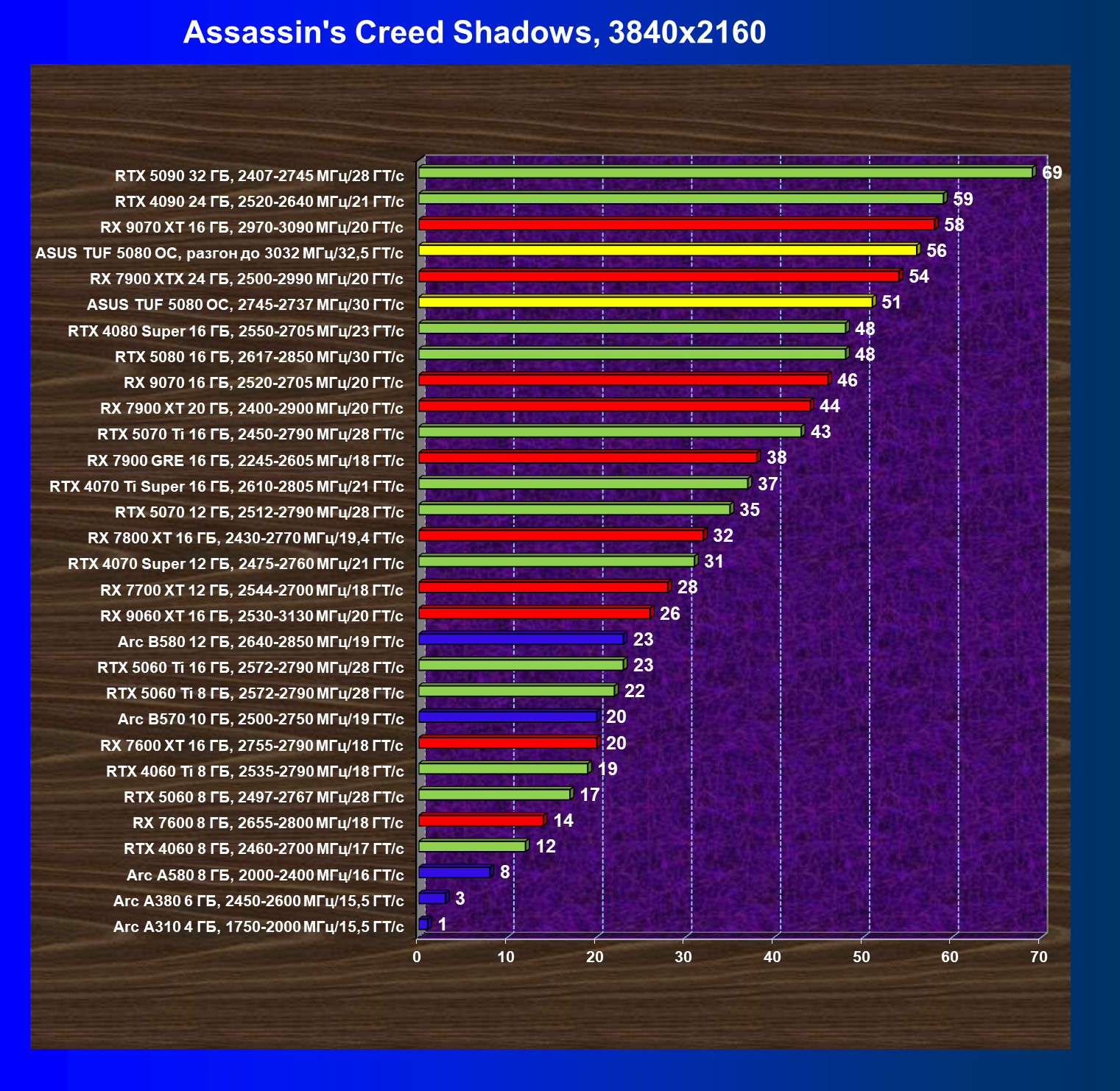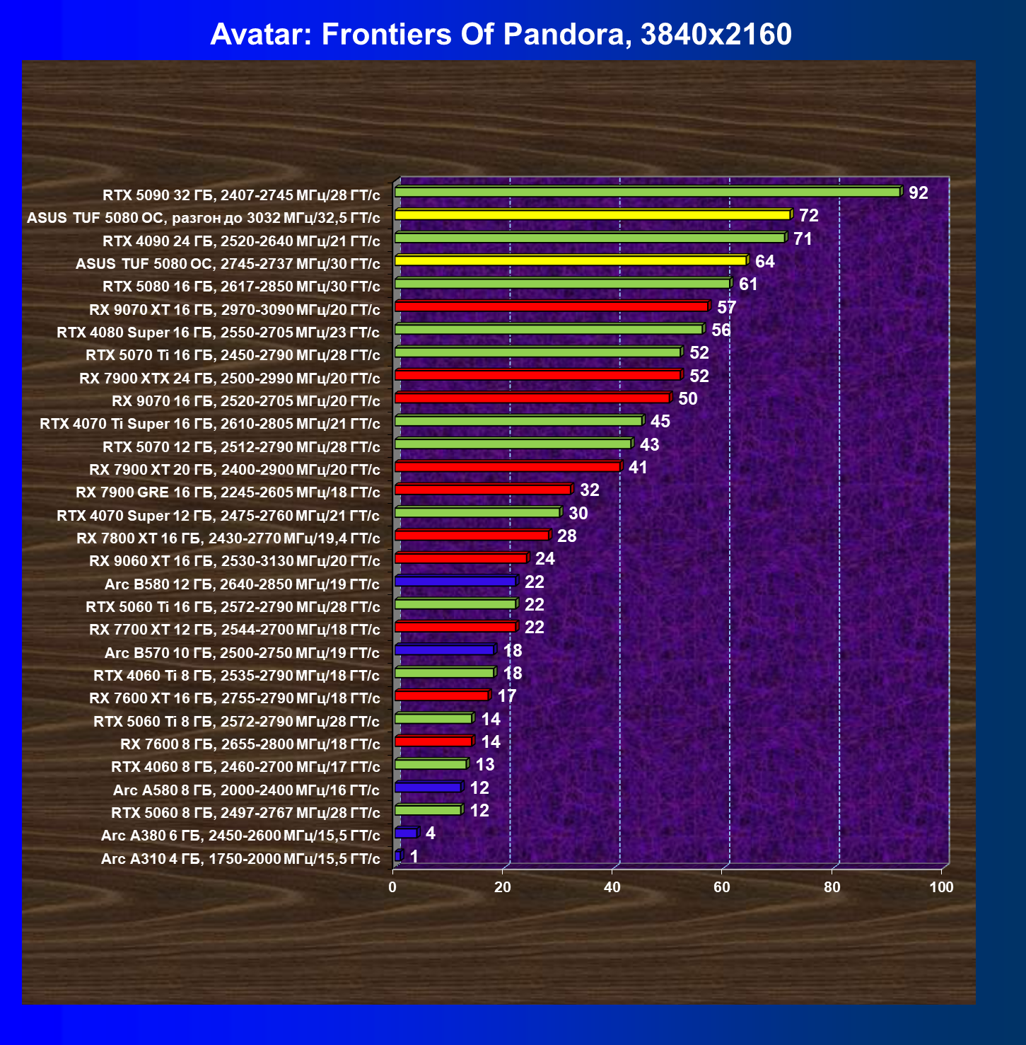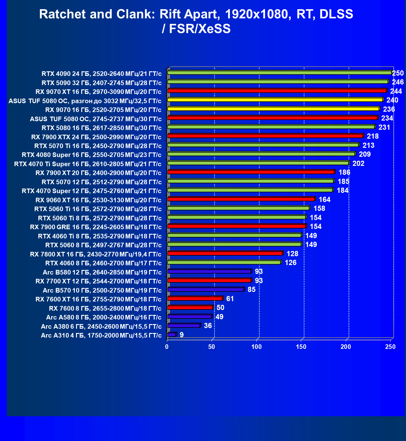 | 05 | RX 9070 XT 16 ГБ, 2970—3090 МГц/20 ГТ/с | 1078 | 7979 | 74 000 |