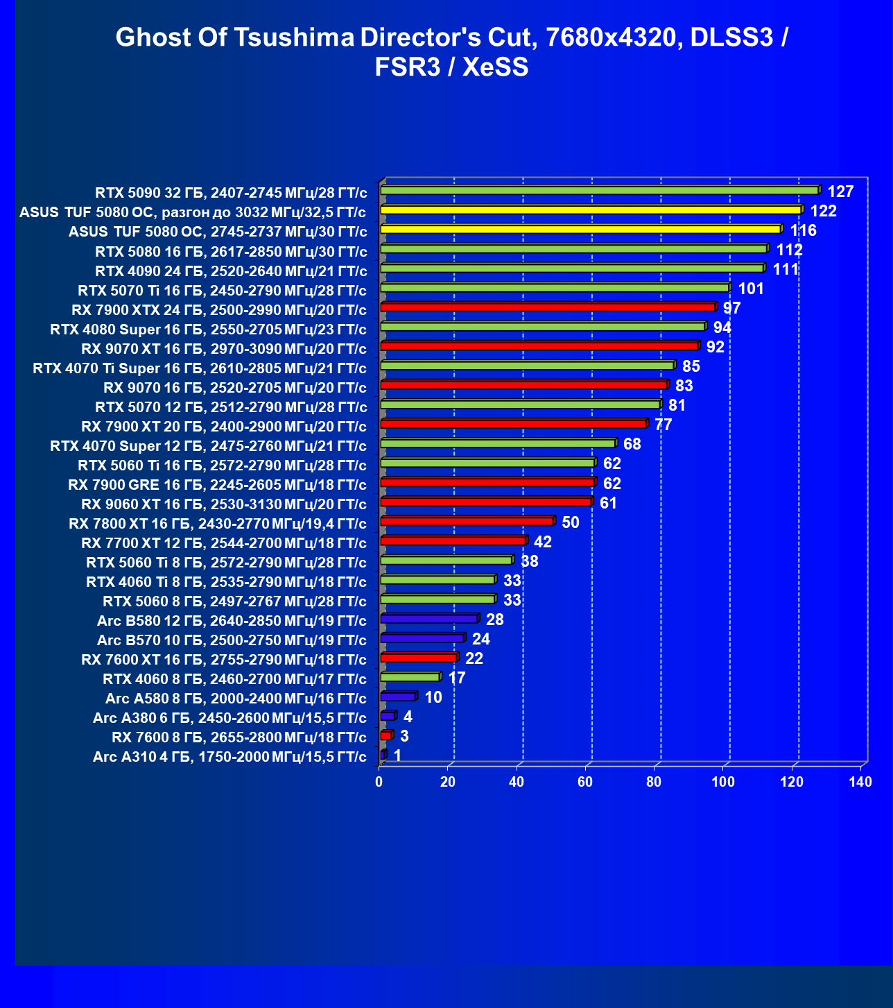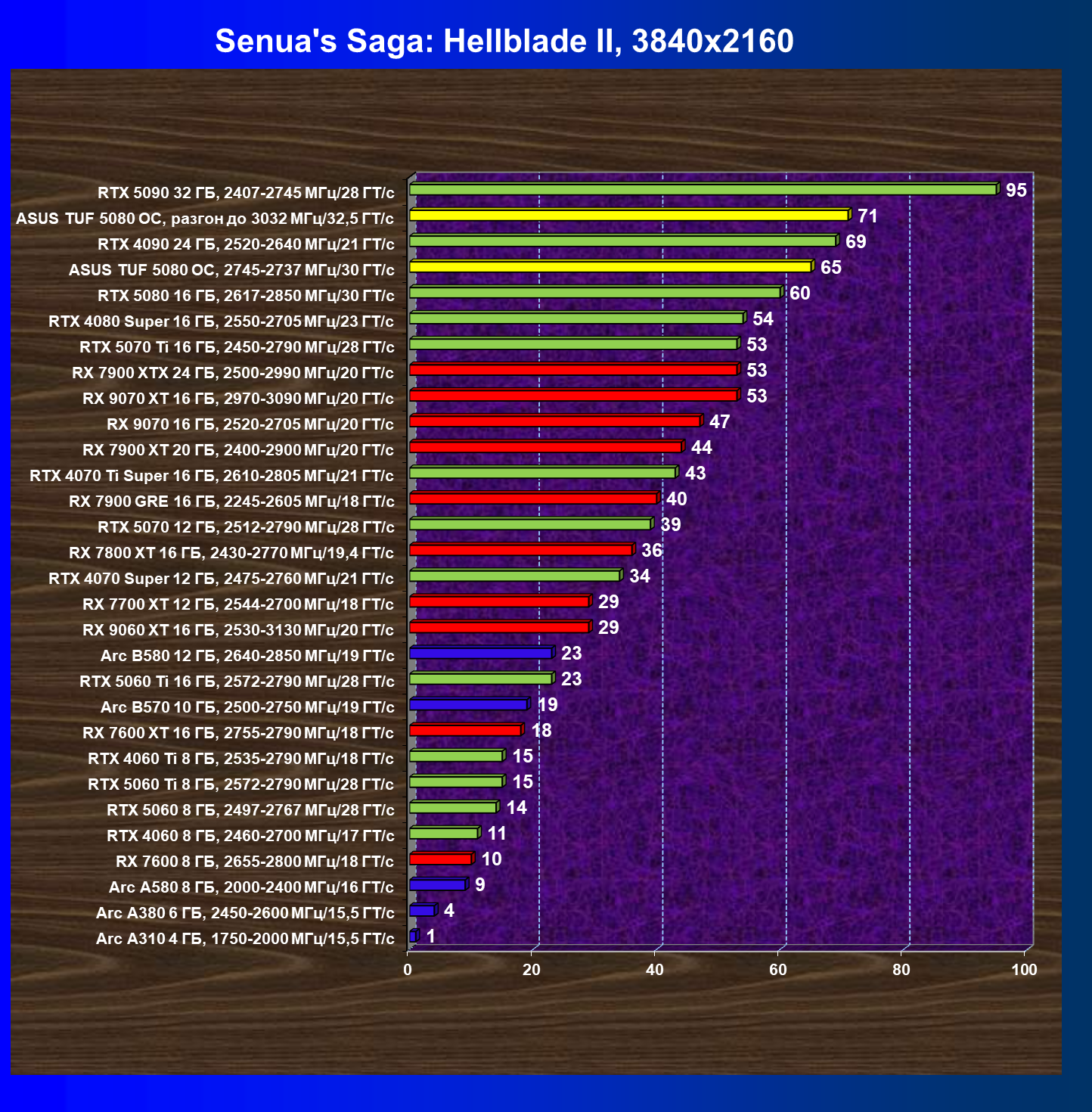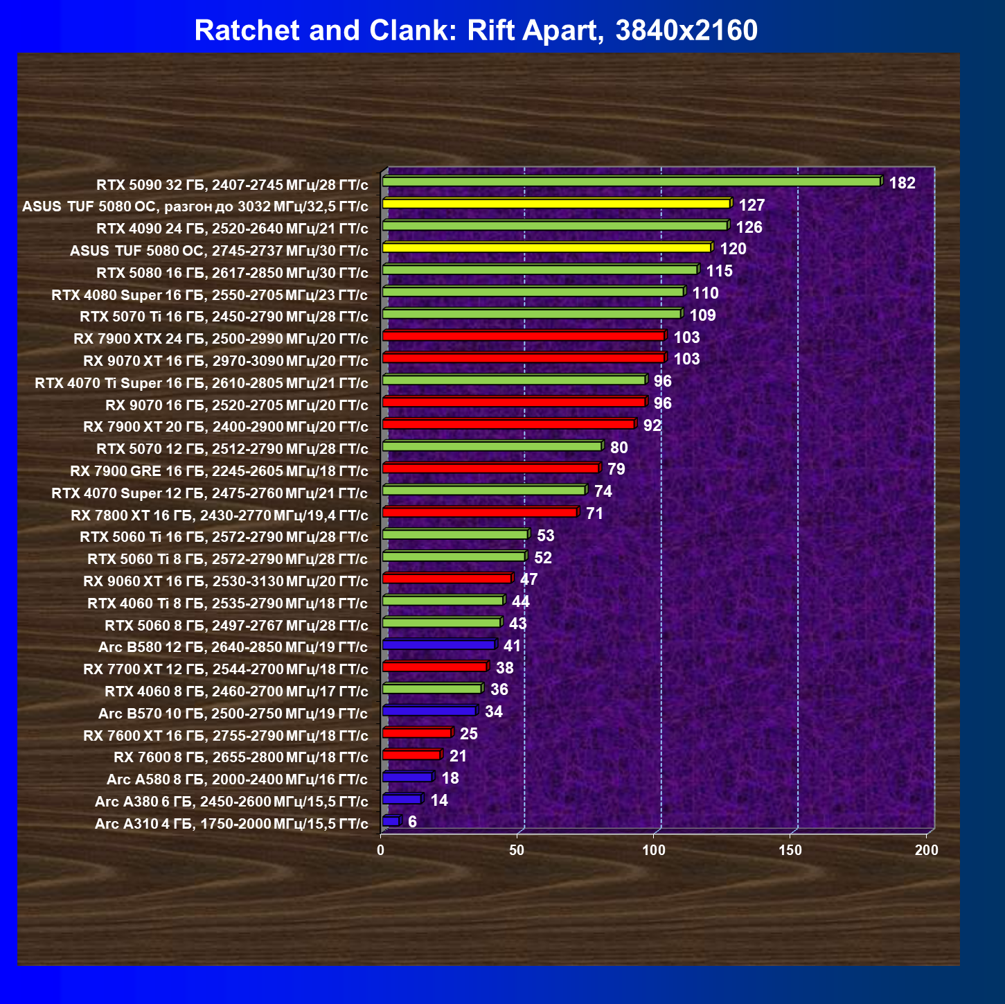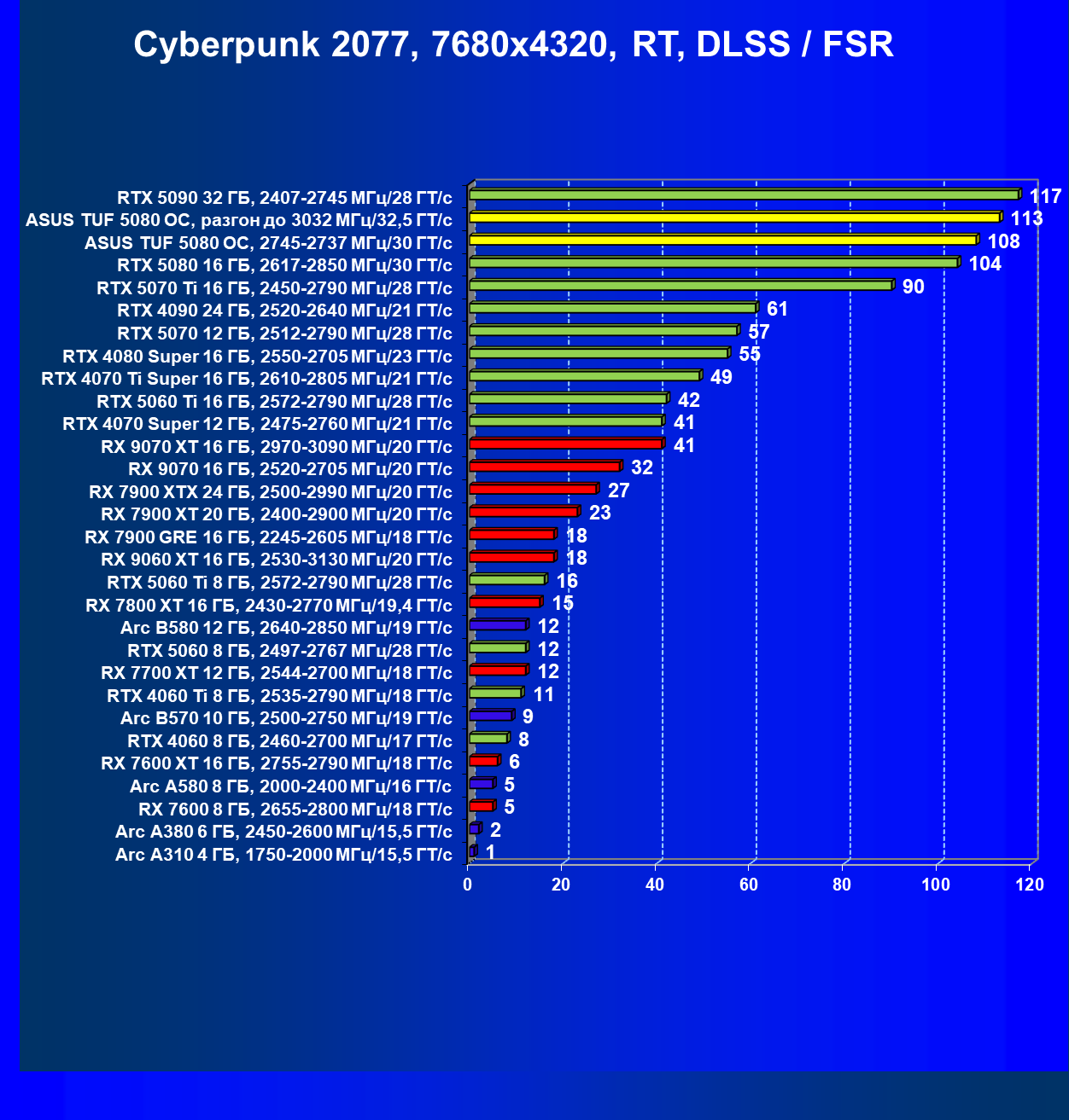 | 17 | RTX 5090 32 ГБ, 2407—2745 МГц/28 ГТ/с | 649 | 17013 | 262 000 |