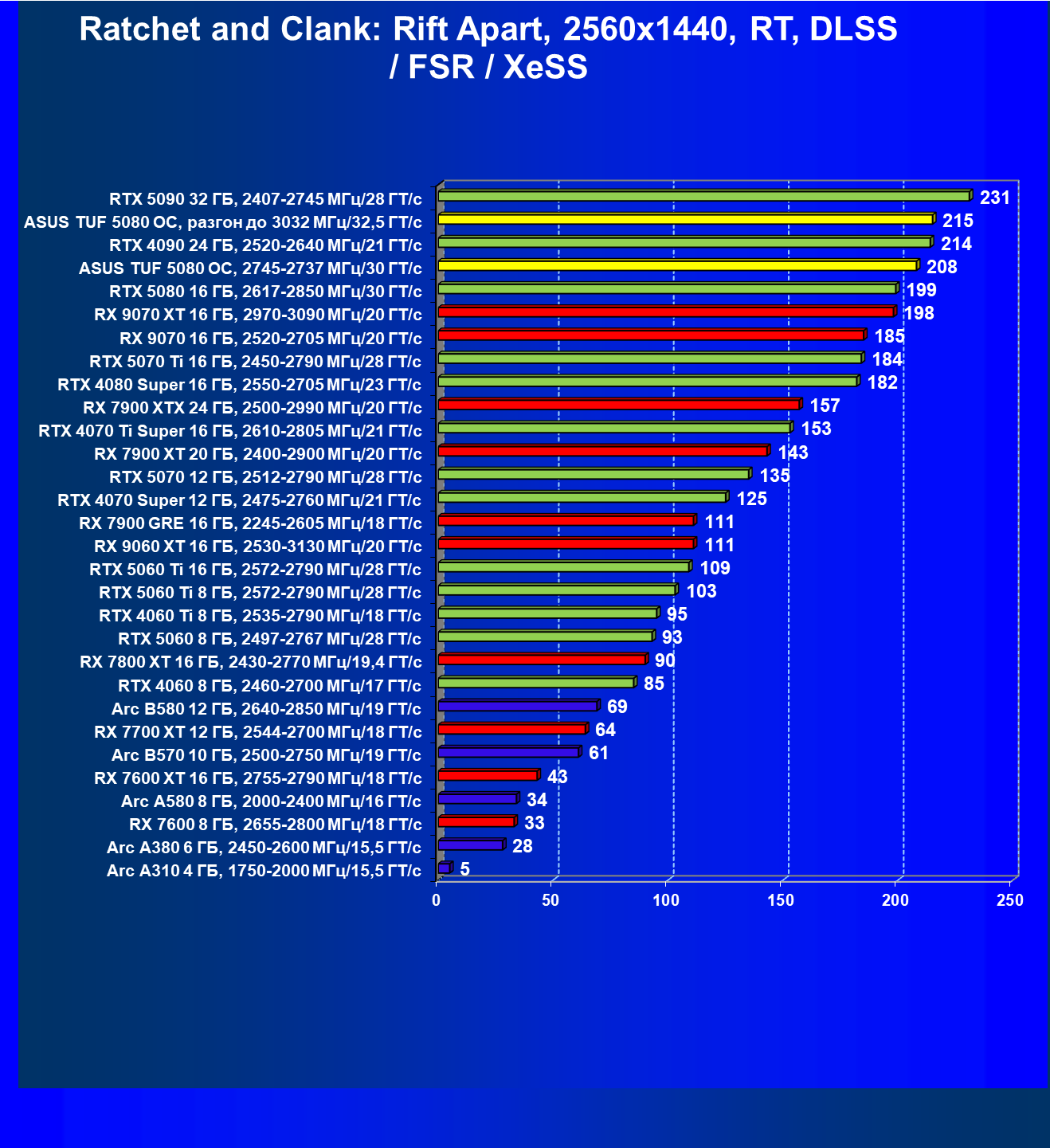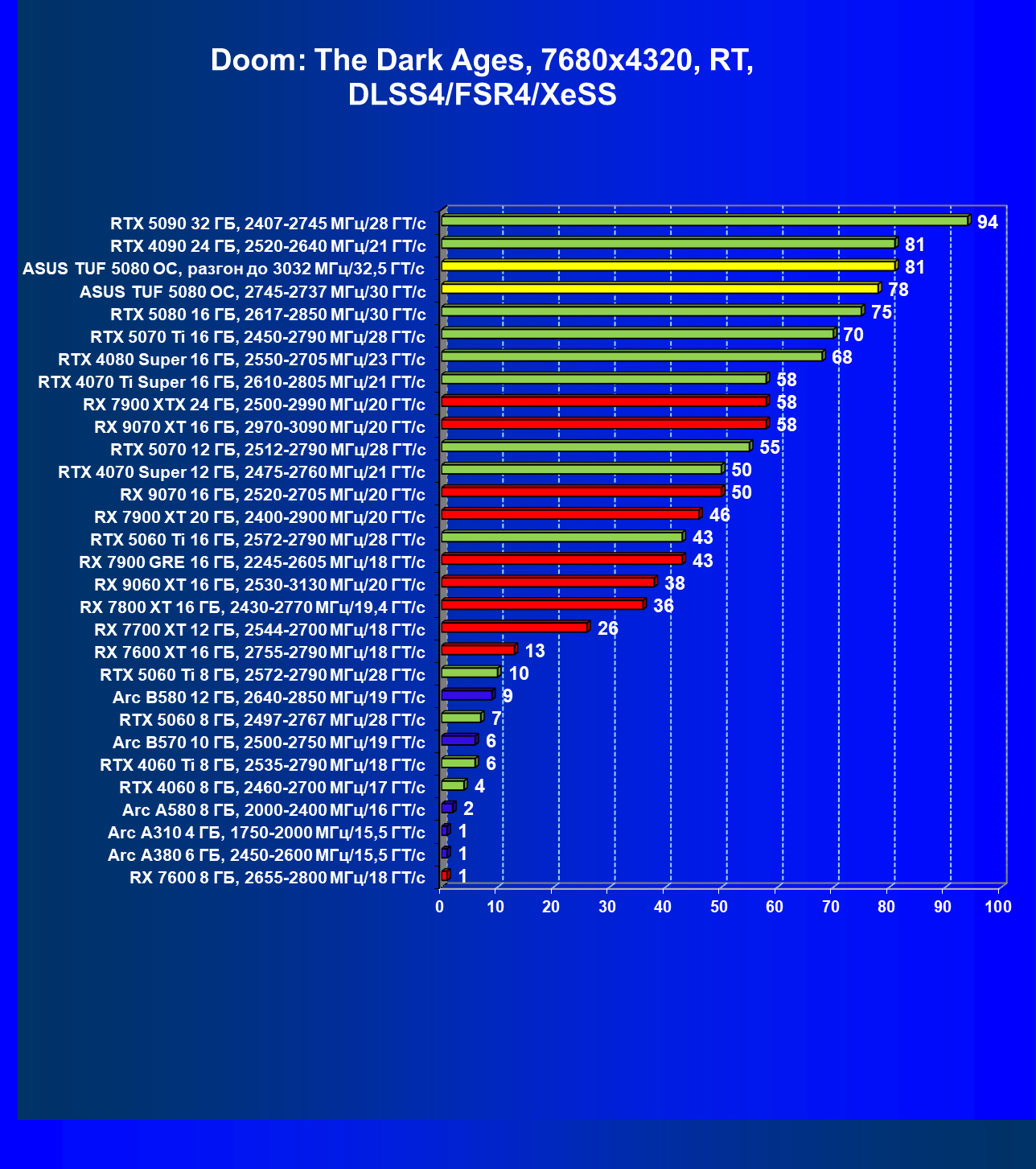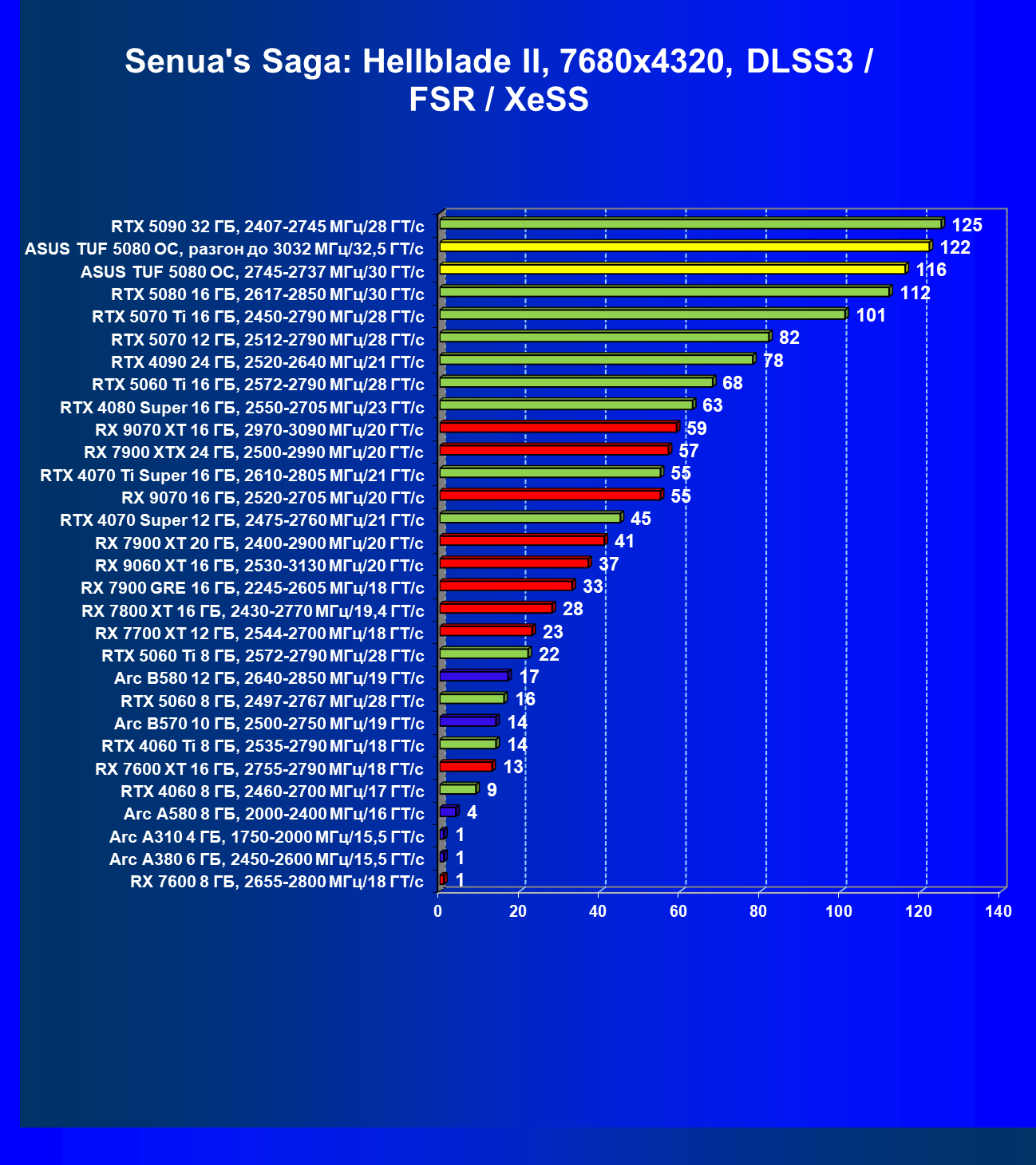 | 17 | RTX 5090 32 ГБ, 2407—2745 МГц/28 ГТ/с | 649 | 17013 | 262 000 |