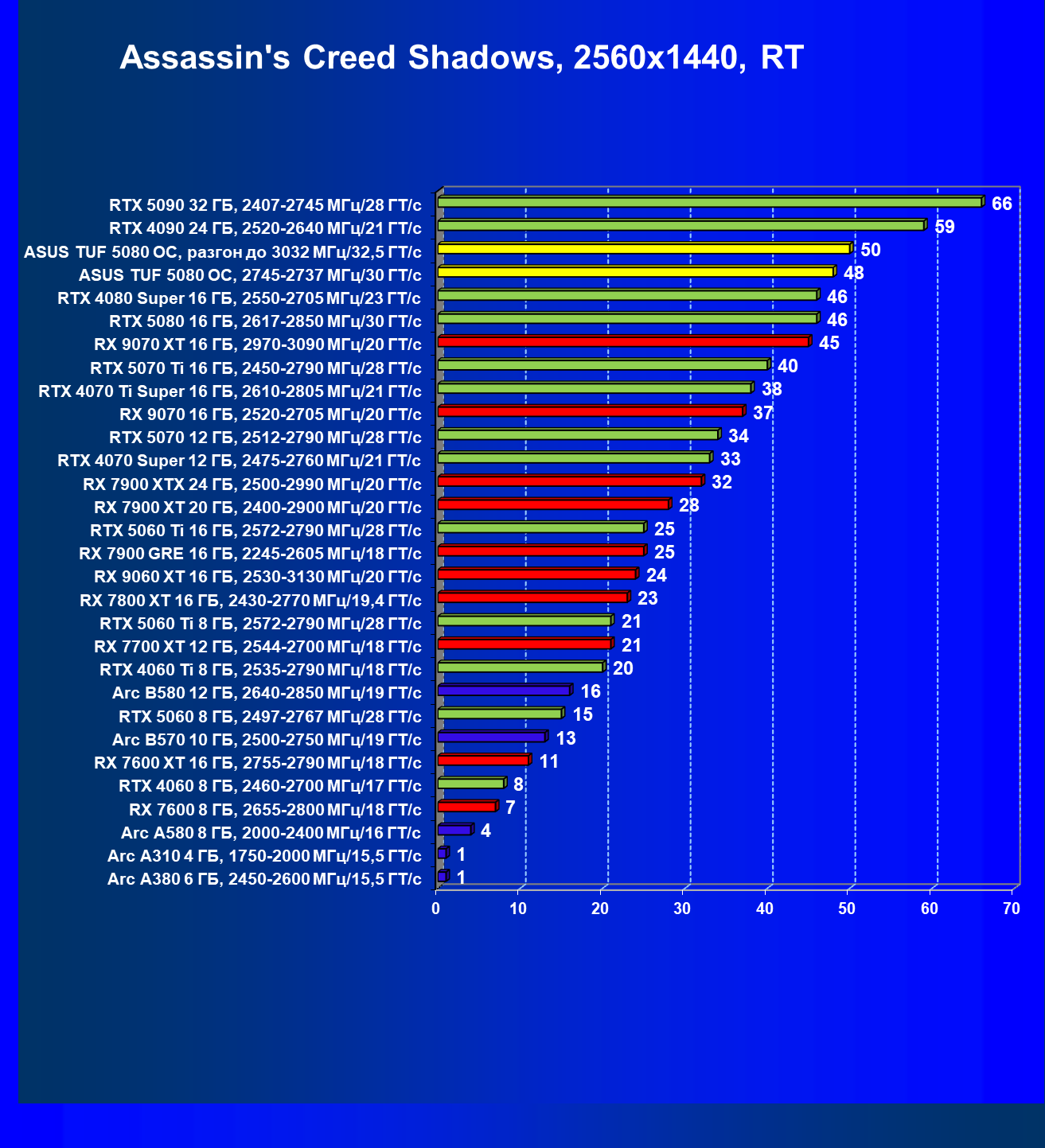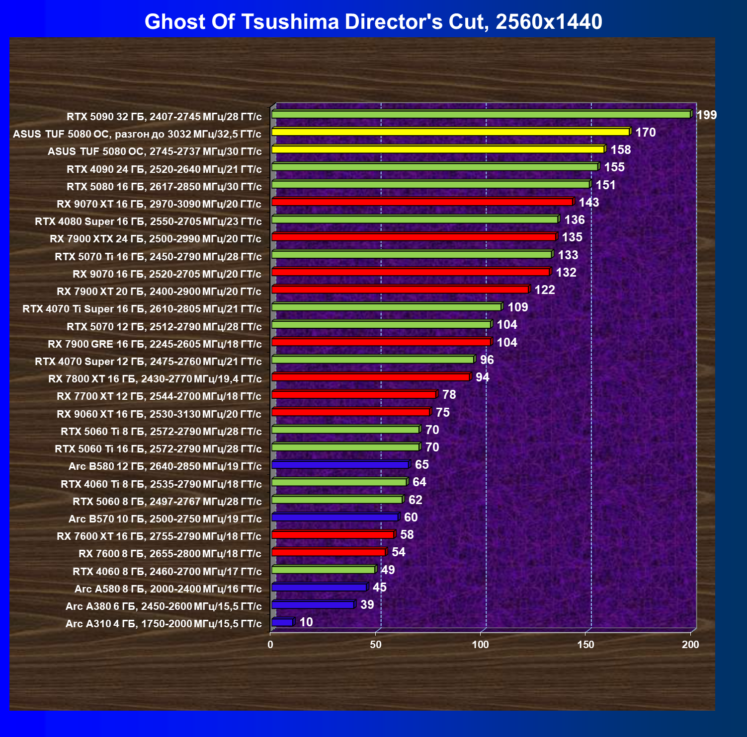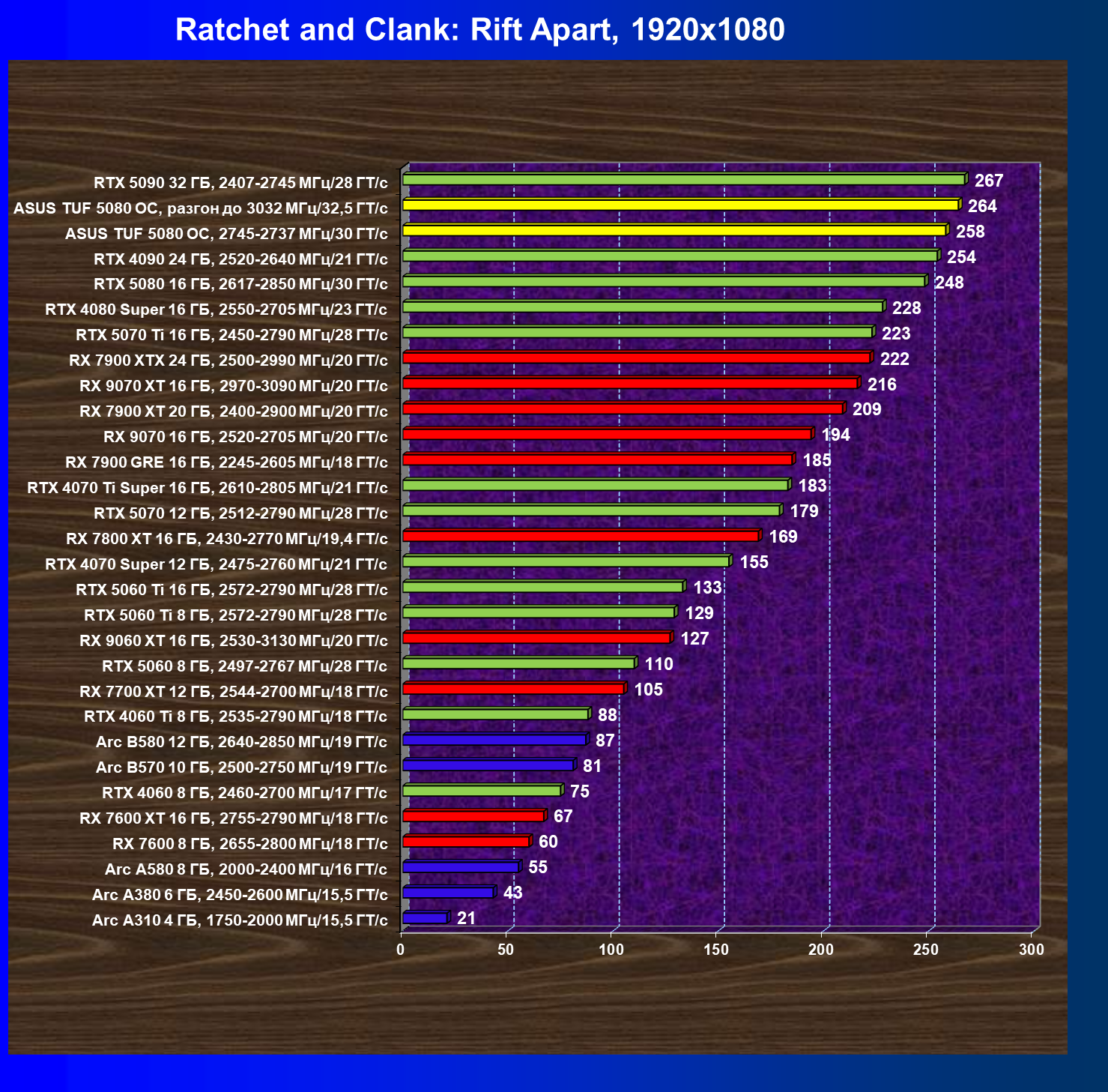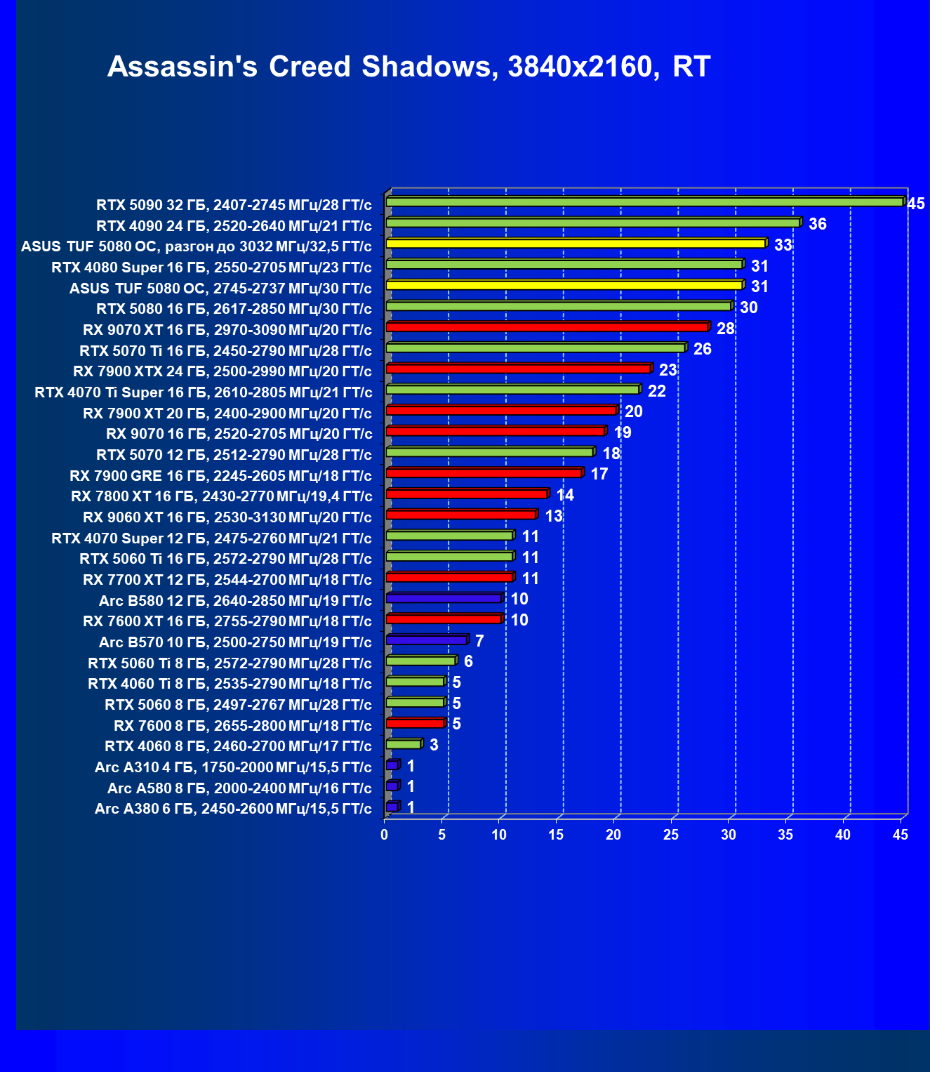 | 17 | RTX 5090 32 ГБ, 2407—2745 МГц/28 ГТ/с | 649 | 17013 | 262 000 |