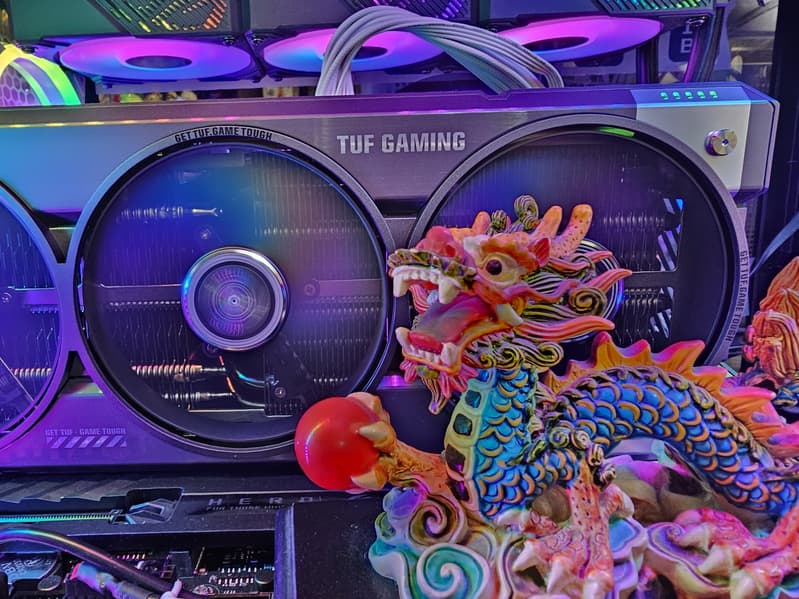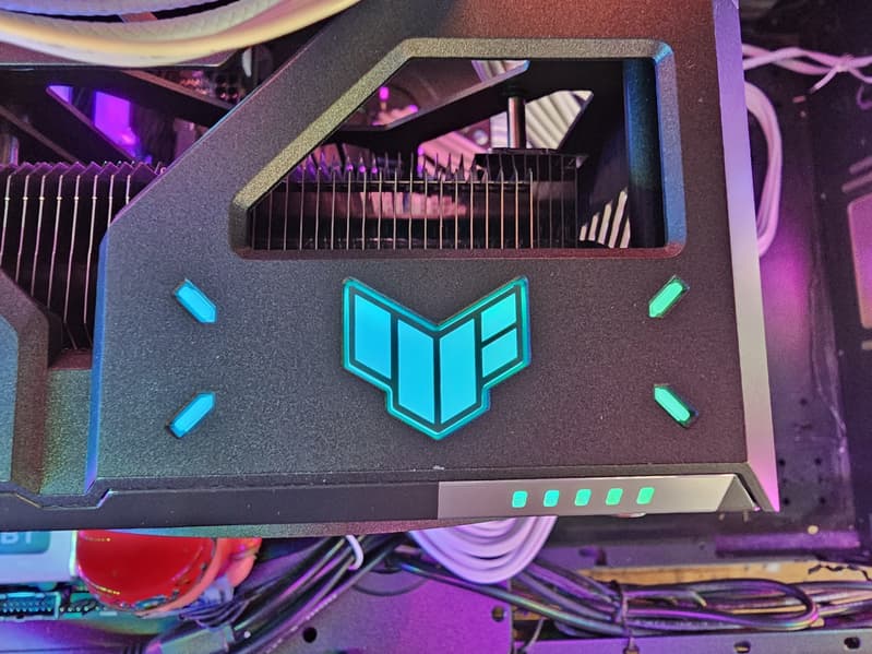 Карта способна потреблять около 350 Вт, а при разгоне — чуть больше. Ручной разгон может обеспечить прирост скорости до 8,5% в разрешении 4K, однако карта и по умолчанию имеет повышенные частоты работы, демонстрируя на 3,5% более высокую производительность, чем референсная. Набор видеовыходов стандартный: 3 DP 2.1b и 1 HDMI 2.1b. Карта обладает скромной подсветкой (как у всех моделей семейства TUF Gaming), которую можно синхронизировать с материнскими платами Asus через приложение Asus Armoury Crate.