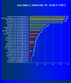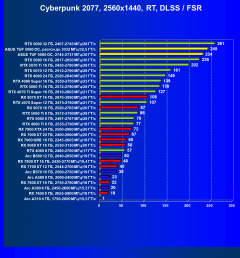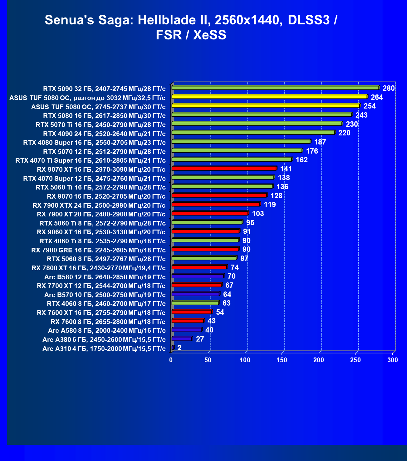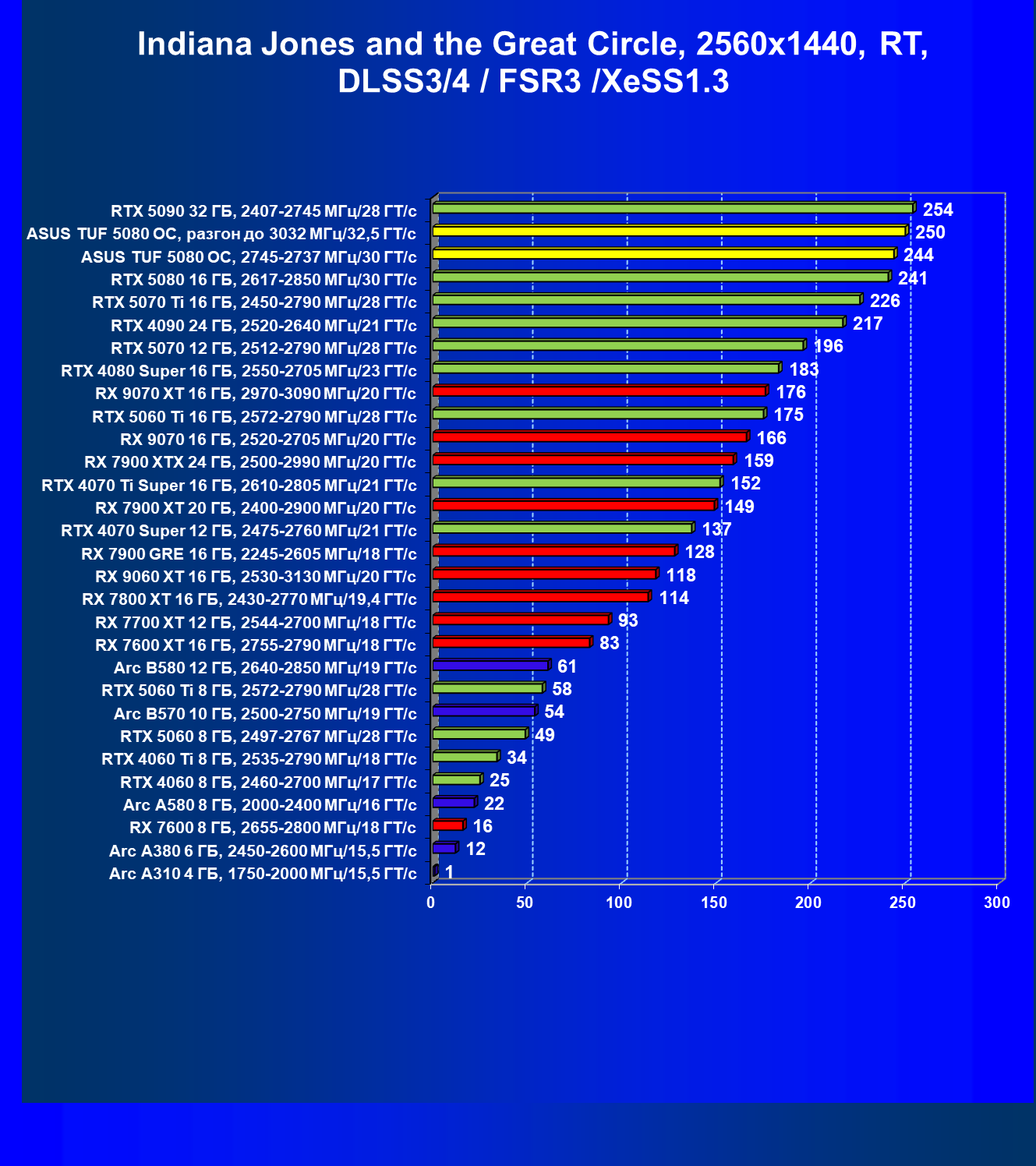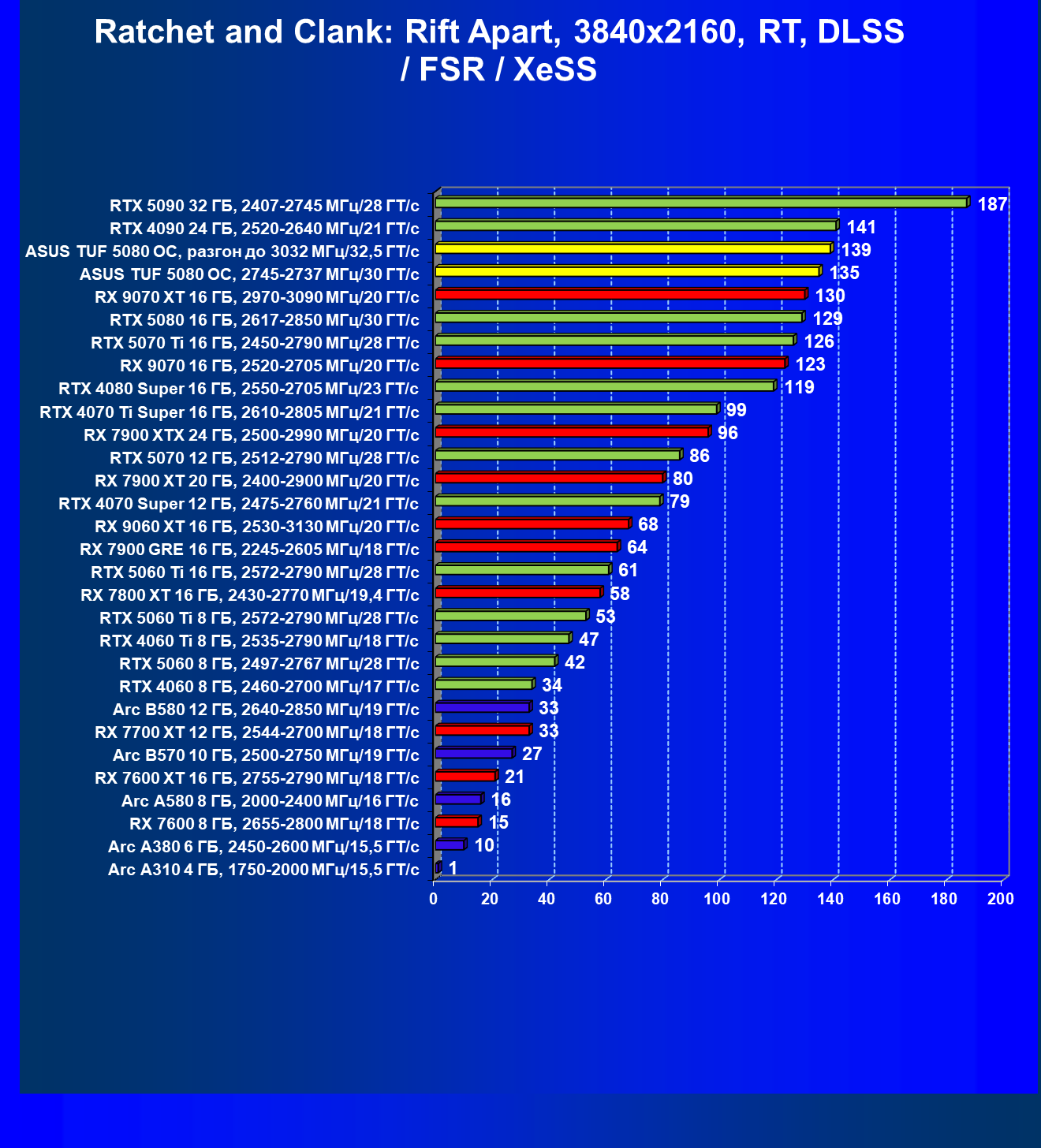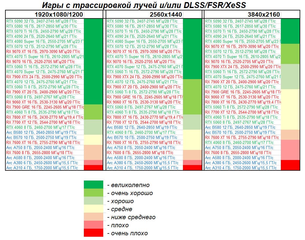 - Результаты тестов со включенной аппаратной трассировкой лучей и/или DLSS/FSR/XeSS в разрешениях 1920×1080, 2560×1440 и 3840×2160