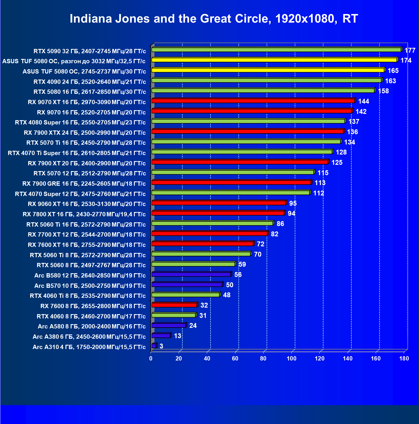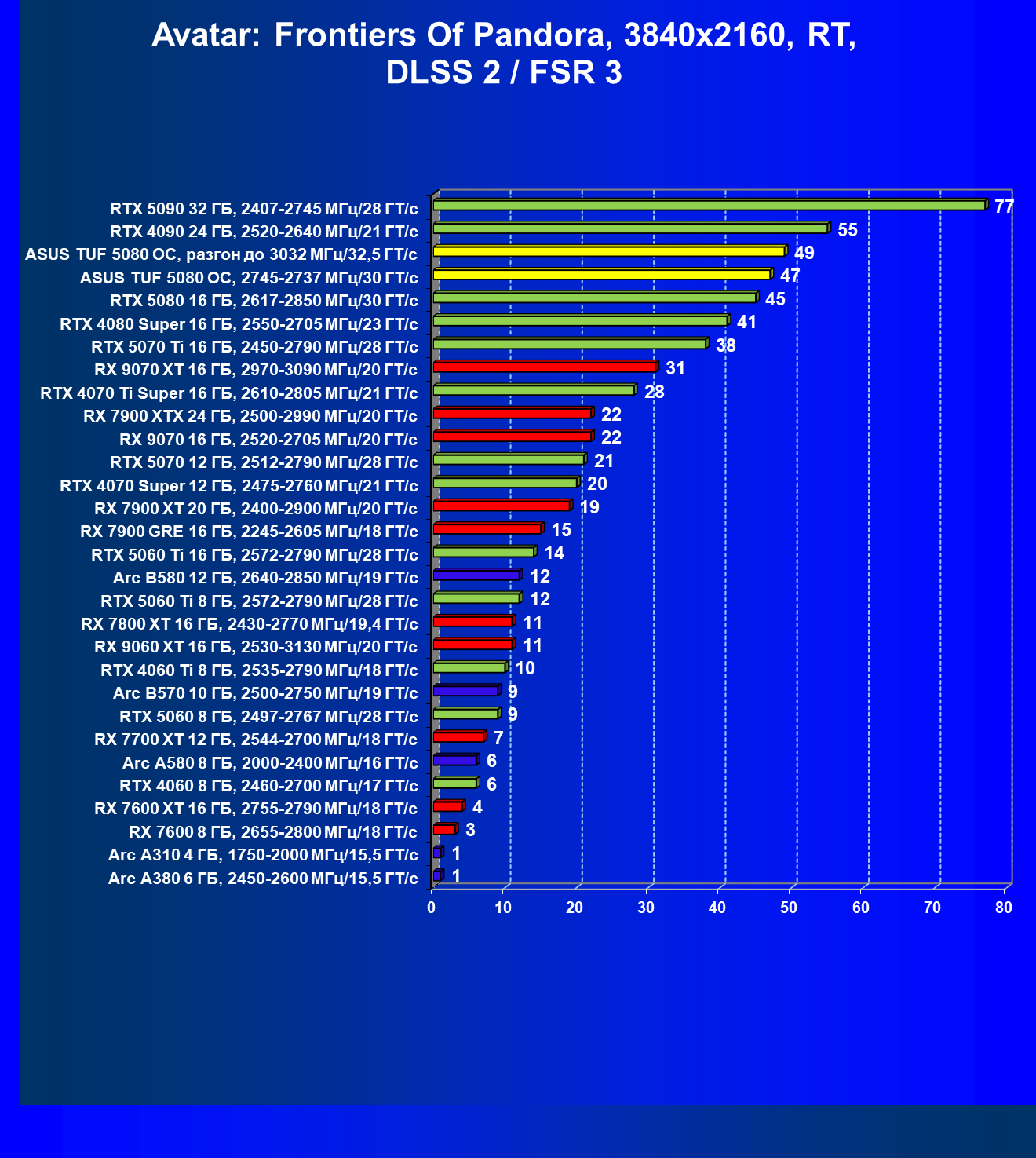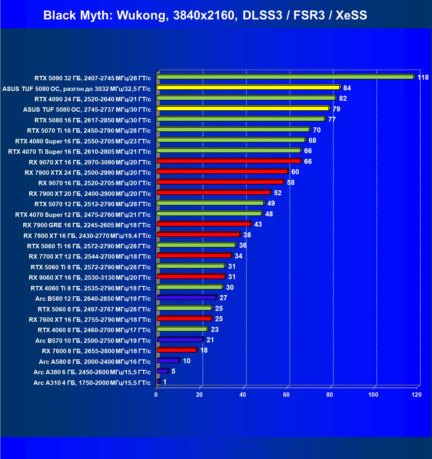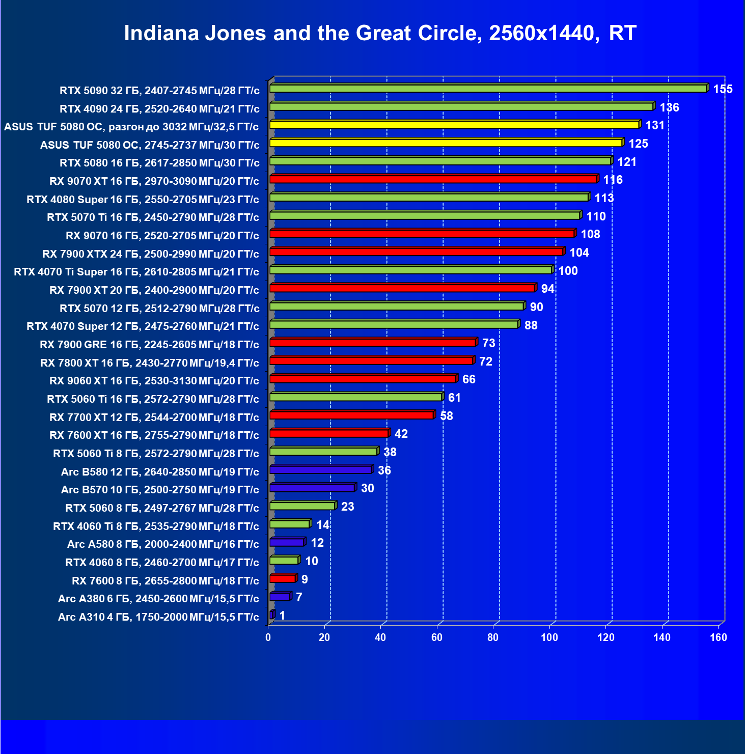 | 14 | Asus TUF 5080 OC, разгон до 3210 МГц/33,7 ГТ/с | 510 | 6380 | 125 000 |