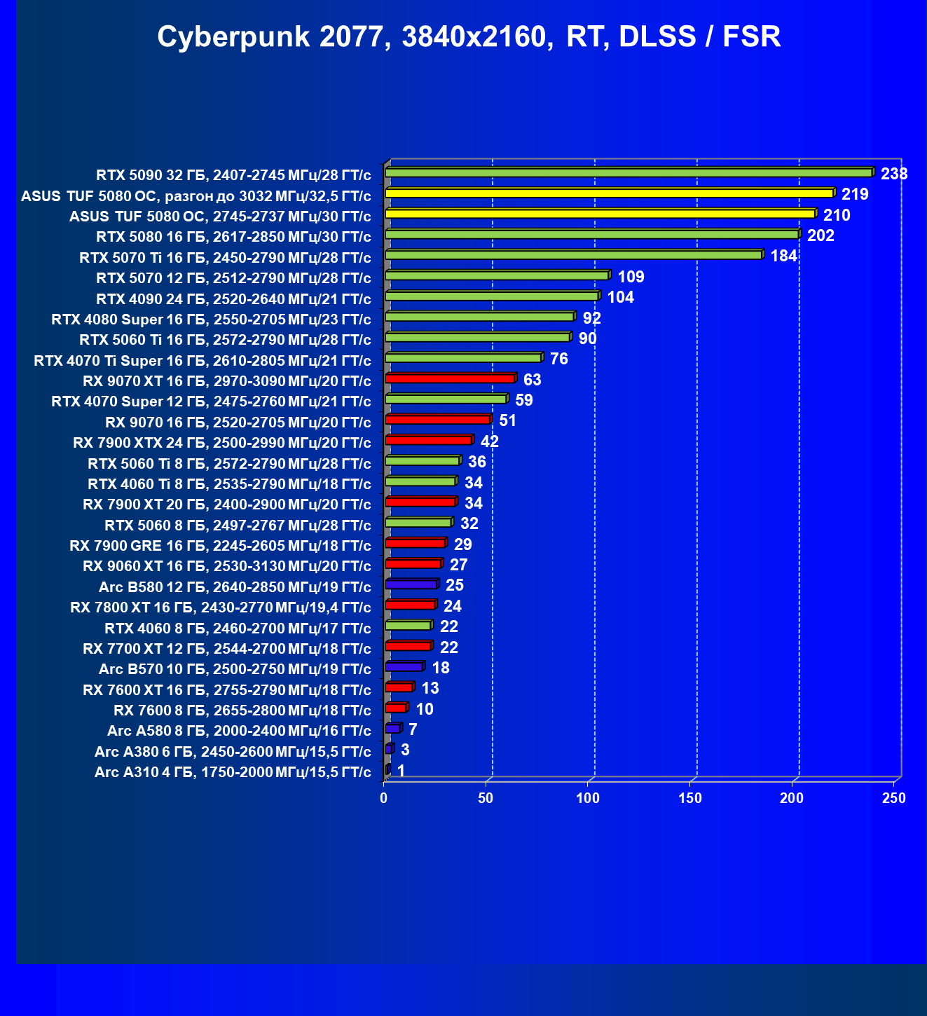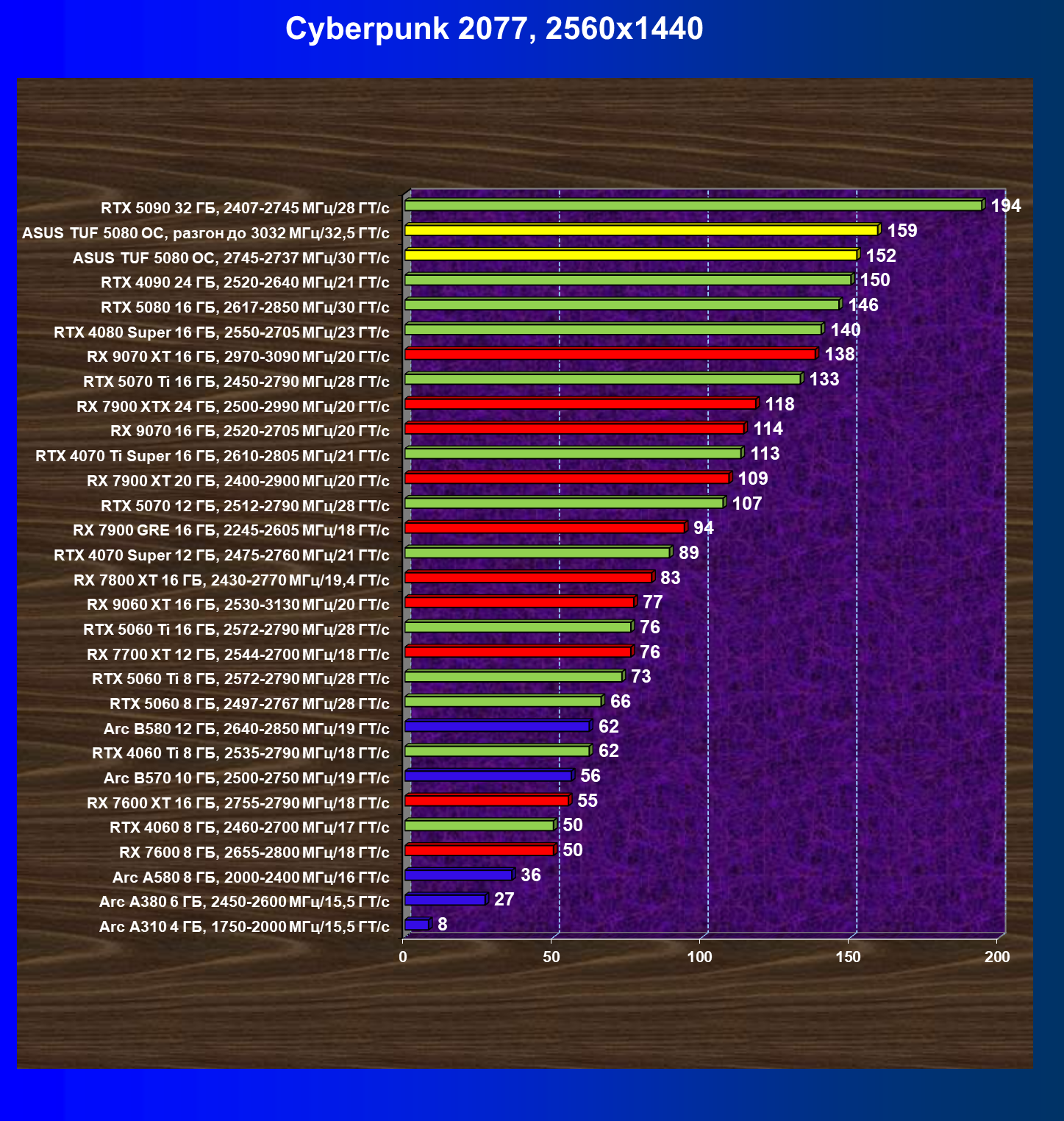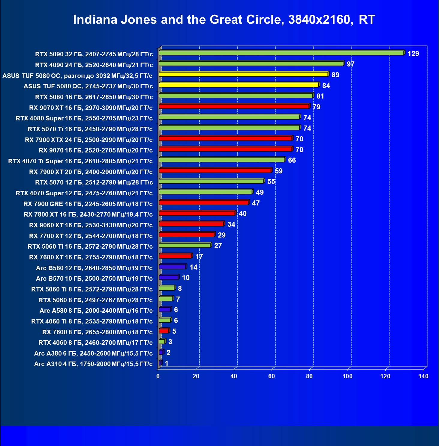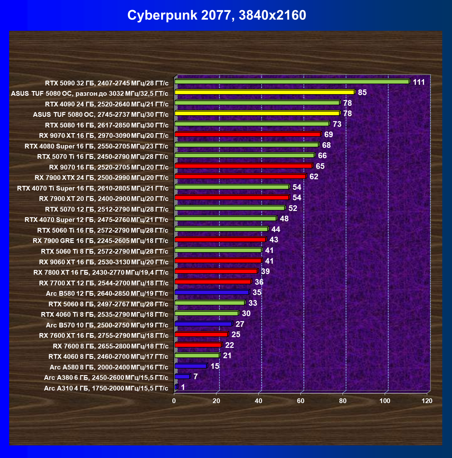| 14 | Asus TUF 5080 OC, разгон до 3210 МГц/33,7 ГТ/с | 510 | 6380 | 125 000 |