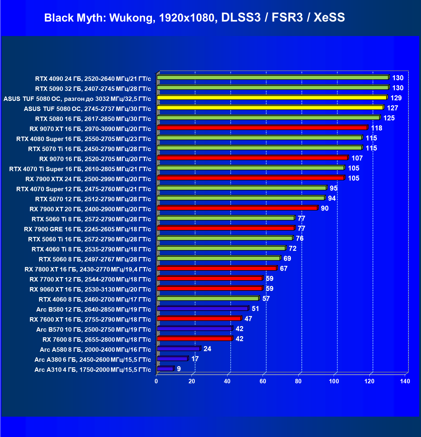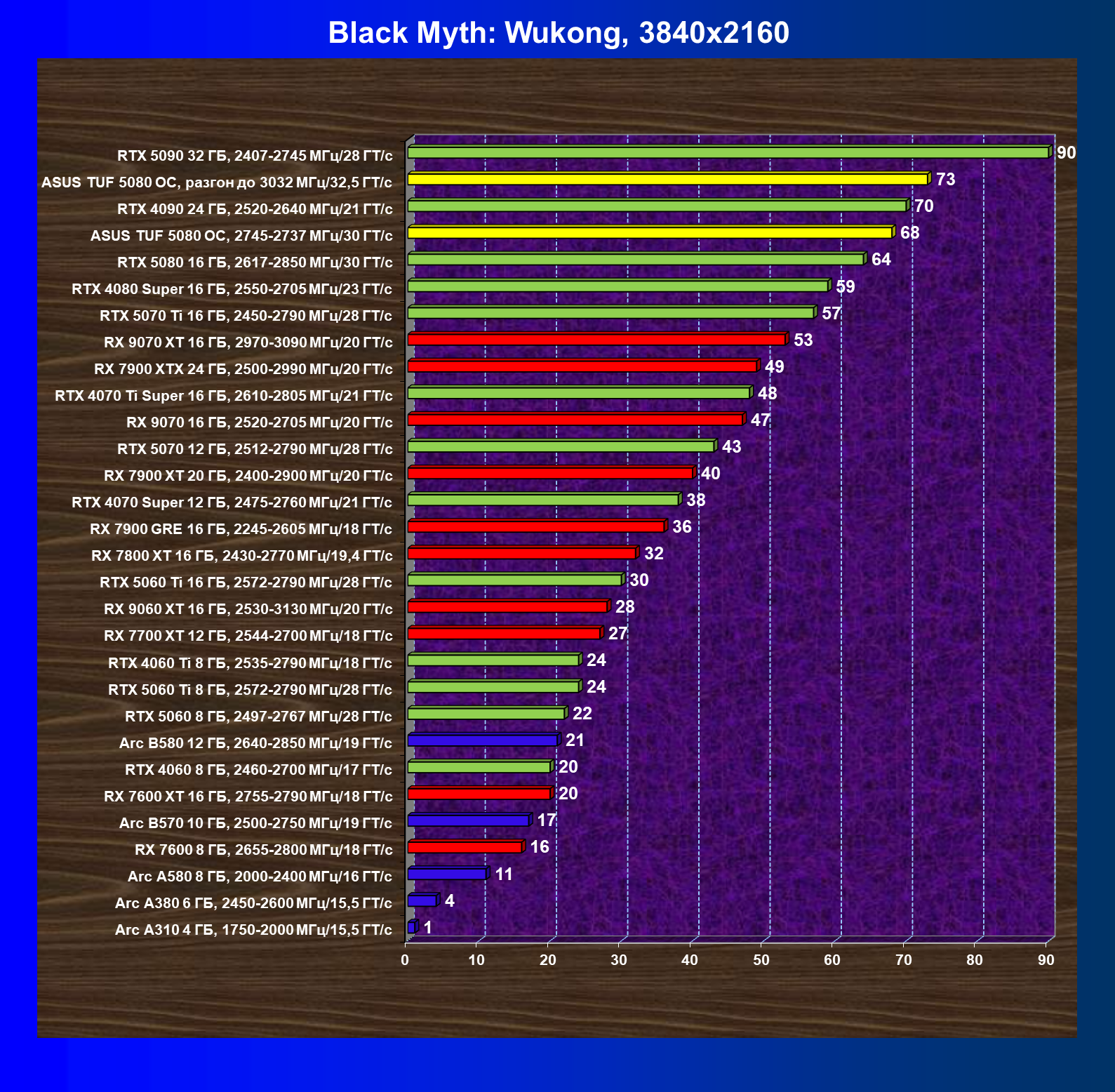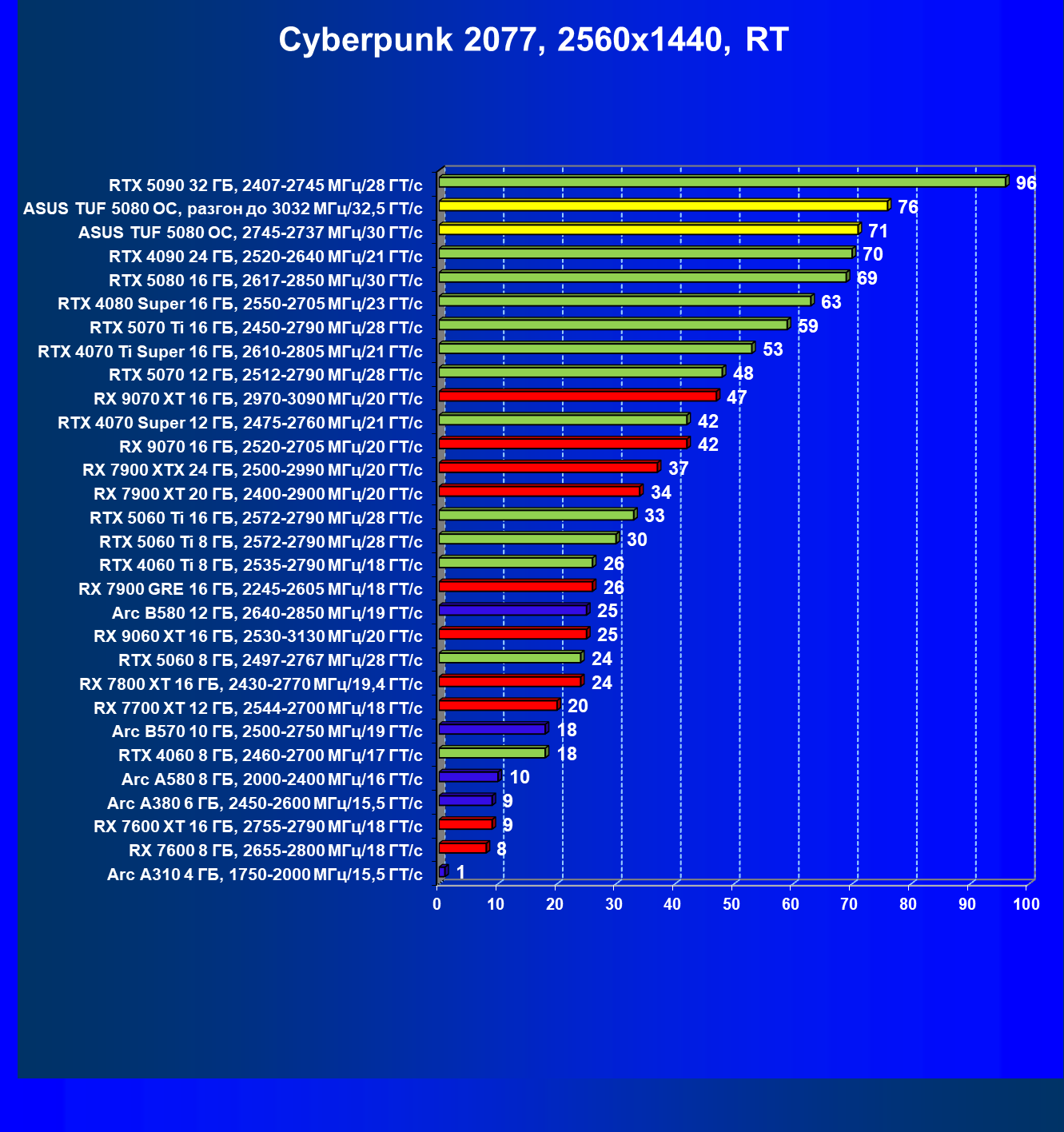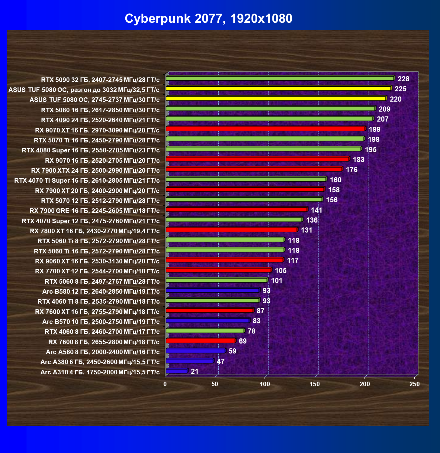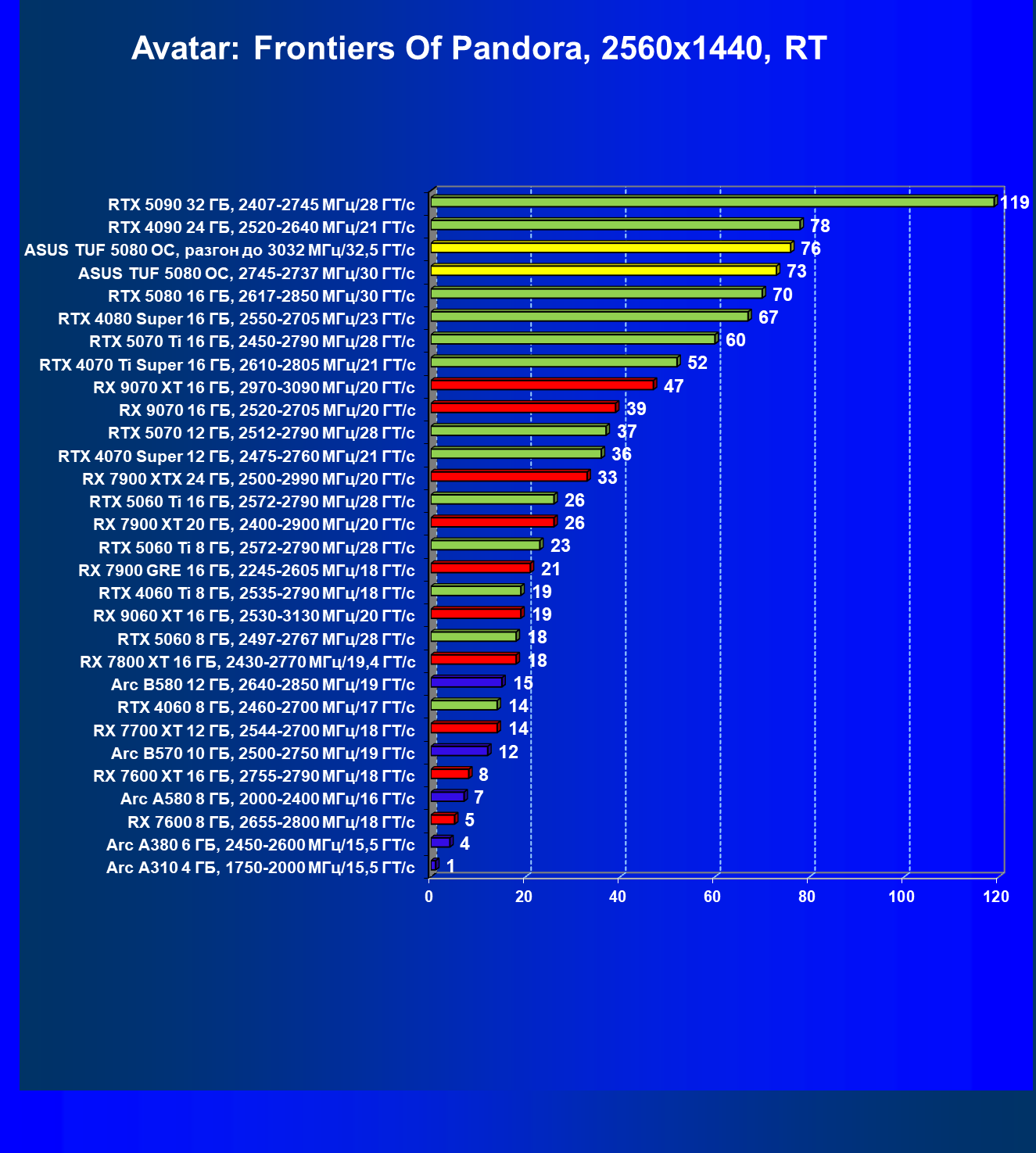 | 14 | Asus TUF 5080 OC, разгон до 3210 МГц/33,7 ГТ/с | 510 | 6380 | 125 000 |