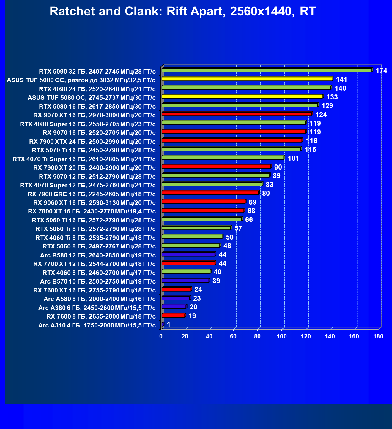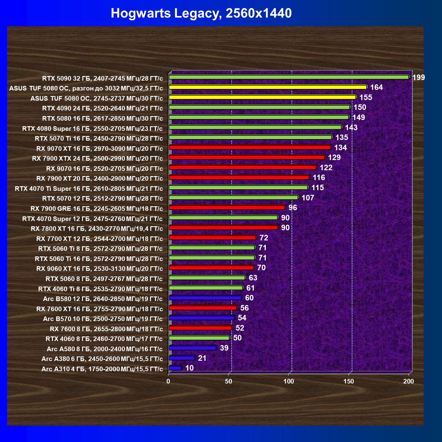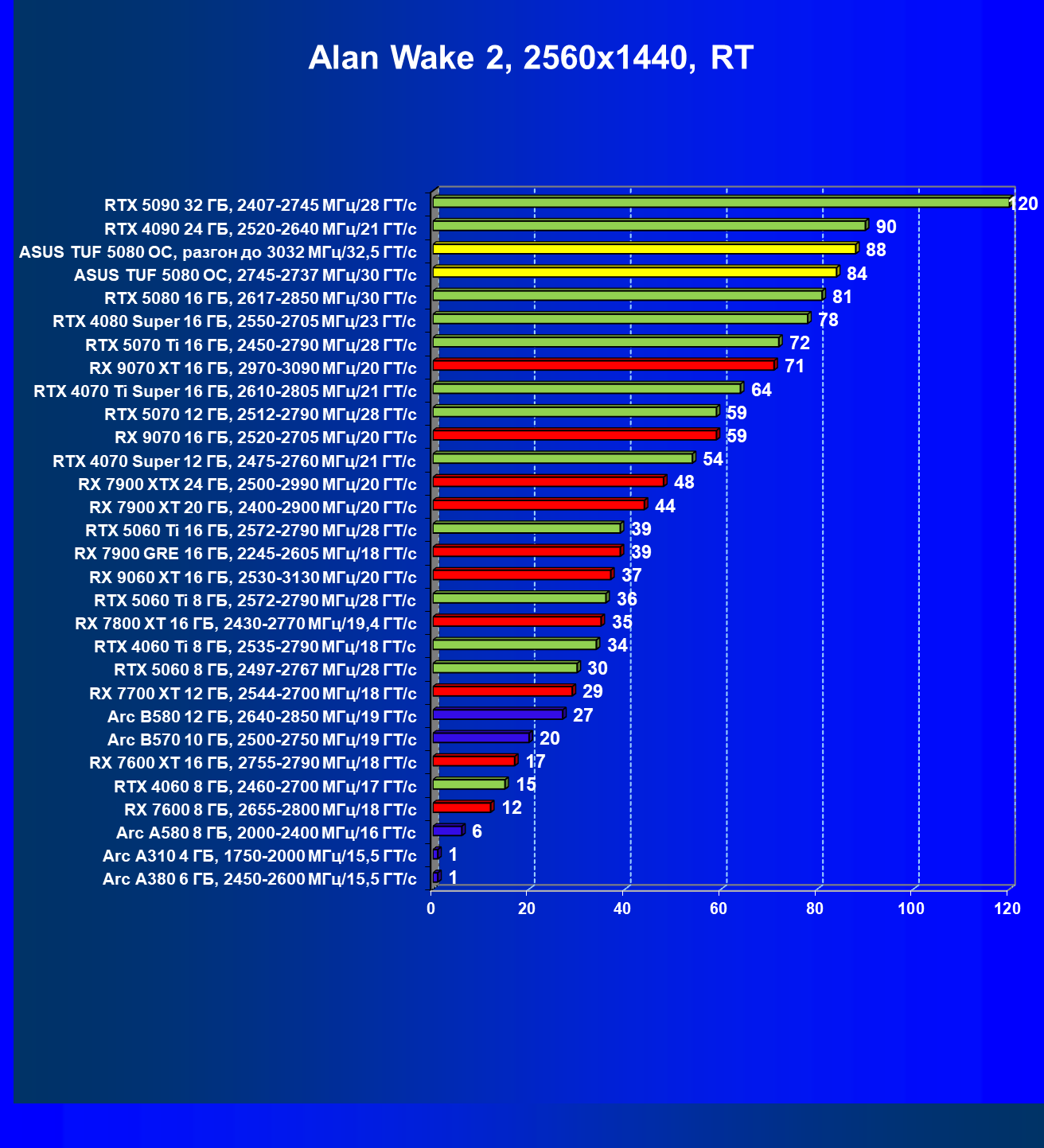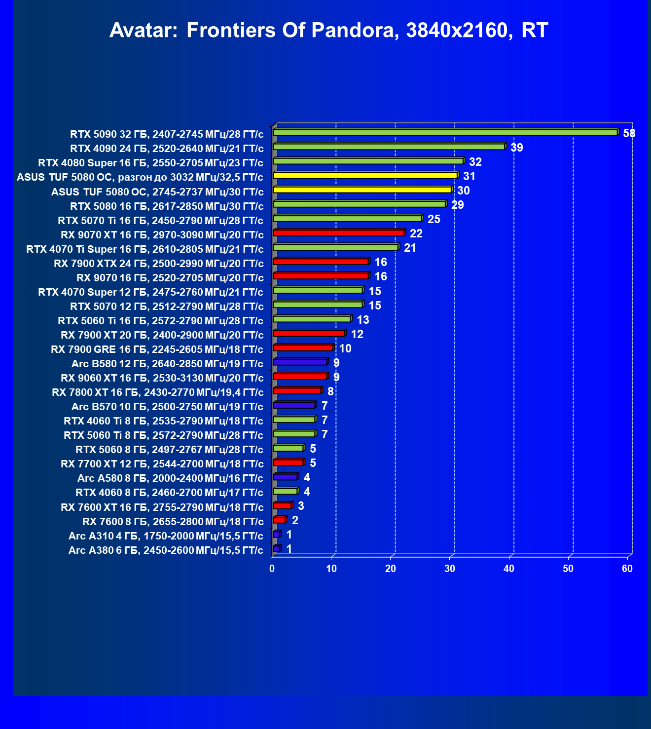 | 14 | Asus TUF 5080 OC, разгон до 3210 МГц/33,7 ГТ/с | 510 | 6380 | 125 000 |