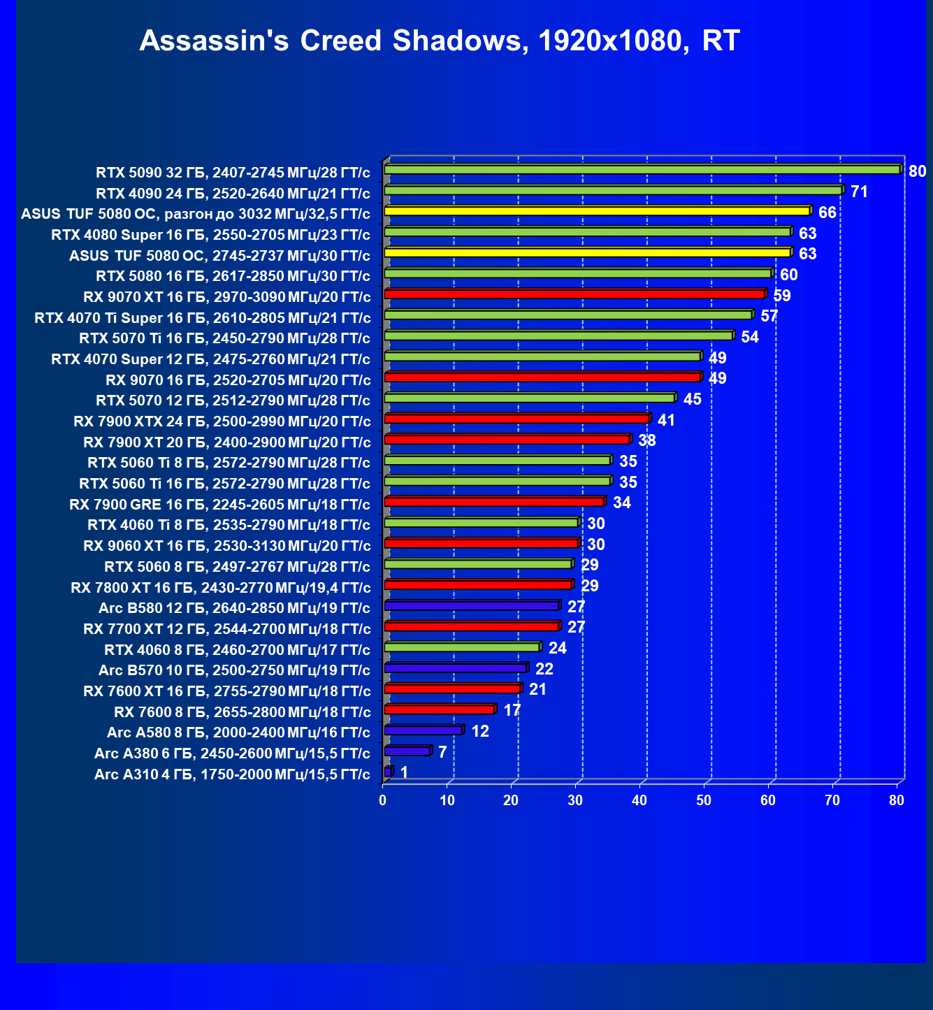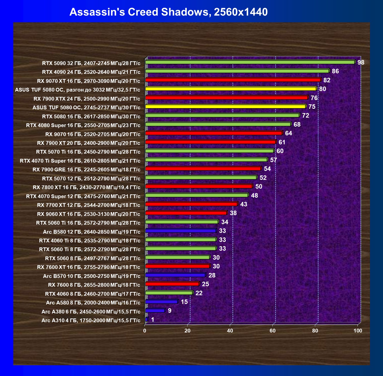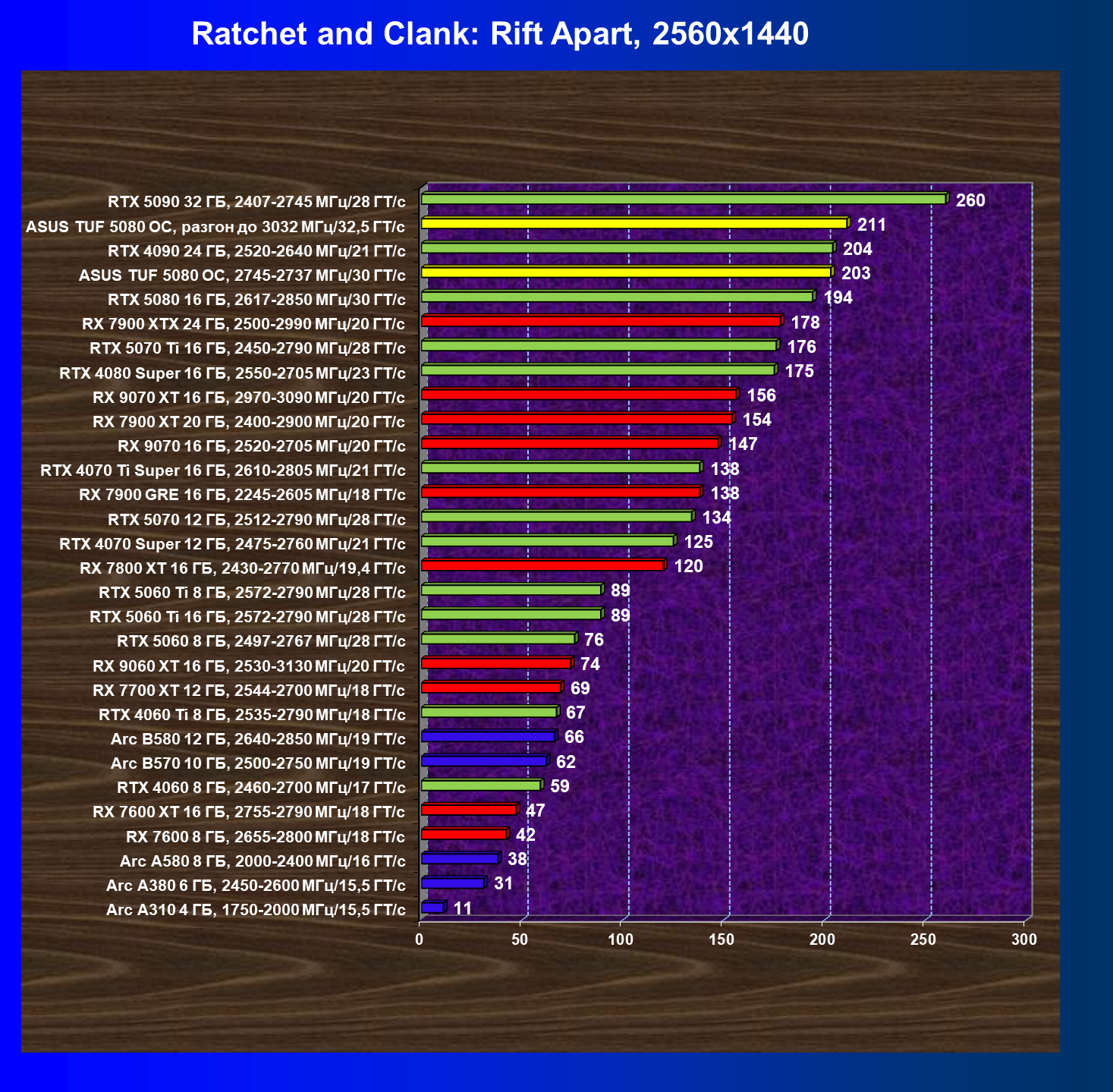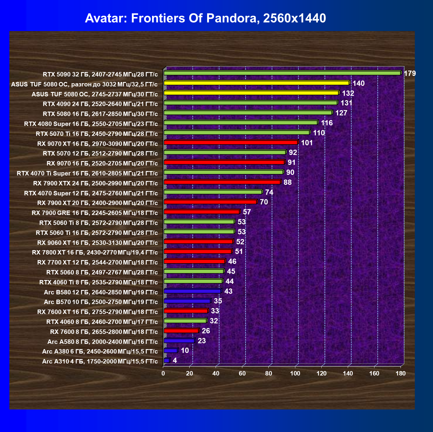 | 14 | Asus TUF 5080 OC, разгон до 3210 МГц/33,7 ГТ/с | 510 | 6380 | 125 000 |