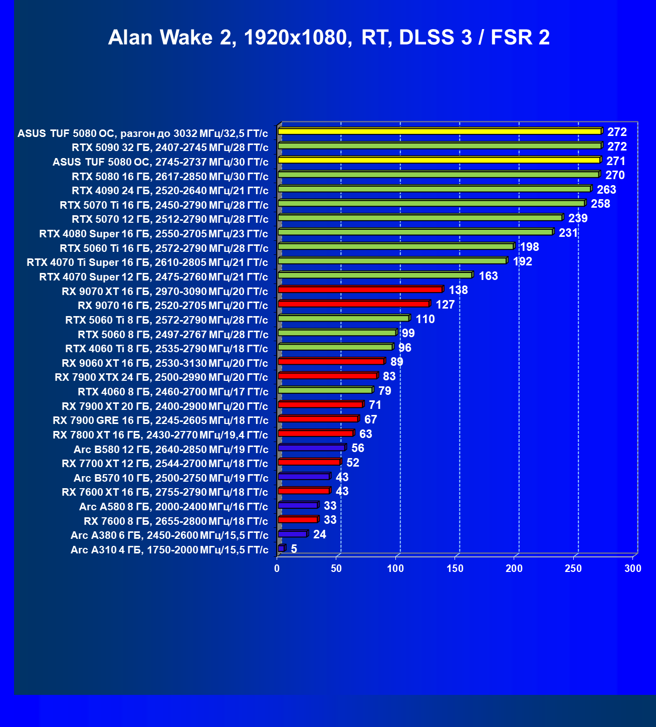 | 02 | Asus TUF 5080 OC, разгон до 3210 МГц/33,7 ГТ/с | 13814 | 953 | 125 000 |