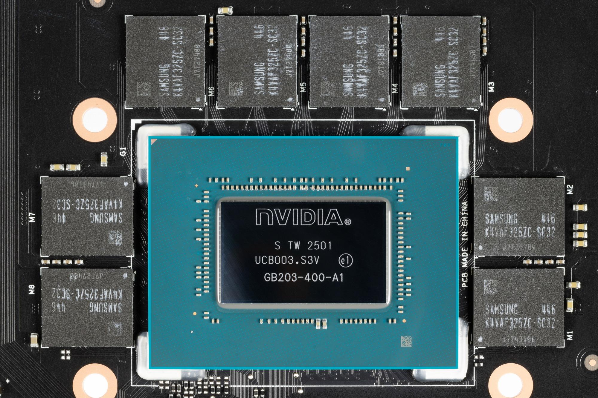 Карта имеет 16 ГБ памяти GDDR7 SDRAM, размещенной в 8 микросхемах по 16 Гбит на лицевой стороне PCB. Микросхемы памяти Samsung (K4VAF325ZC-SC32) рассчитаны на номинальную частоту работы в 2666 МГц (эффективная ПСП 32 Гбит/с).