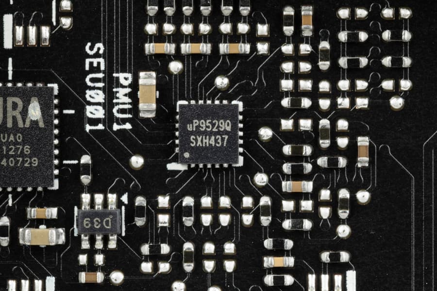 Питанием микросхем памяти управляет ШИМ-контроллер uP9529Q (uPI Semi).