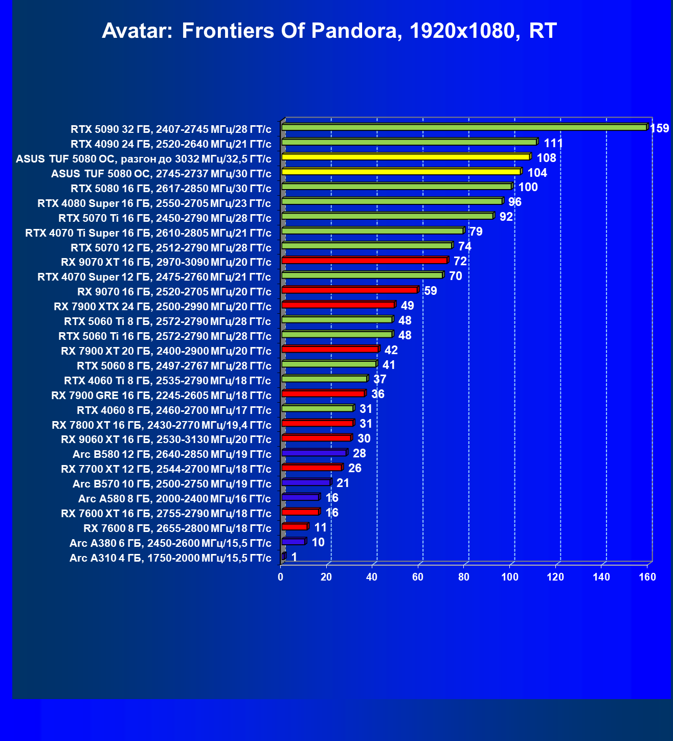 | 20 | Asus TUF 5080 OC, 2700—2812 МГц/30 ГТ/с | 470 | 5871 | 125 000 |