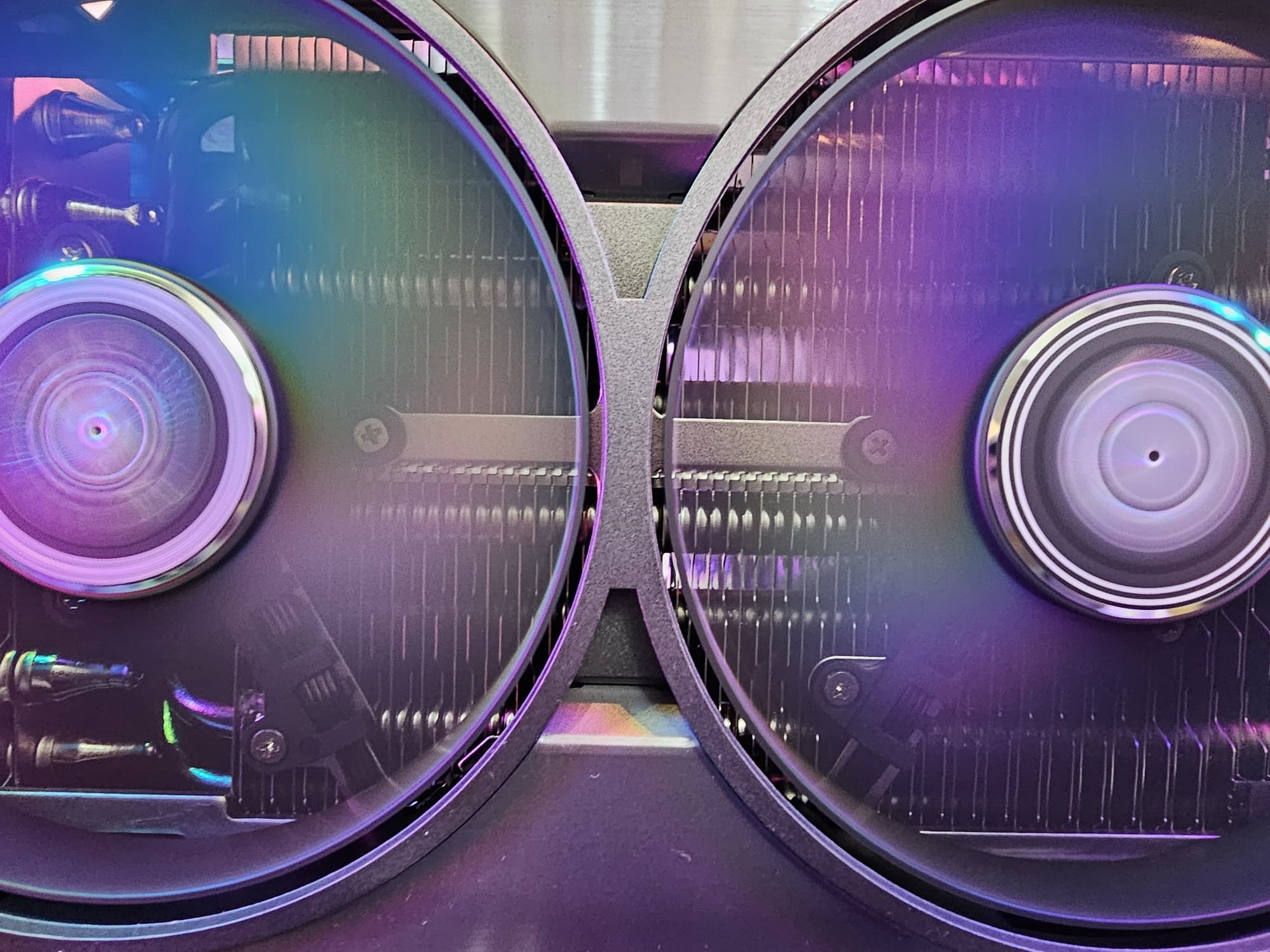 Поверх радиатора установлен кожух с тремя вентиляторами Axial-Tech ∅100 мм, имеющими по 11 лопастей, соединенных кольцом по краям.