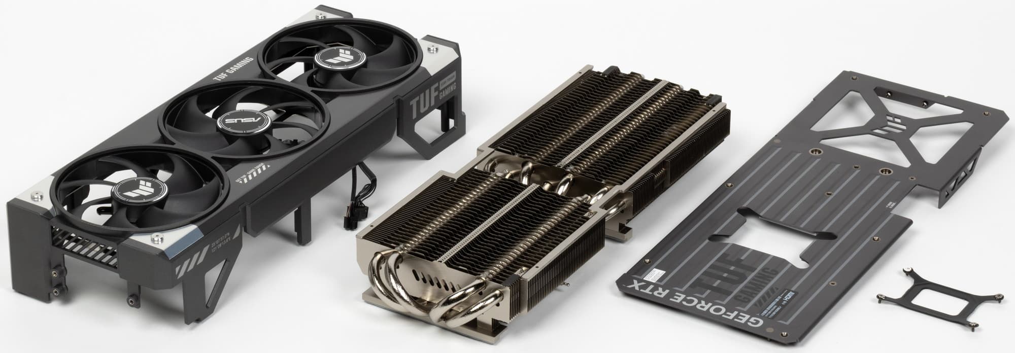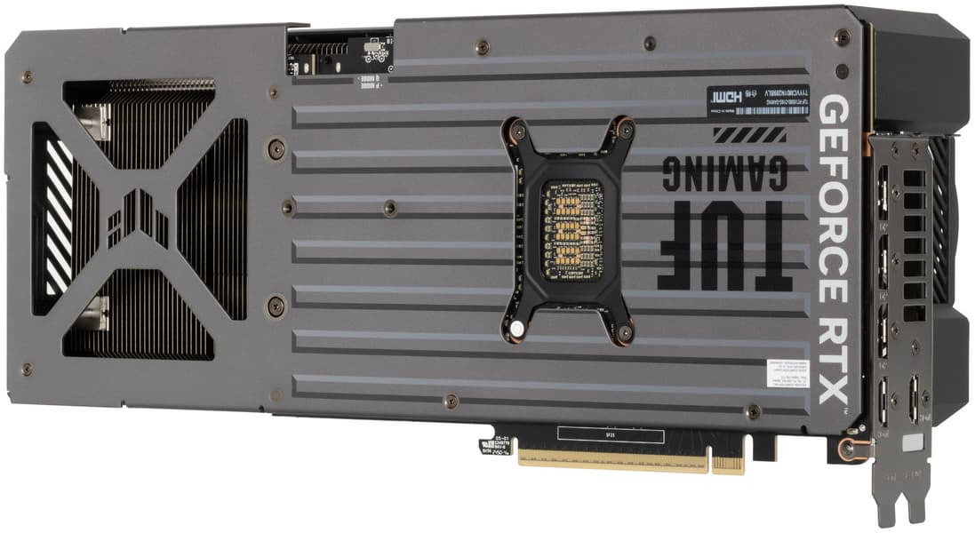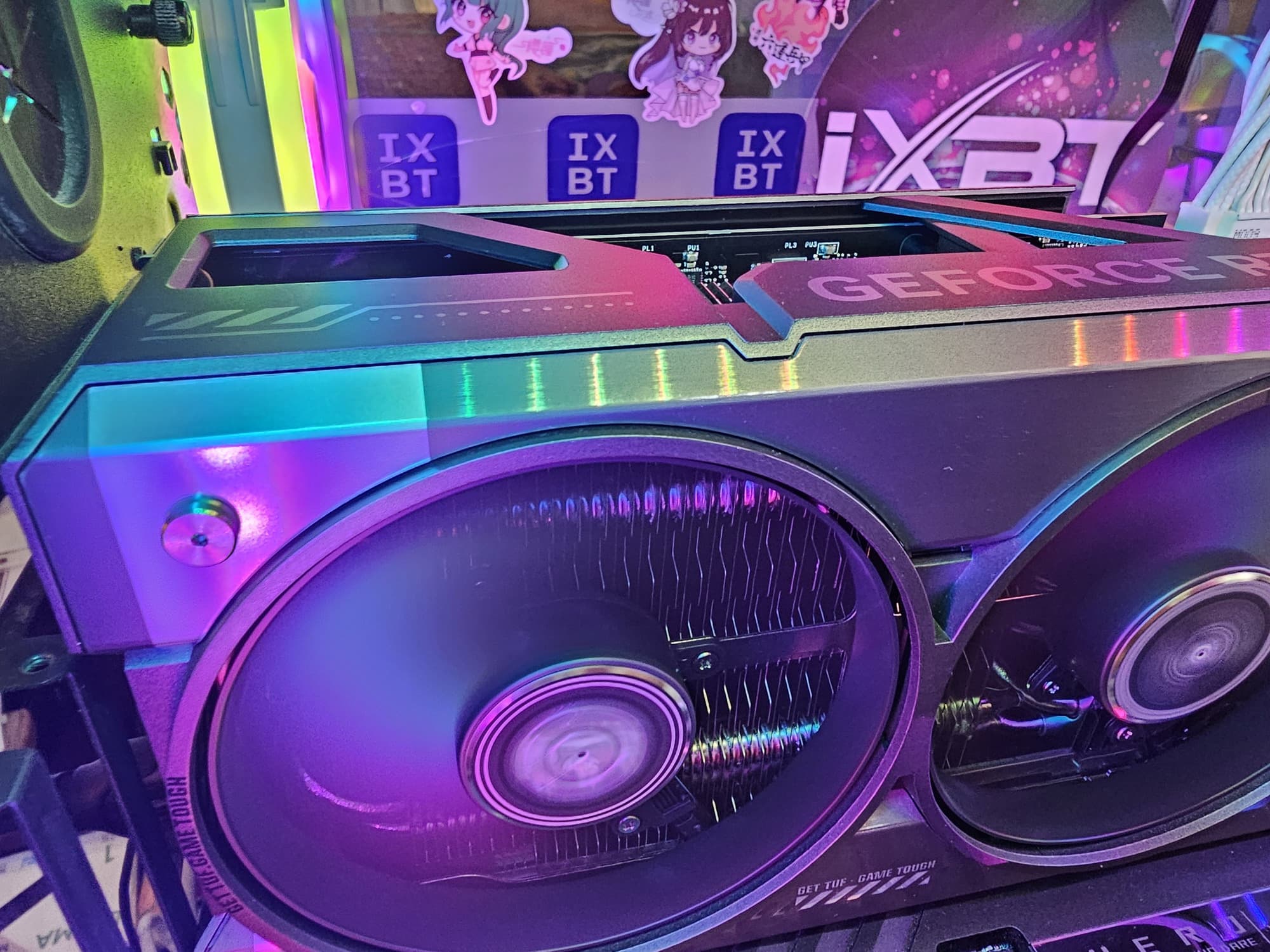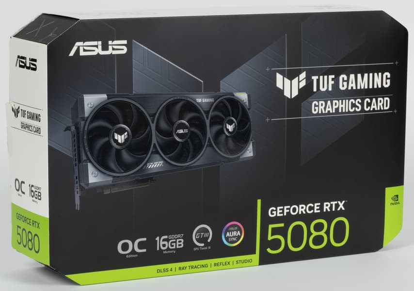 Asus TUF Gaming GeForce RTX 5080 OC (16 ГБ) — вариант топового ускорителя Asus на базе GeForce RTX 5080 без излишеств, имеющий эффективную систему охлаждения, не слишком шумную в основном режиме и очень тихую в режиме BIOS S. Расплатой за это являются габариты кулера и карты в целом (35 см в длину, 15 см в высоту, 3,5 слота (де-факто 4) в толщину) и приличная масса карты — около 2 кг.