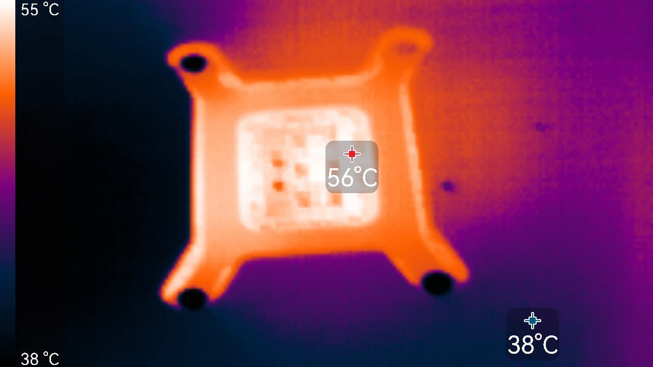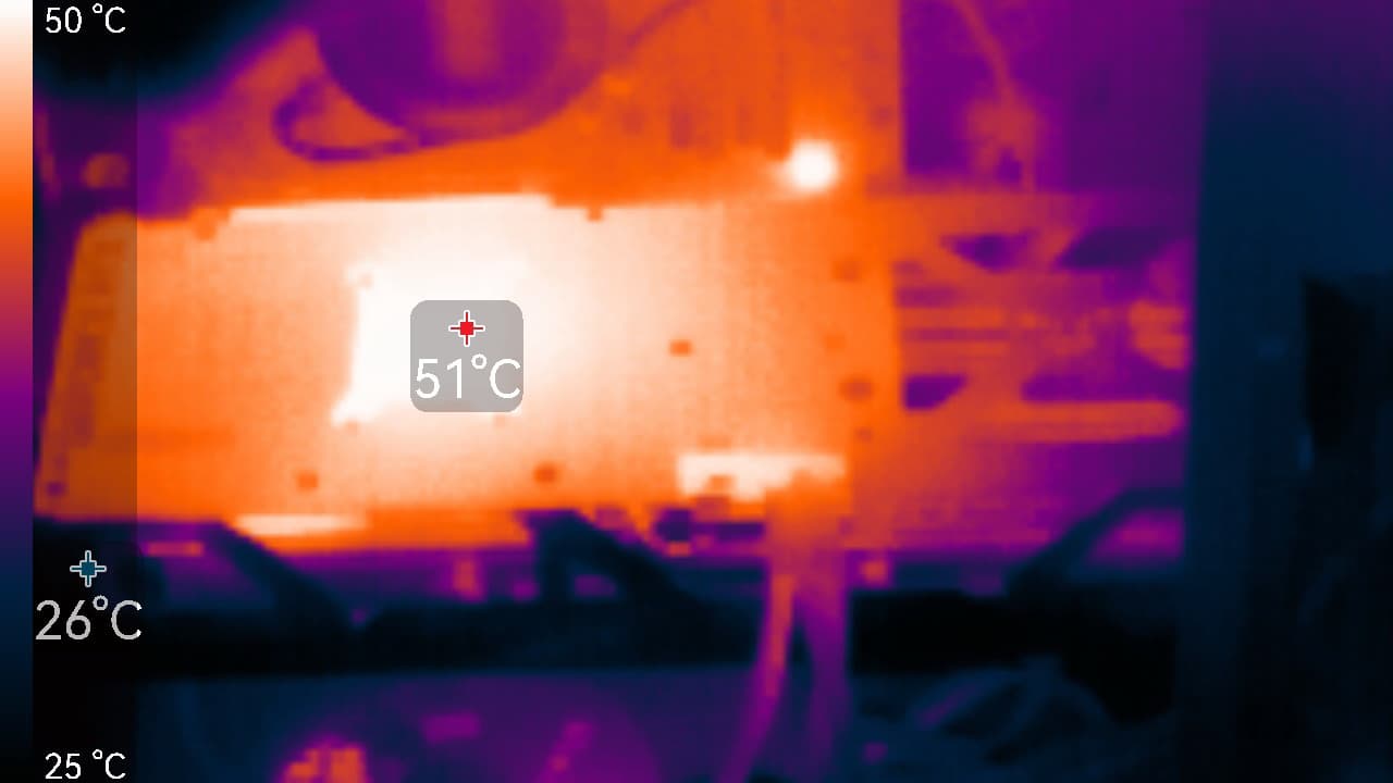 В режиме максимальной нагрузки в 3D температура достигала 73/72 °C (ядро/память). Вентиляторы при этом раскручивались до 1088 оборотов в минуту, шум вырастал до 24,5 дБА: это очень тихо.