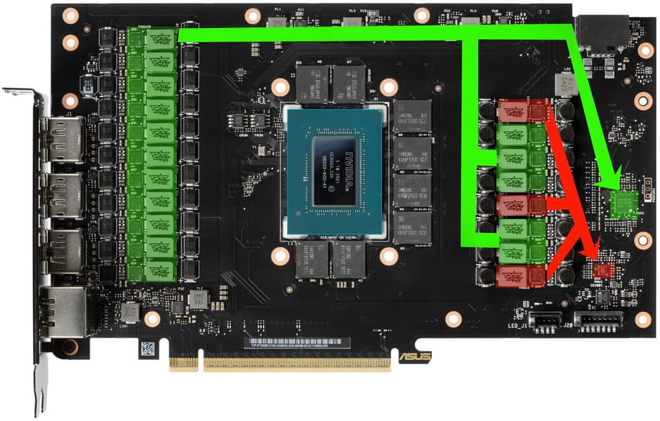 Зеленым цветом отмечена схема питания ядра, красным — памяти. Все ШИМ-контроллеры расположены на лицевой стороне PCB.
