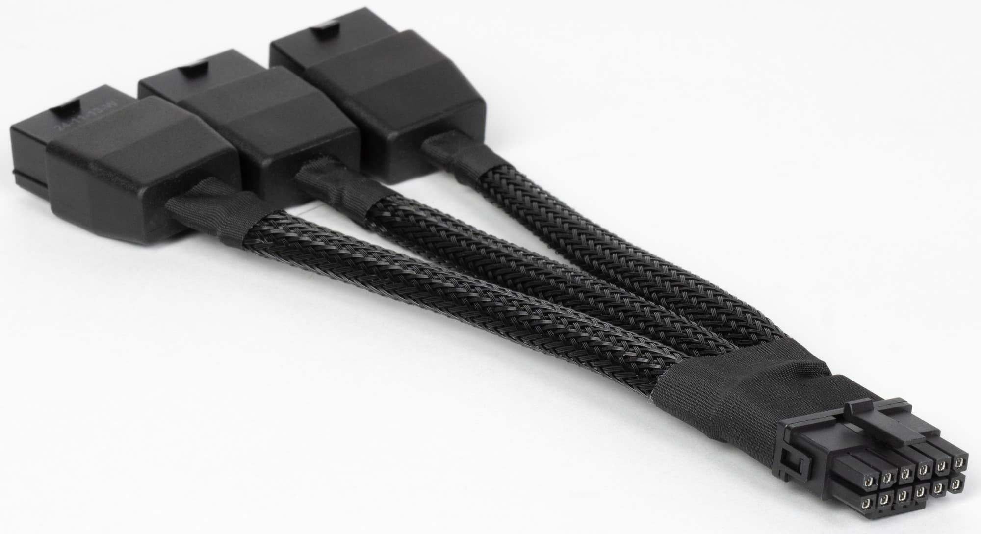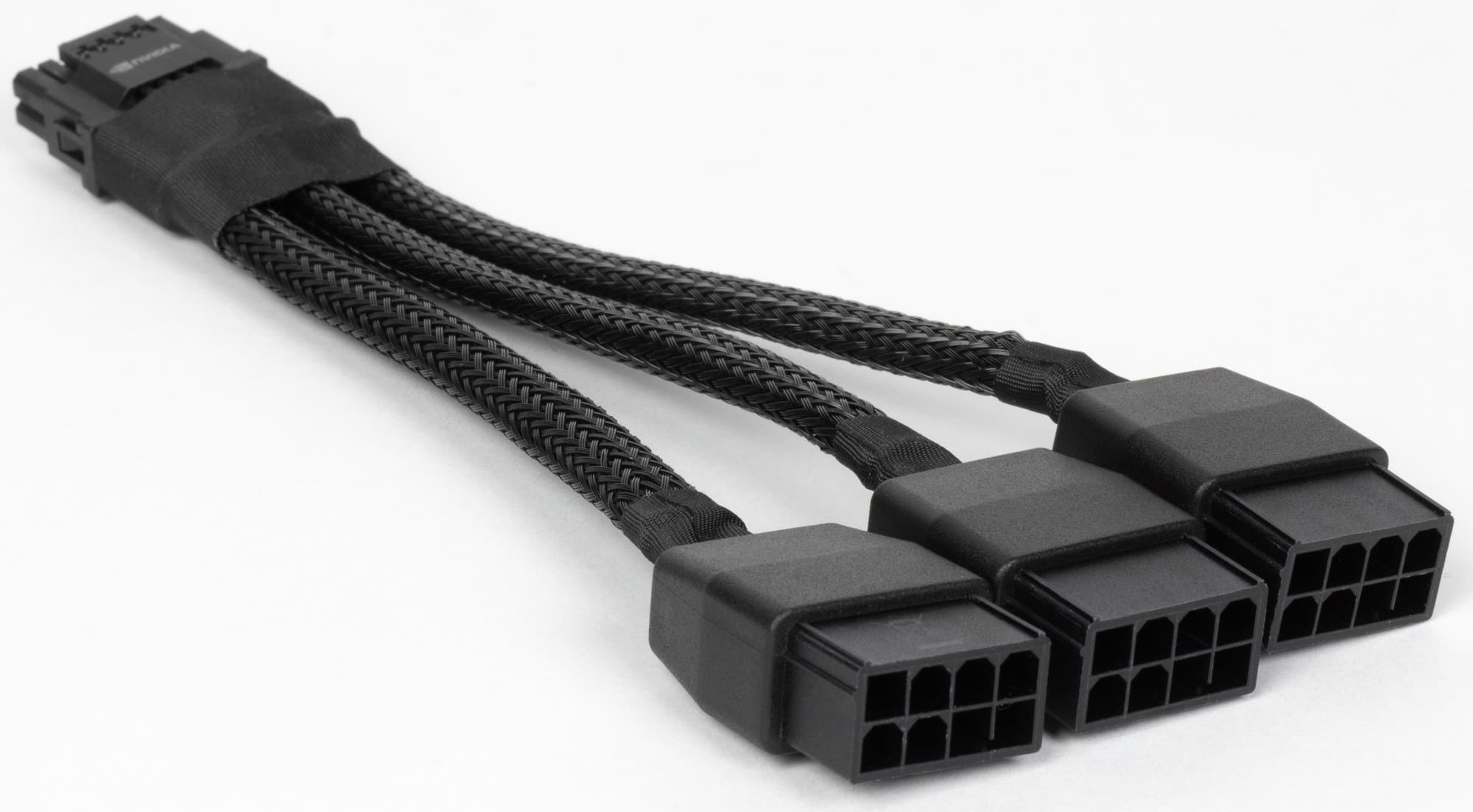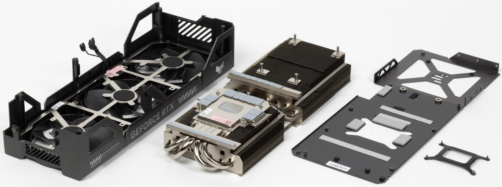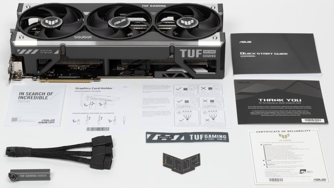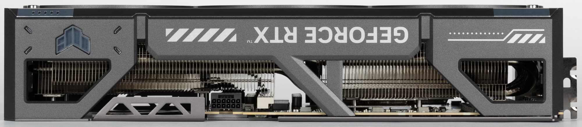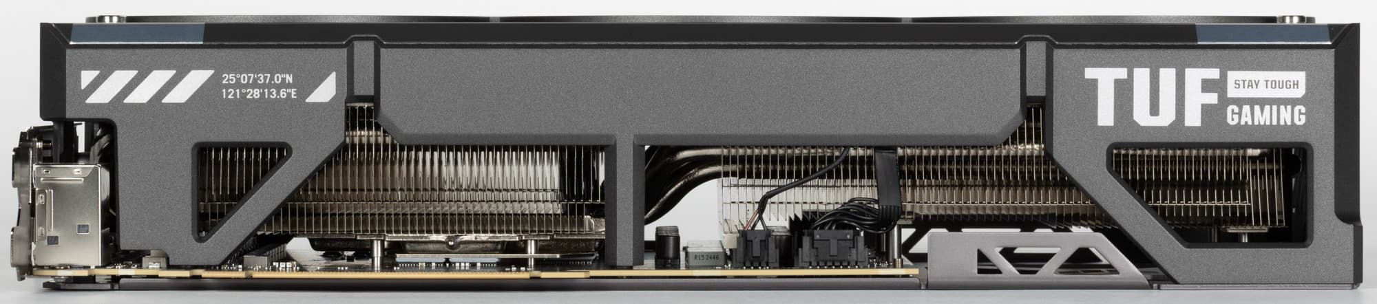 Карта Asus имеет 16-контактный разъем питания версии PCIe 5.0. Хотя в комплекте поставки имеется адаптер-переходник для подключения разъемов питания типа PCIe 2.0 (с 3 таких разъемов), лучше всё же использовать блоки питания стандарта ATX 3.0 с полноценной поддержкой питания PCIe 5.0 (с кабелем 12VHPWR). Имеющийся же переходник питания ни в коем случае нельзя изгибать непосредственно после 16-контактного разъема.