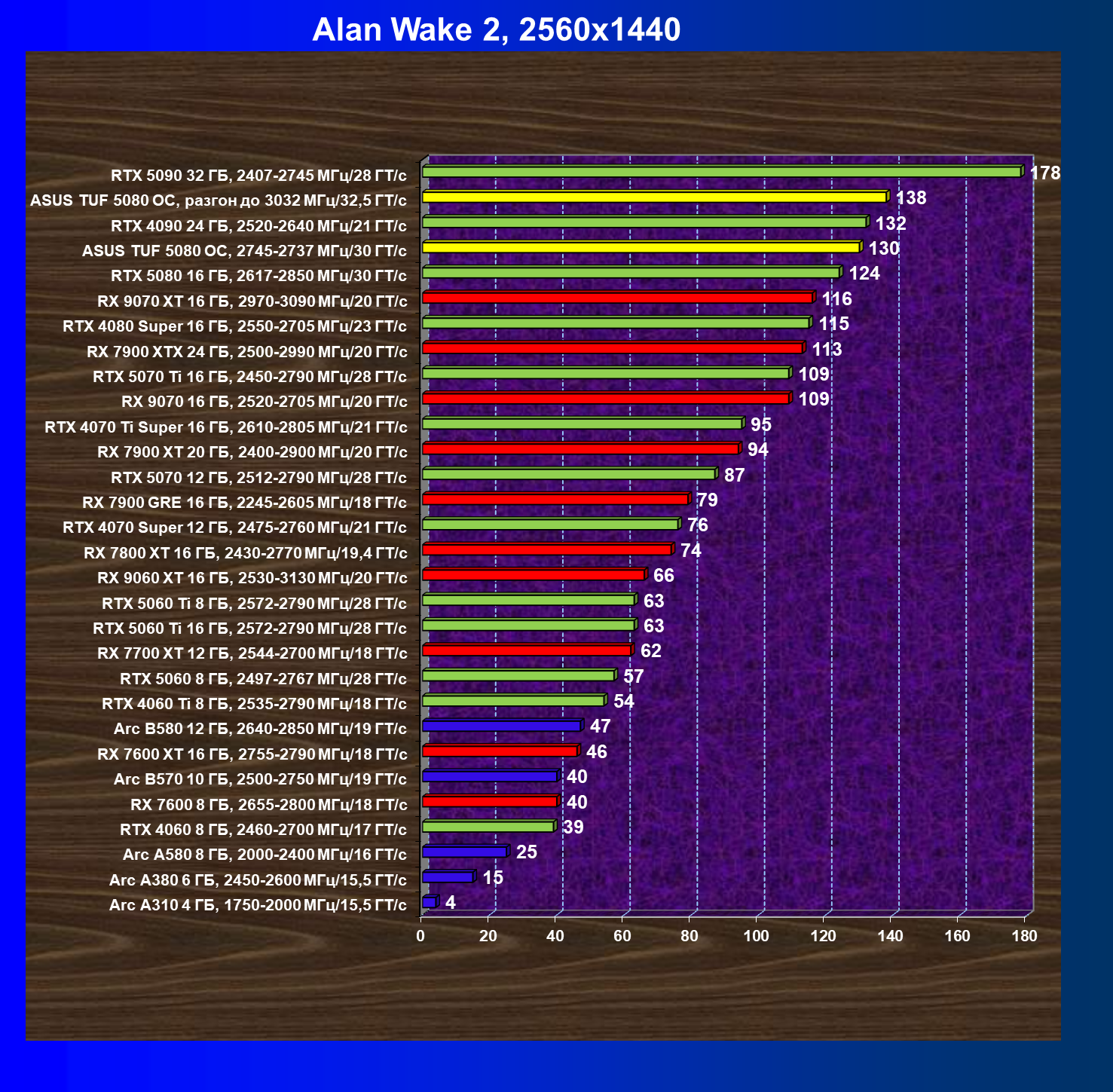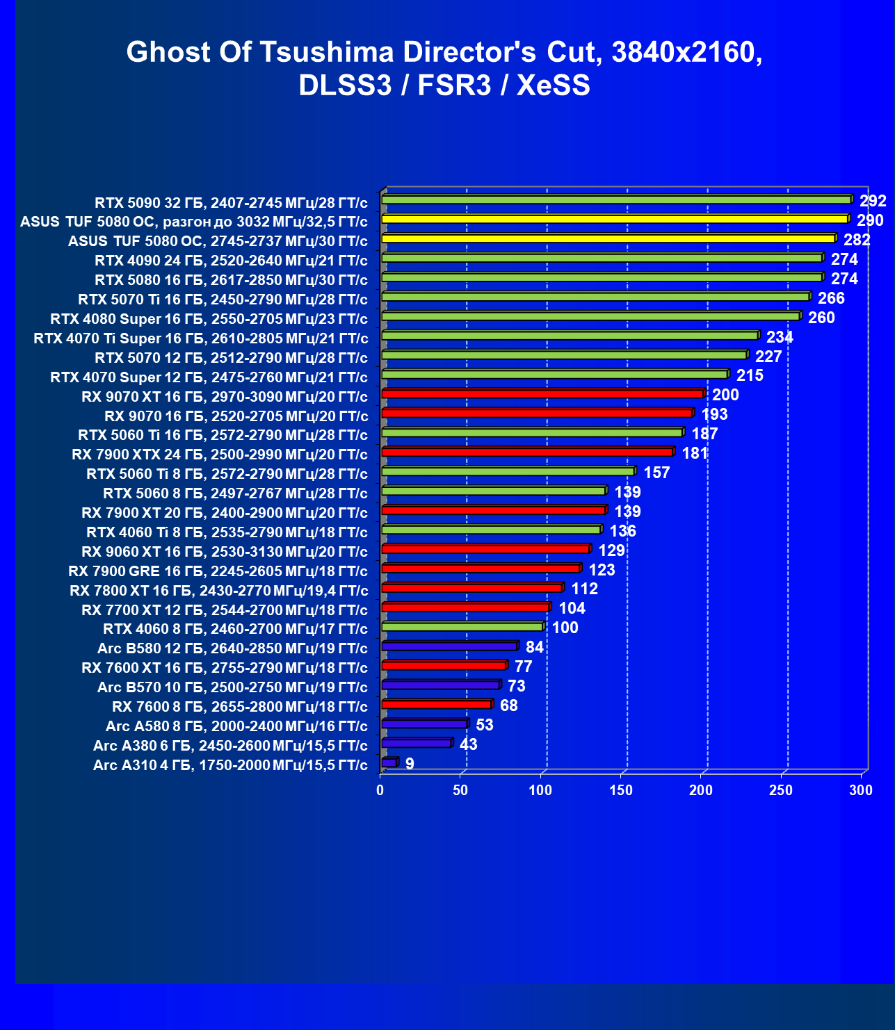 GeForce RTX 5080 в данном наборе игр в разрешении 4K в среднем обошел GeForce RTX 4090 на 26%, GeForce RTX 4080 Super — на 49%, Radeon RX 9070 XT — на 64%. Но не стоит забывать, что этот прирост обусловлен использованием MFG, а не чисто аппаратными возможностями GeForce RTX 5080.