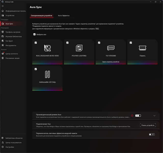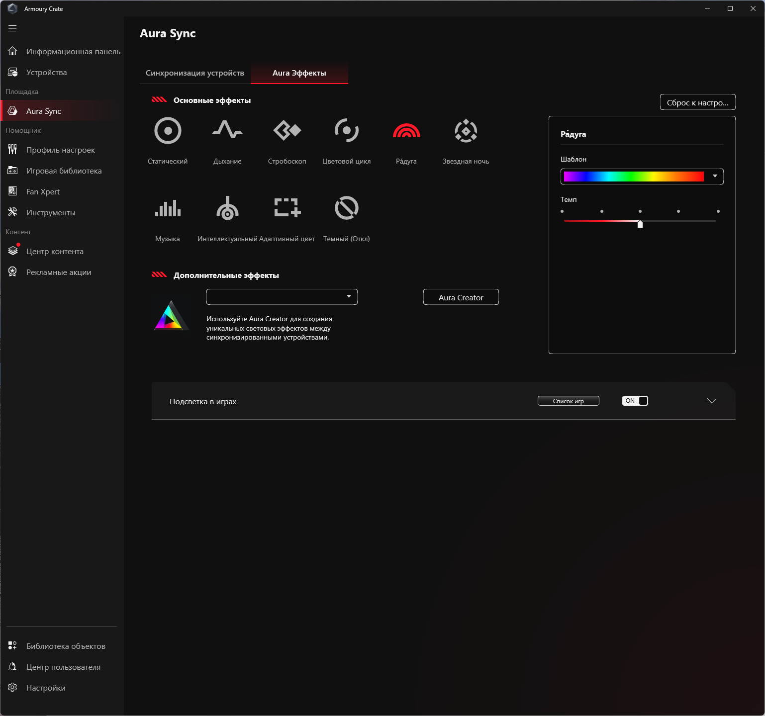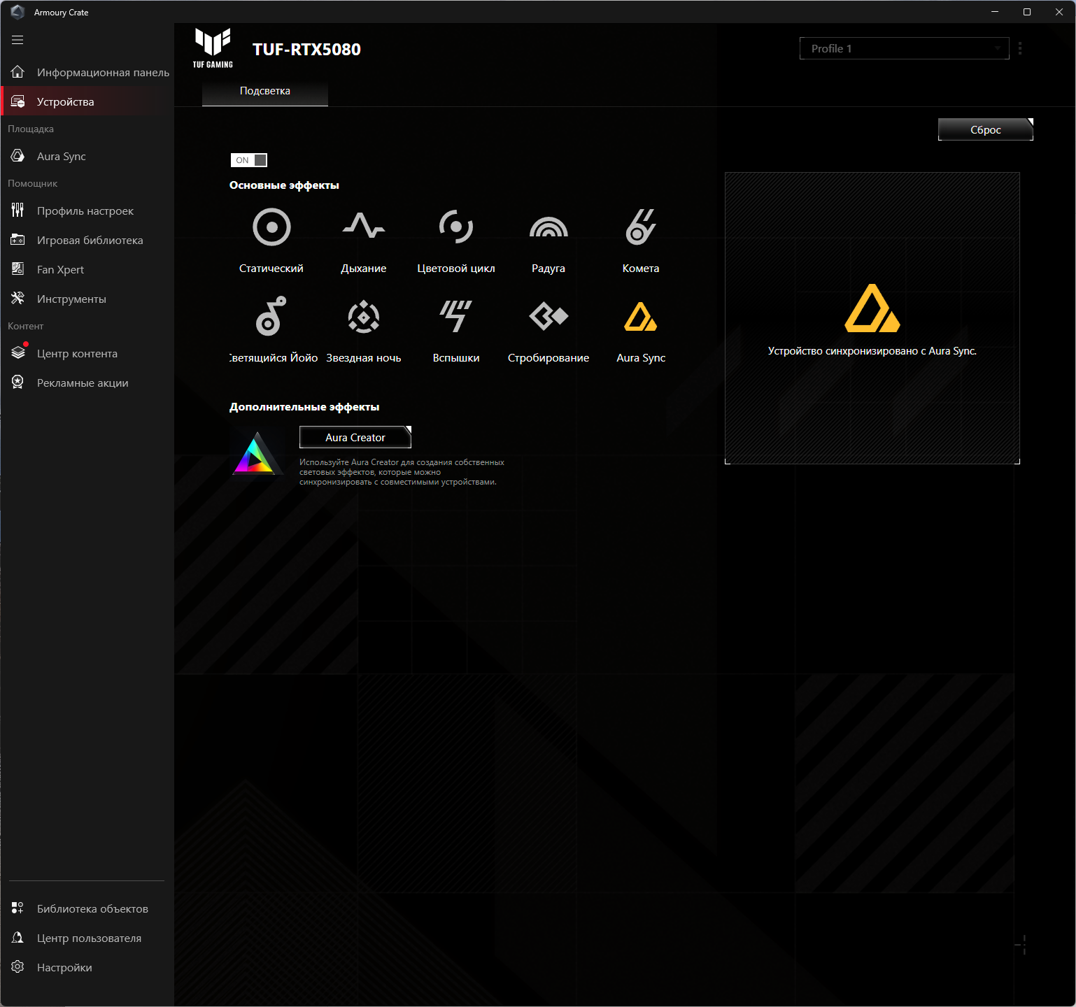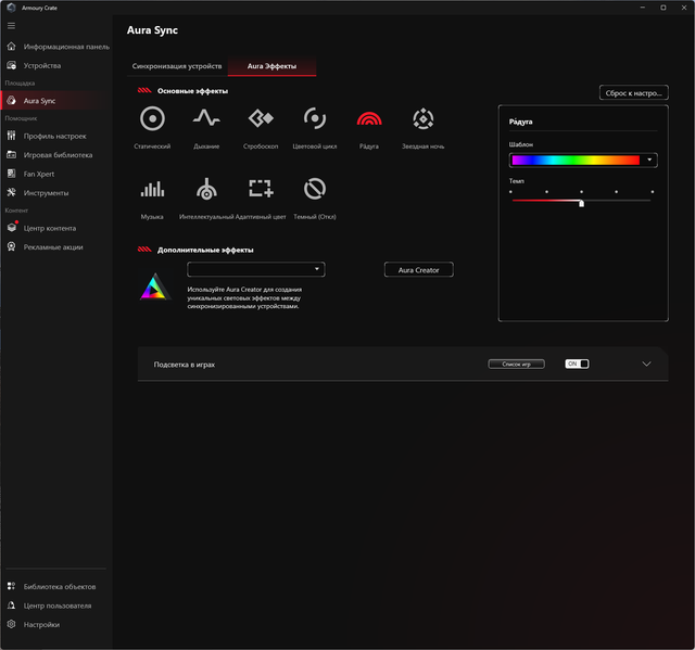 Управление режимами подсветки, в том числе и ее отключением, осуществляется утилитой Asus Armoury Crate. Вариантов сценариев немного, однако имеется программа-компаньон Aura Creator, с помощью которой можно создать свои собственные сценарии подсветки. Подсветка может синхронизироваться с материнскими платами, но только Asus.