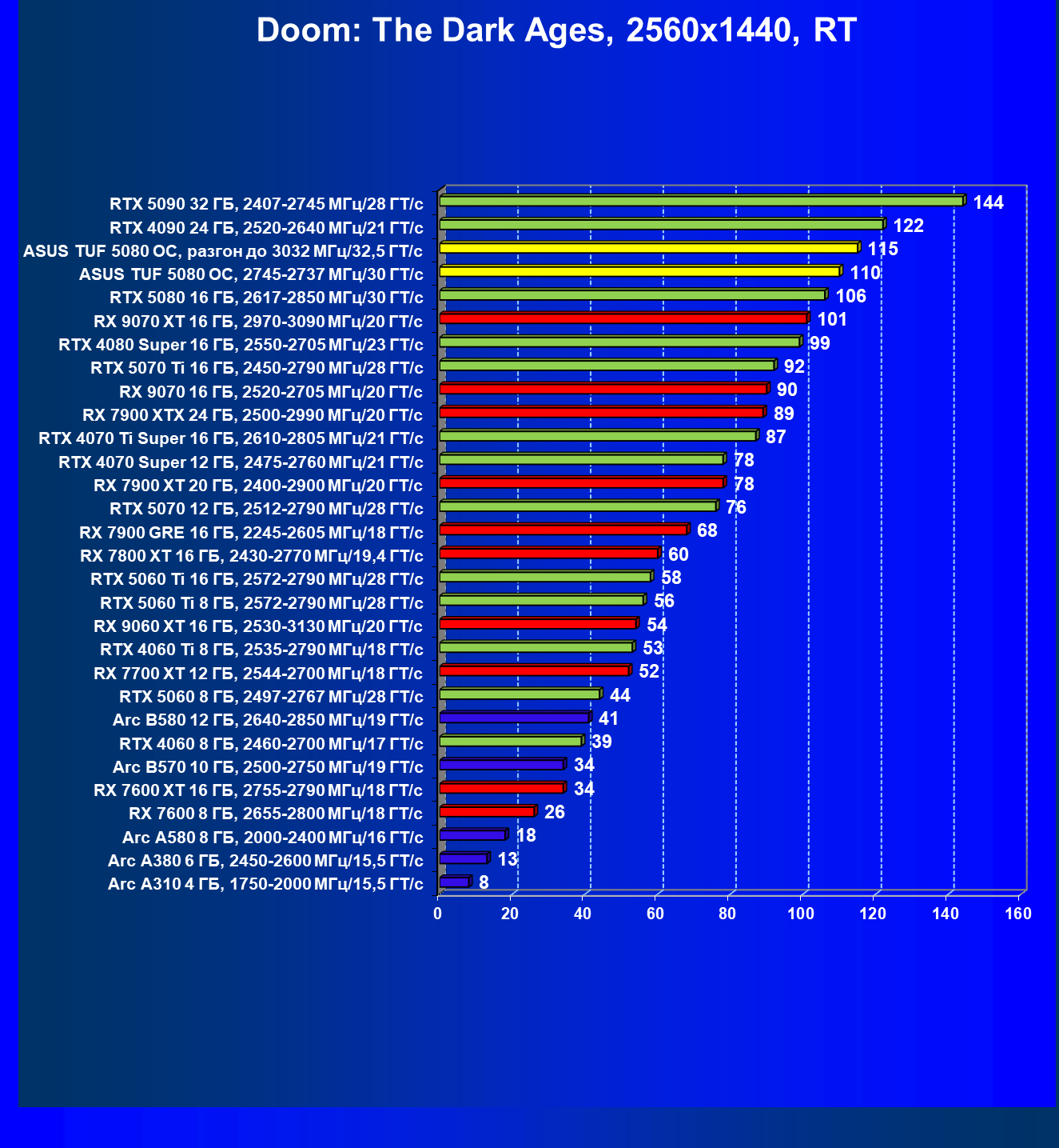Во всех играх (кроме Doom: The Dark Ages, где использовались настройки Ultra) использовалось максимальное качество графики в настройках (через пресеты/предустановки в играх).