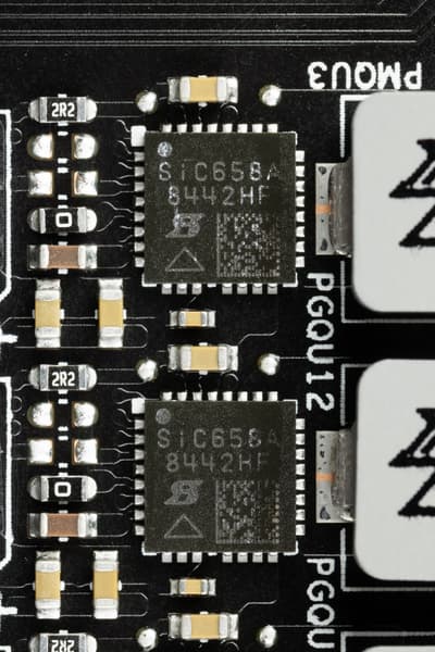 В преобразователе питания ядра и микросхем памяти используются транзисторные сборки DrMOS — Vishay SiC658A, рассчитанные на 50 А.