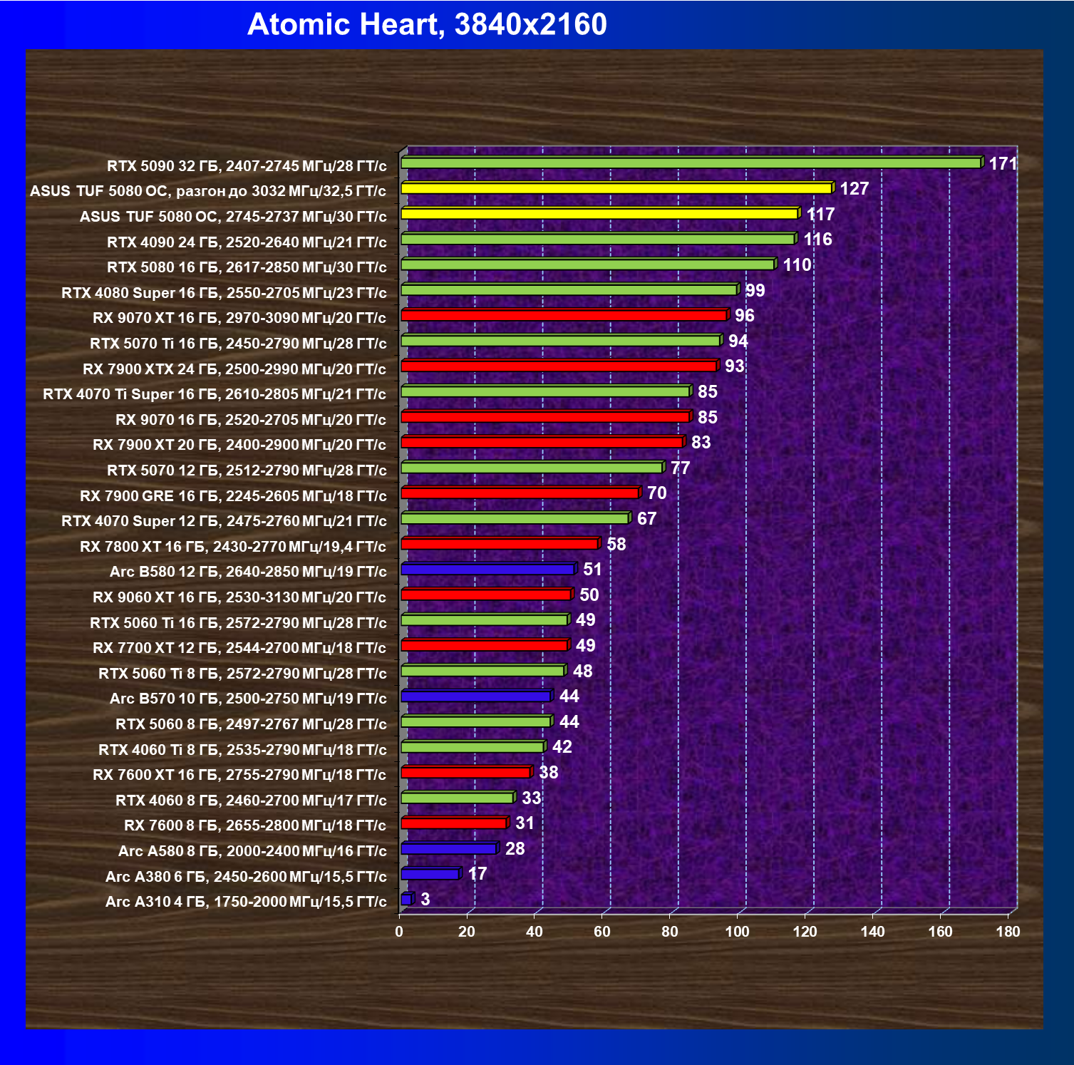 | 06 | RX 9070 XT 16 ГБ, 2970—3090 МГц/20 ГТ/с | 5247 | 709 | 74 000 |
