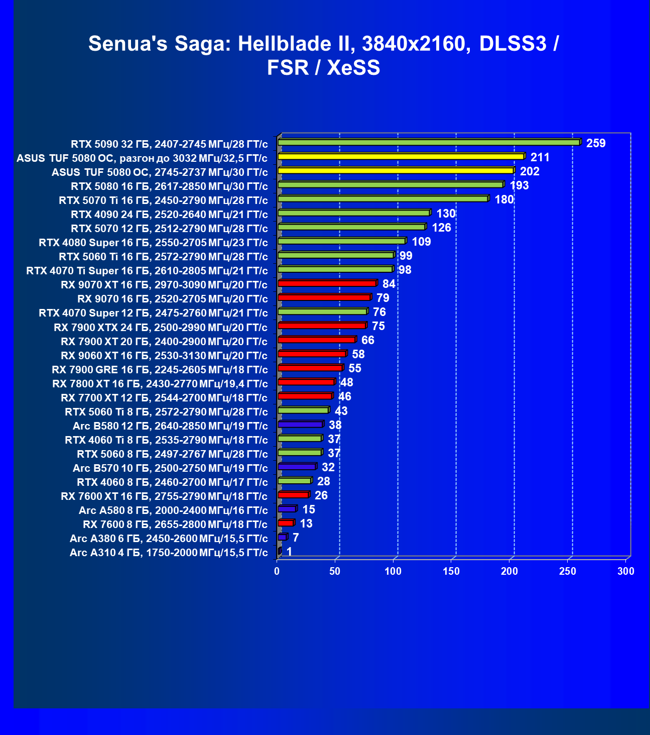 Также во все игры можно играть с высокими настройками графики и с трассировкой лучей в разрешениях ниже 4K, а во многих играх — и в 4K, при этом использование динамического масштабирования (апскейлинга) не является необходимым. А использование DLSS (особенно с генератором кадров (frame generator, FG), не говоря уже о multi frame generator (MFG), обеспечит очень неплохую прибавку FPS и даст шанс получить хороший комфорт даже в 8K (правда, в таком разрешении наличие 16 ГБ локальной видеопамяти может стать уже лимитирующим производительность).