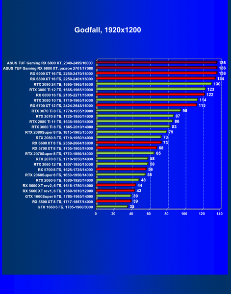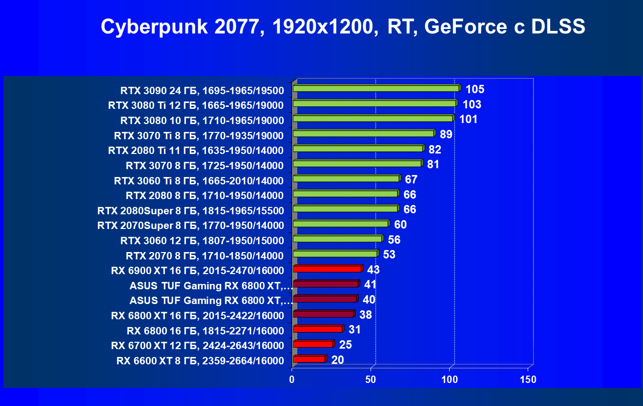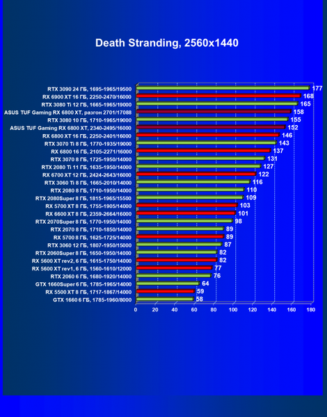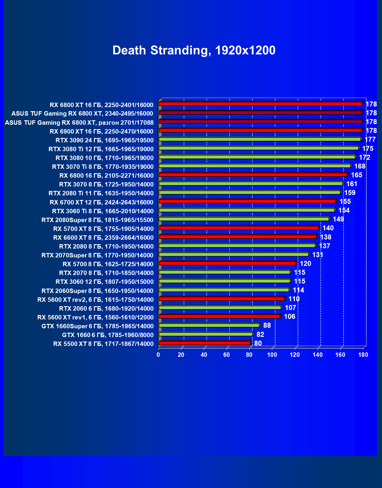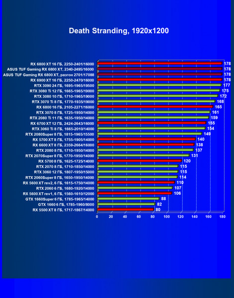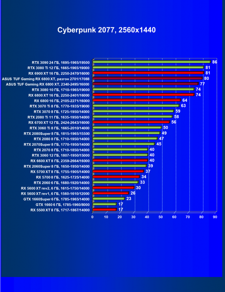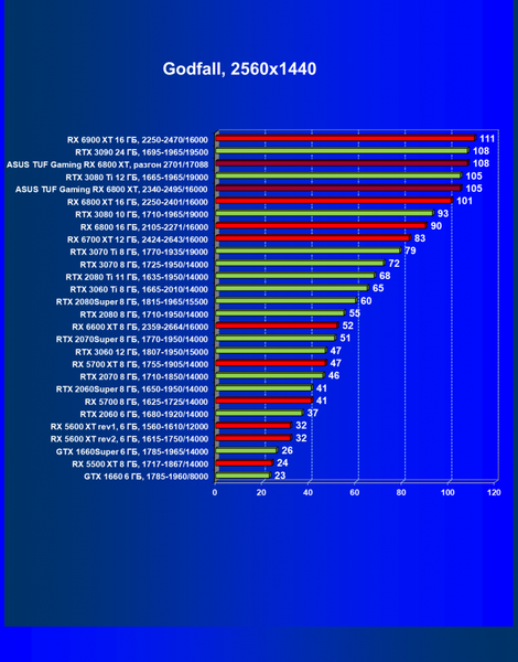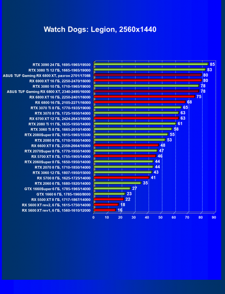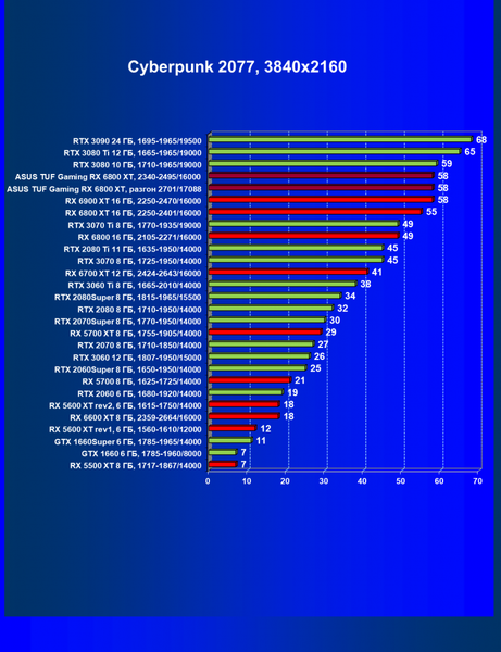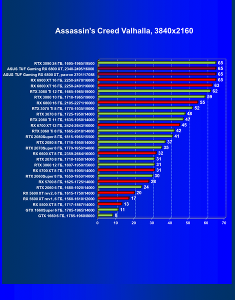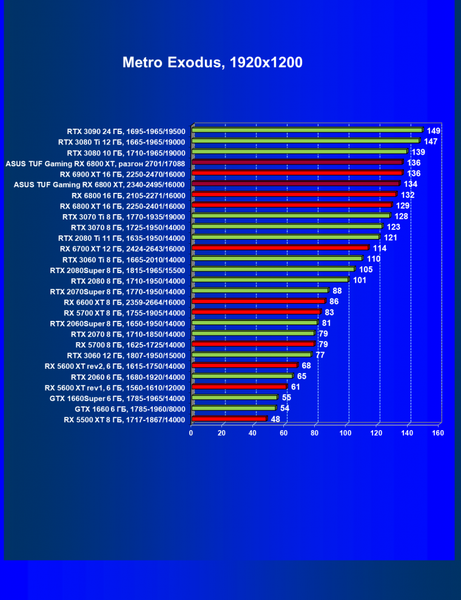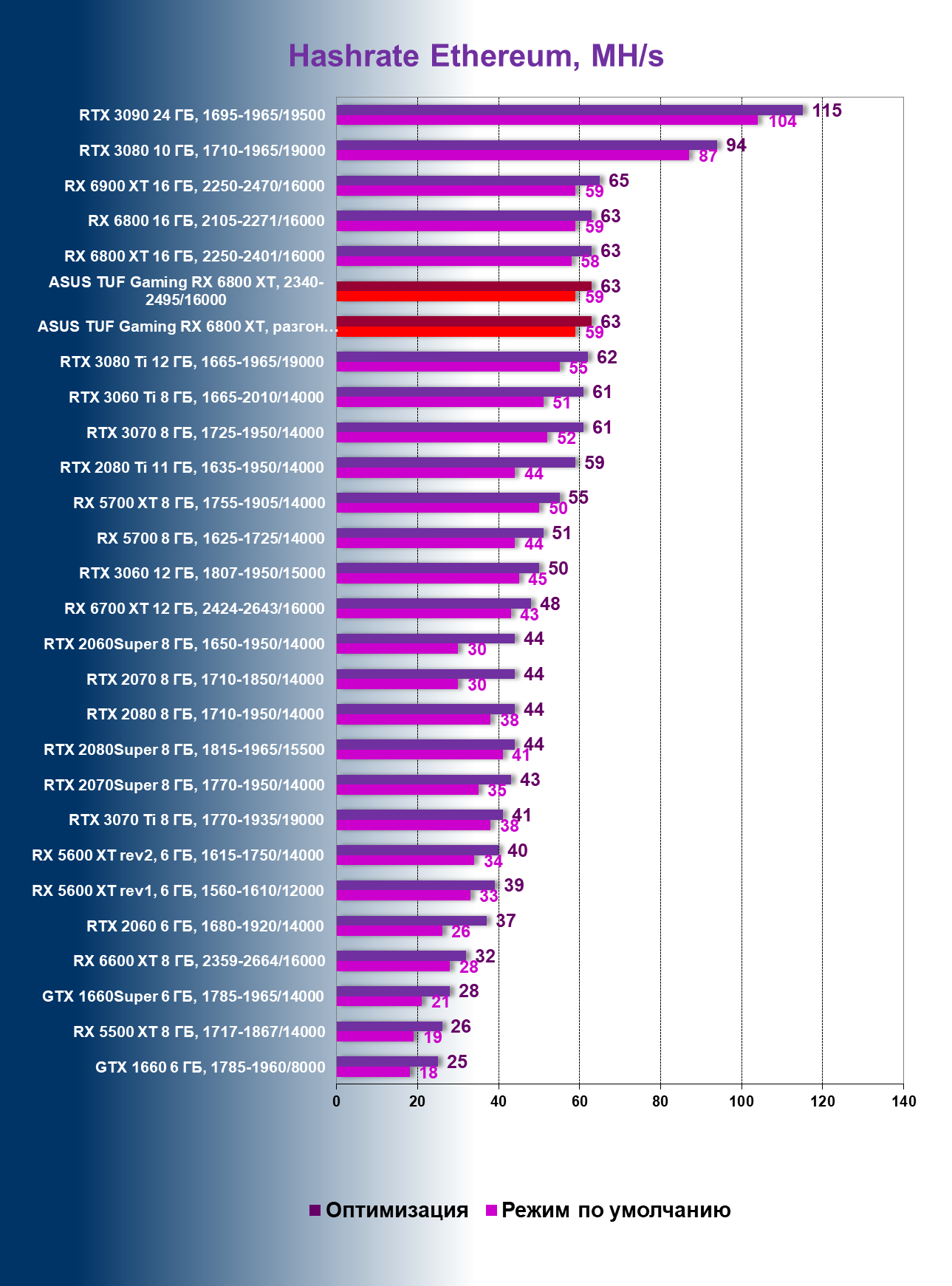 | 14 | Asus TUF Gaming RX 6800 XT, 2340—2495/16000 | 11 | 168 | 150 000 |