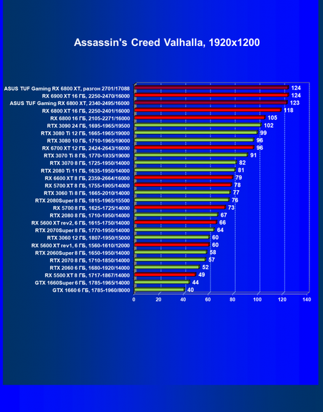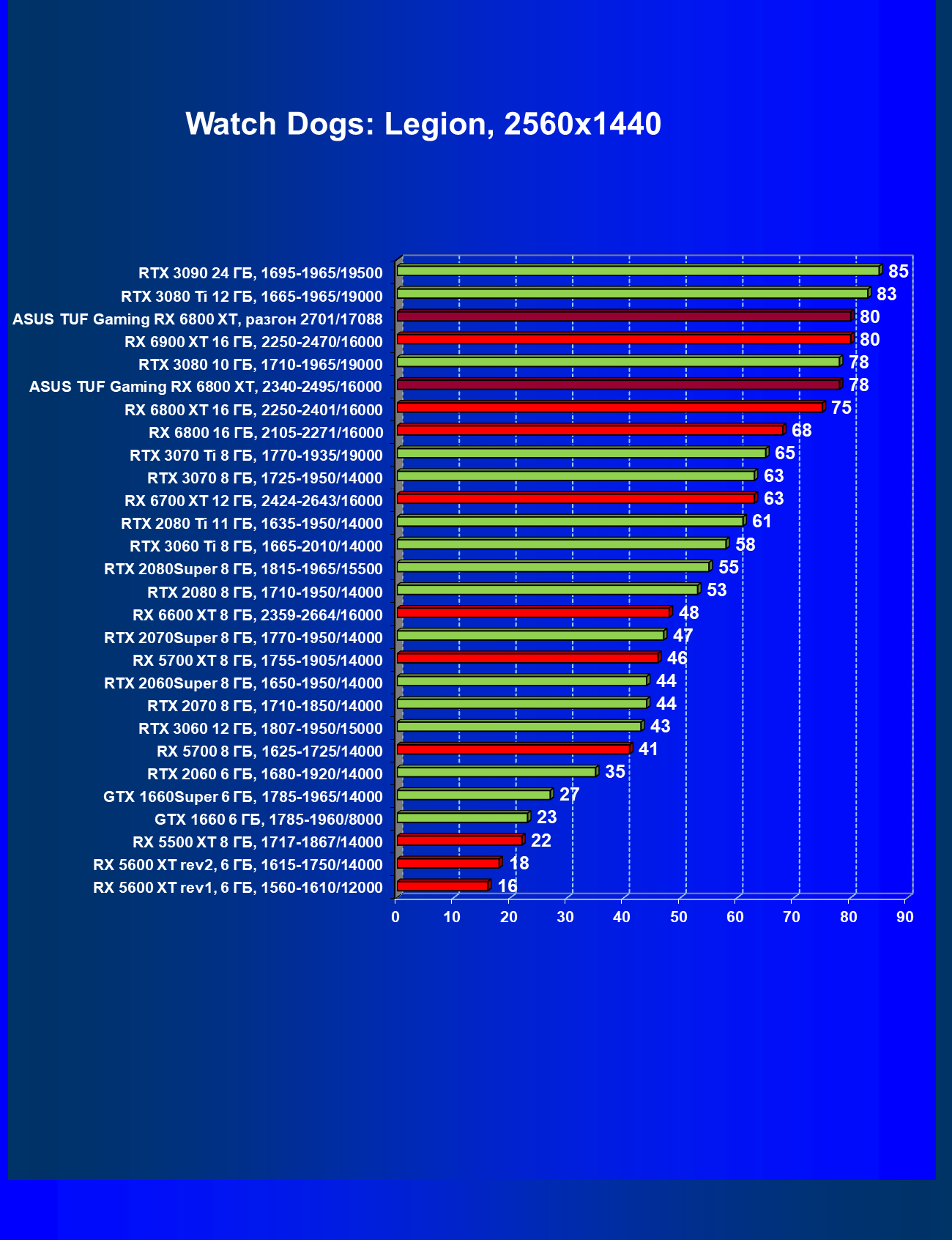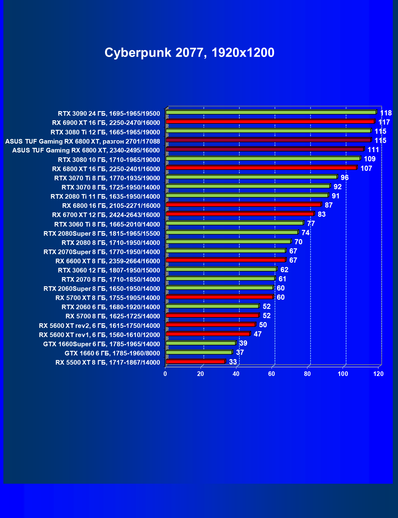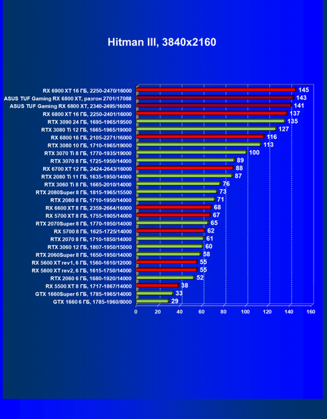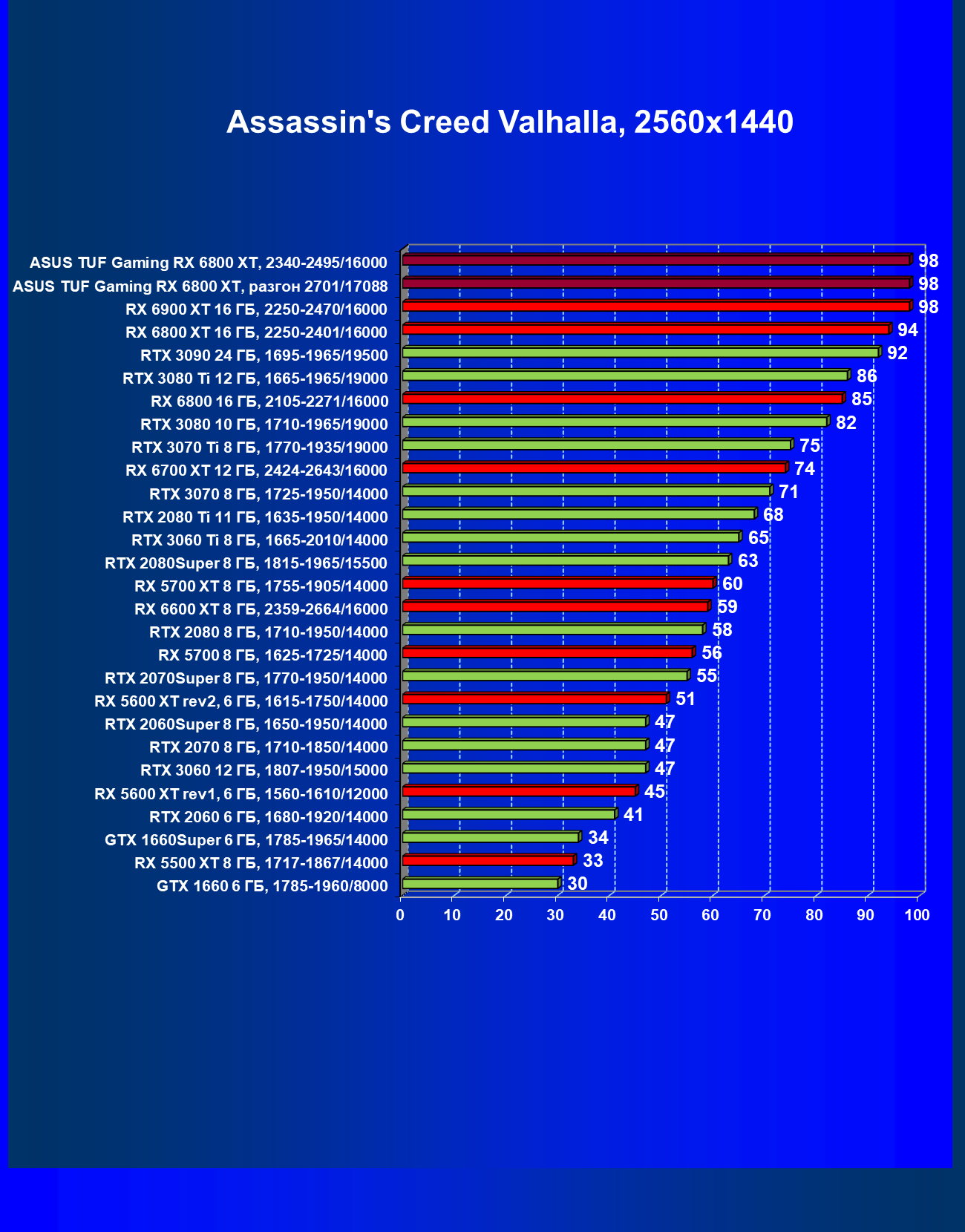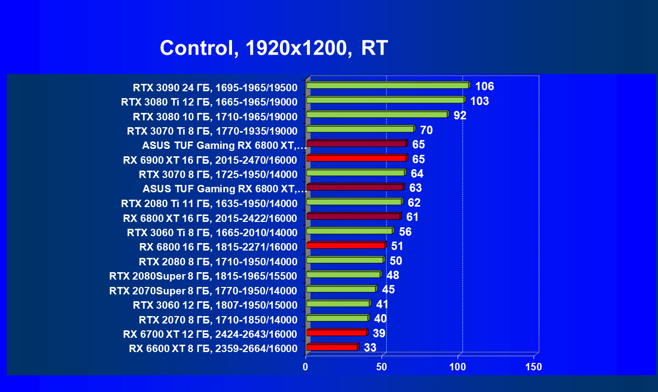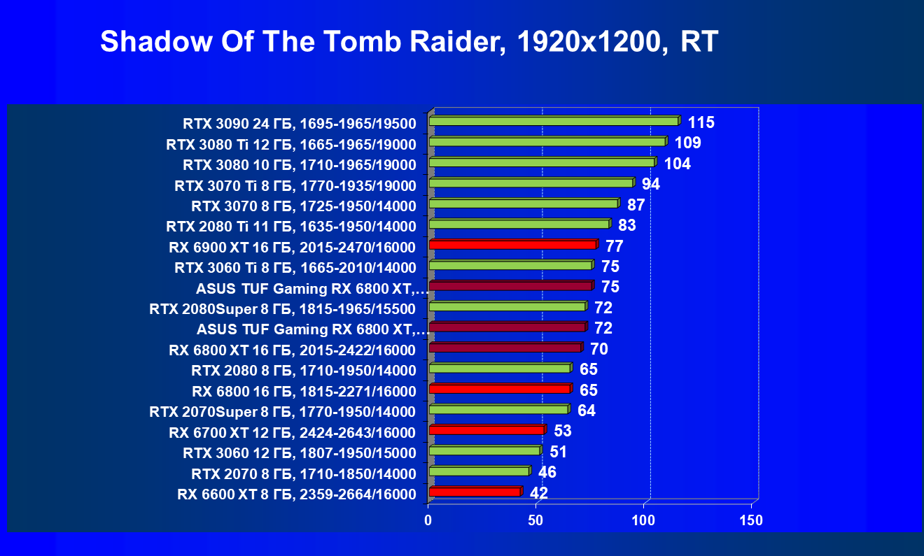 | 14 | Asus TUF Gaming RX 6800 XT, 2340—2495/16000 | 11 | 168 | 150 000 |