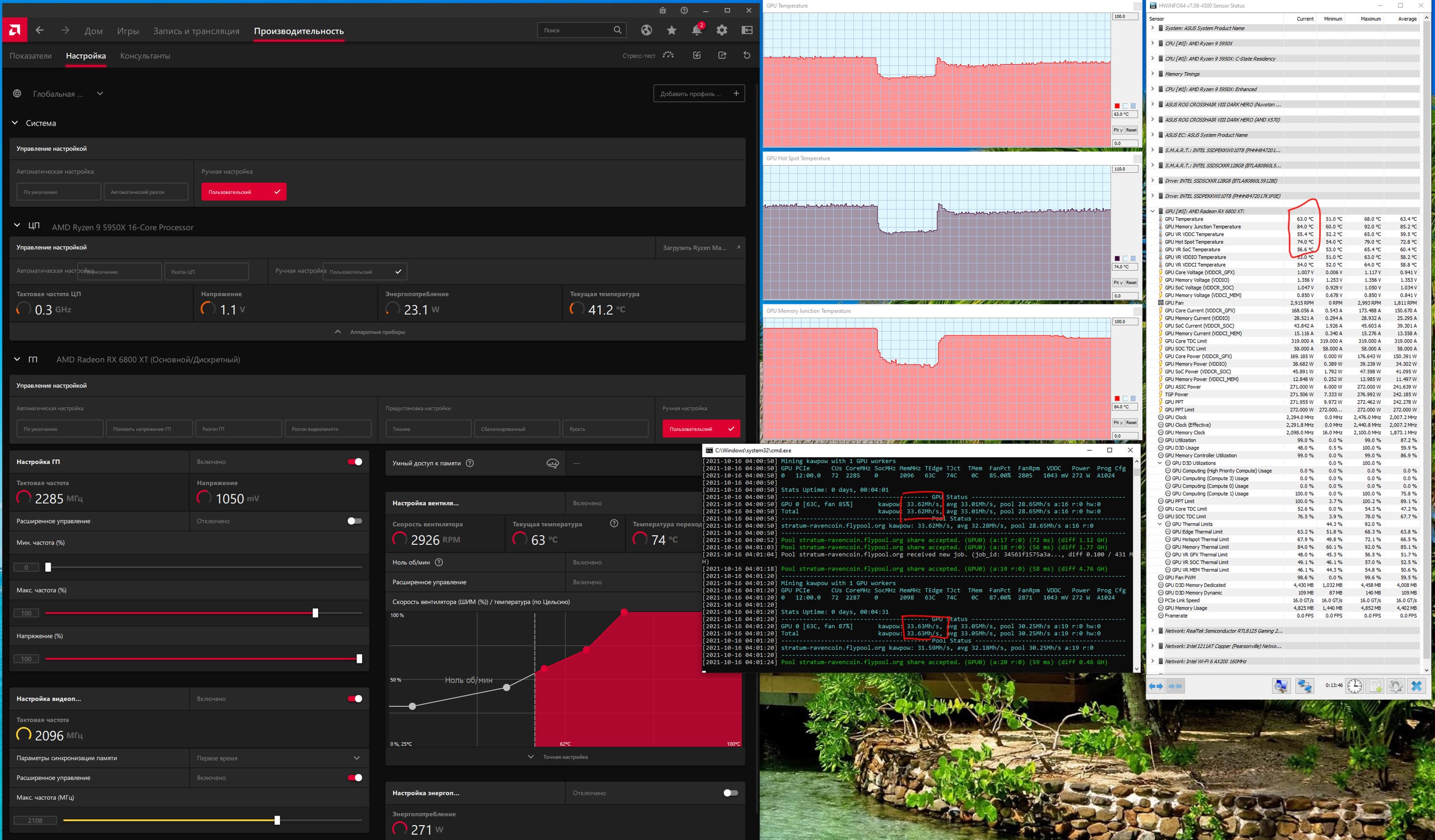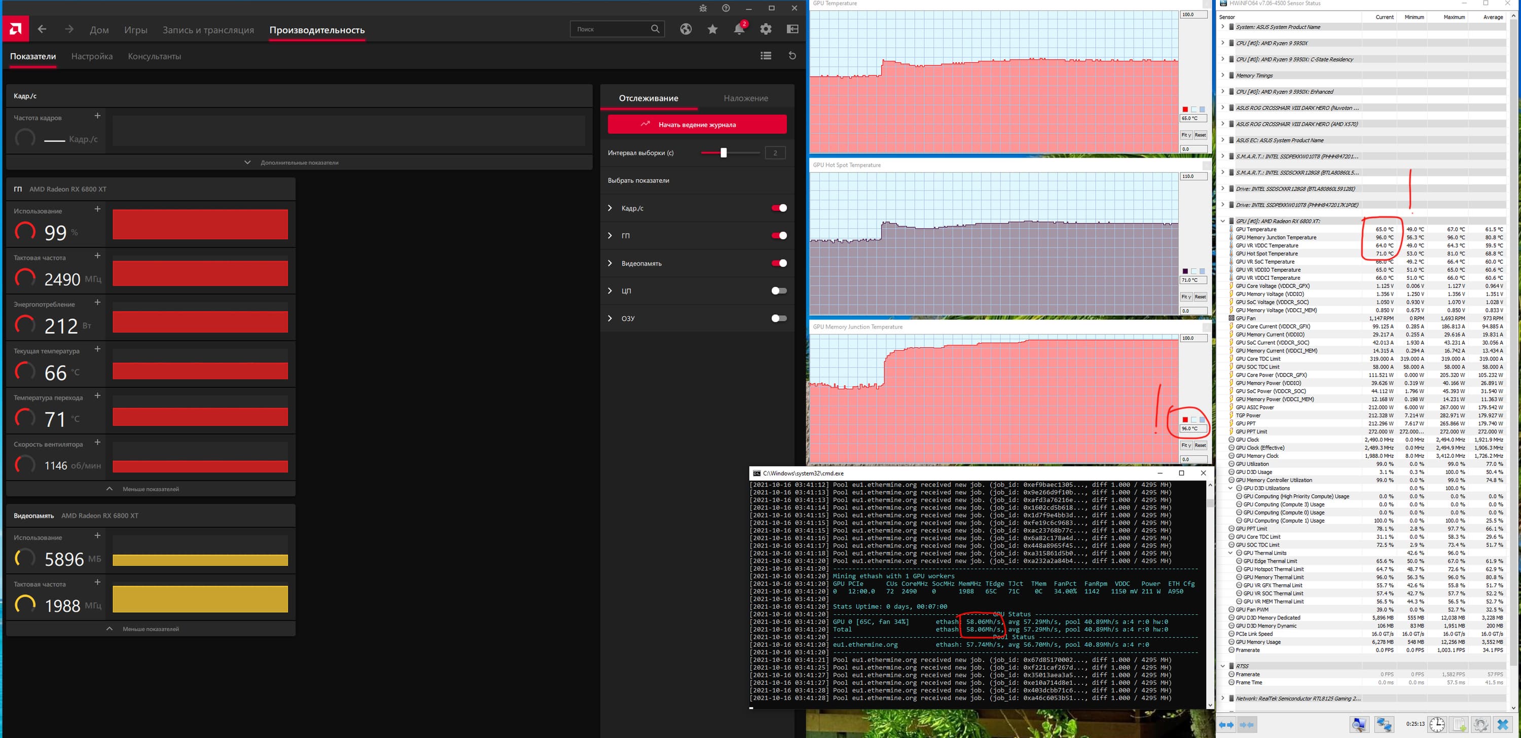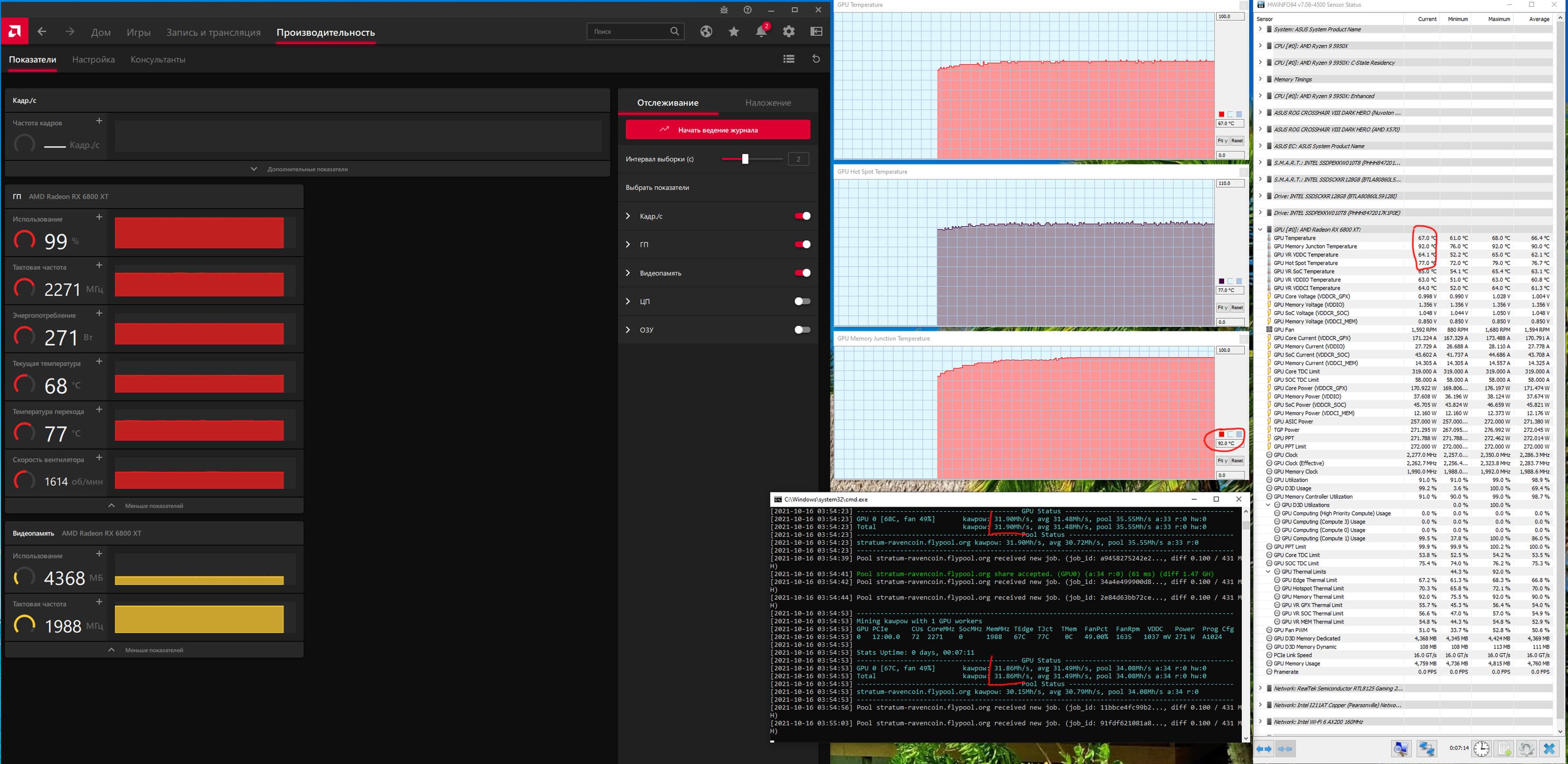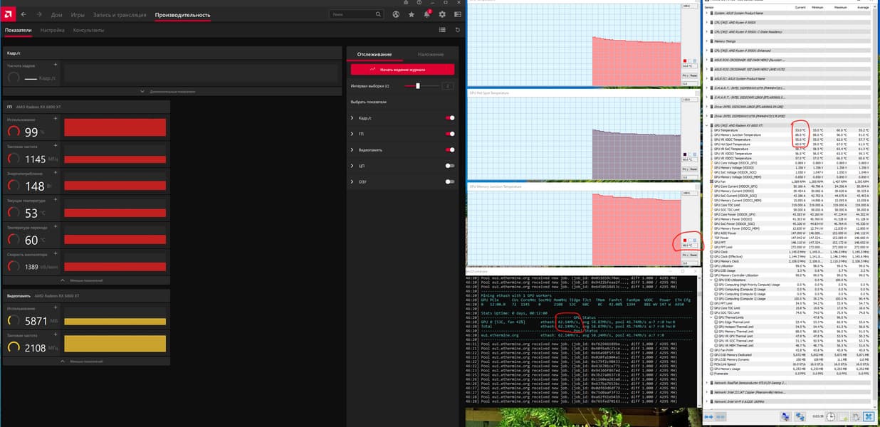 Для подсчета хэшрейта (hashrate) при майнинге «эфира» (Ethereum/ETH/ETC) и «вороны» (Ravencoin/RVN) использовался майнер T-Rex (0.21.06), фиксировался средний показатель за час в двух режимах: