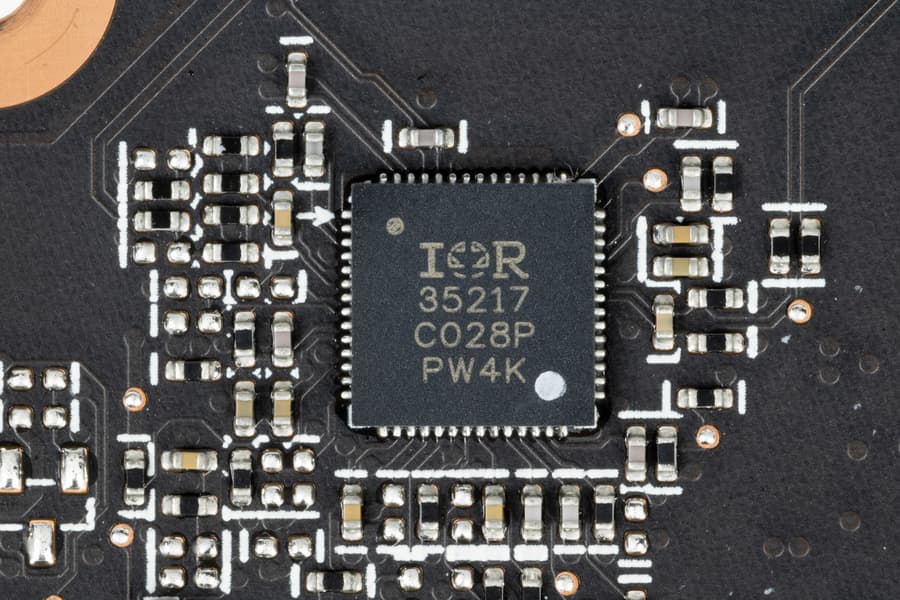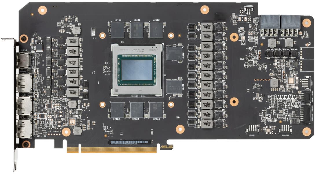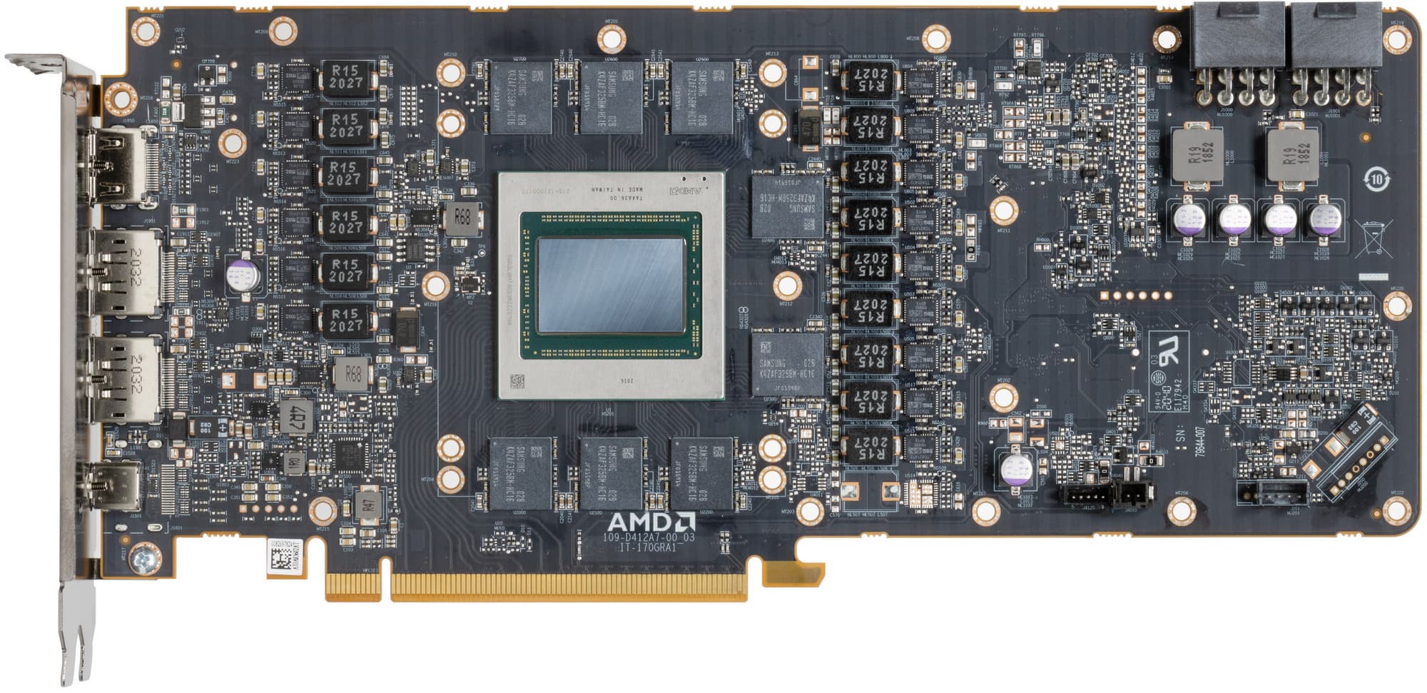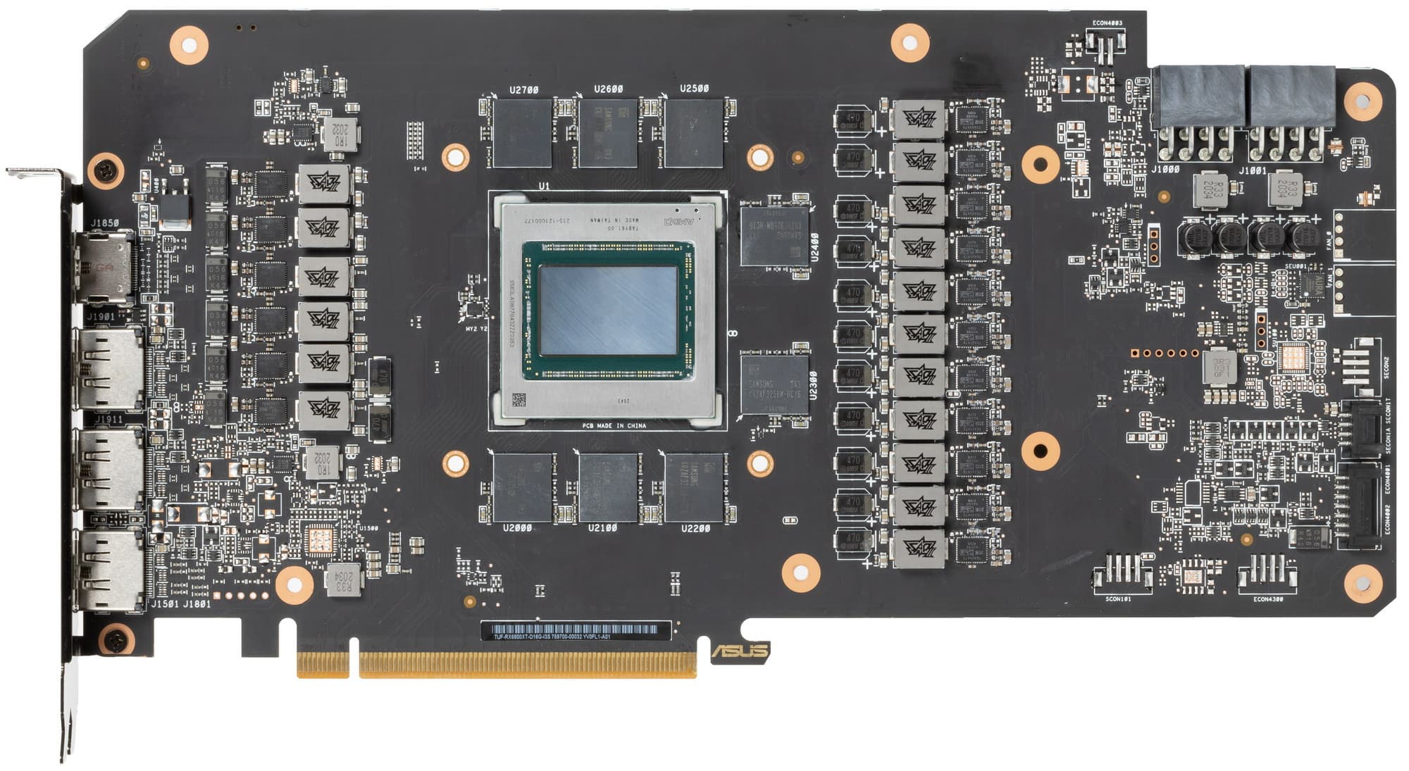 Суммарное количество фаз питания у референс-карты Radeon RX 6800 XT — 15, а у карты Asus — 17. PCB у Asus в чем-то схожа с референсной, но есть и много отличий.