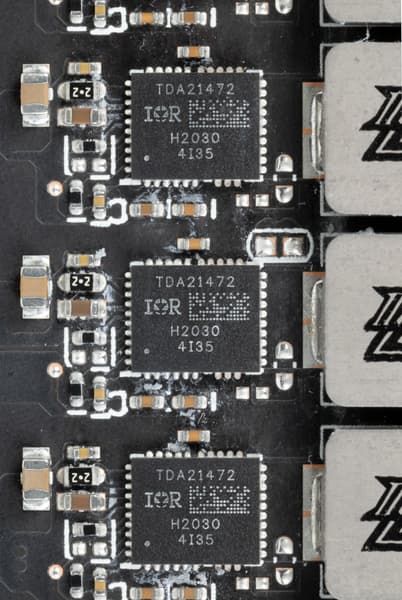 В преобразователе питания GPU, построенном с применением технологии Super Alloy Power II и современных твердотельных конденсаторов (что традиционно для Asus), используются транзисторные сборки DrMOS — в данном случае TDA21472 (IOR/Infineon), каждая из которых рассчитана на максимальный ток в 70 А (суммарно 980 А, этого с лихвой хватит на любой разгон :)).