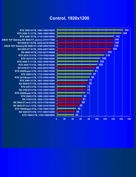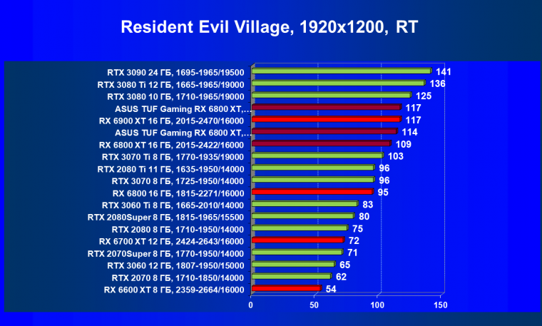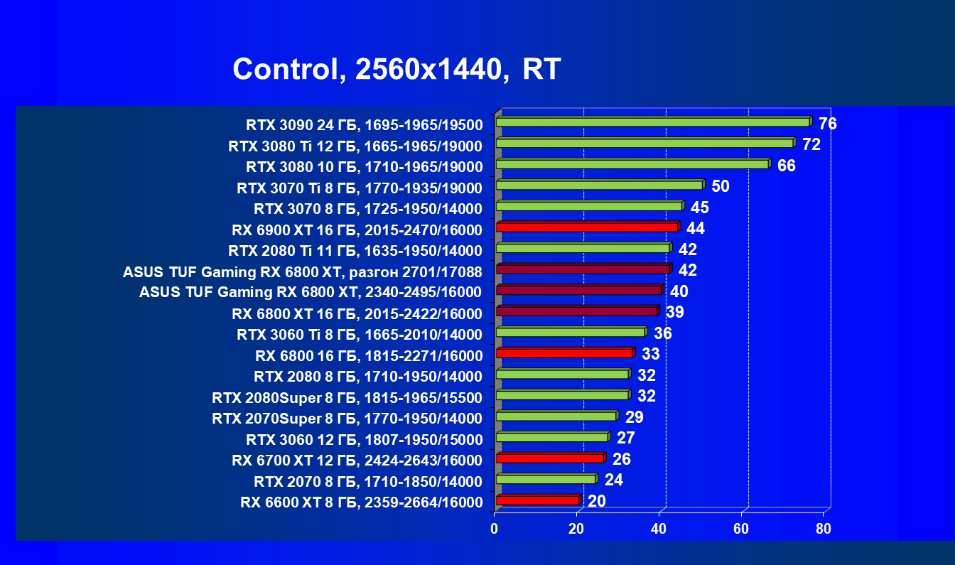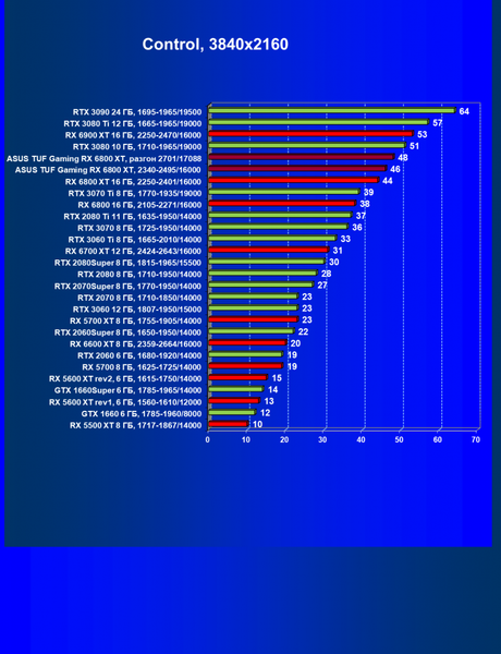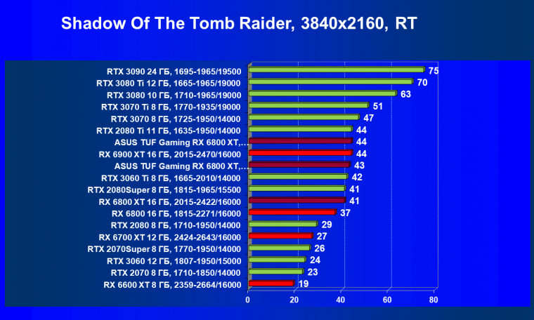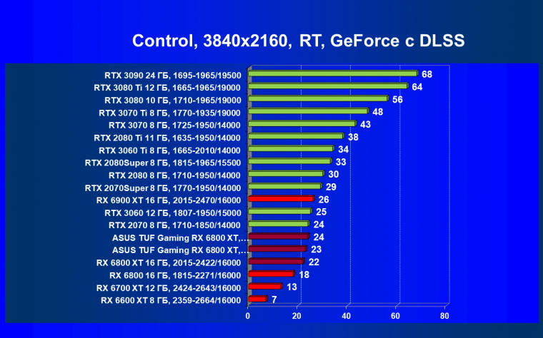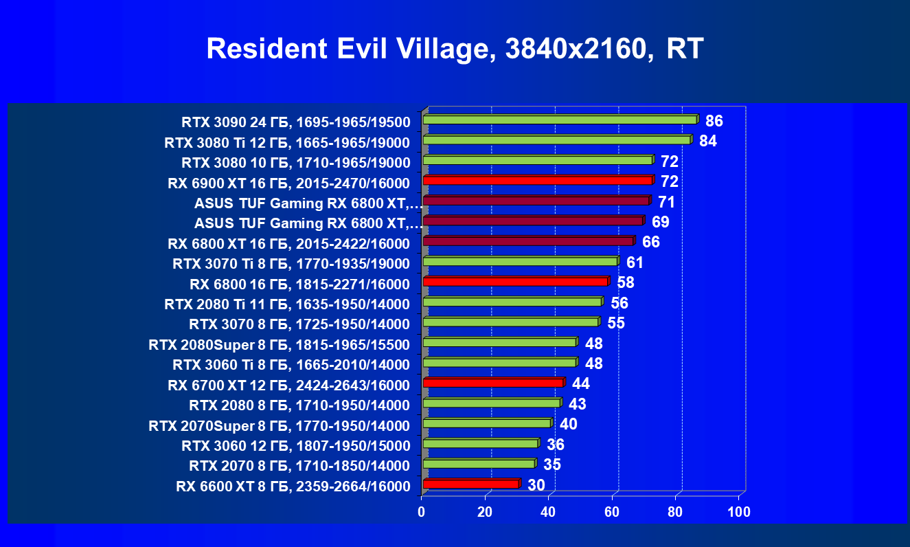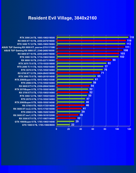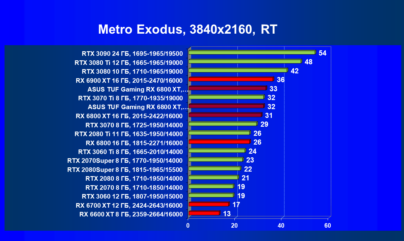 Очевидно, что в классических играх Radeon RX 6800 XT составляет прекрасную конкуренцию такому ускорителю, как GeForce RTX 3080, а карта Asus по производительности вообще подбирается к GeForce RTX 3080 Ti, при разгоне даже обходя его.