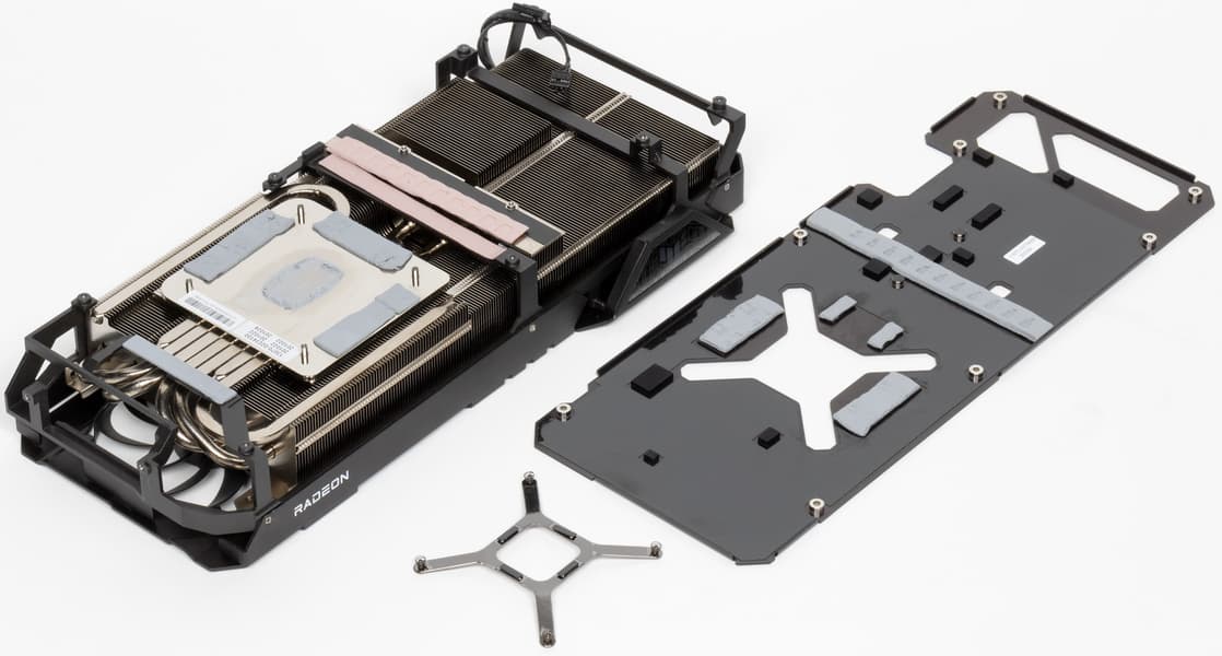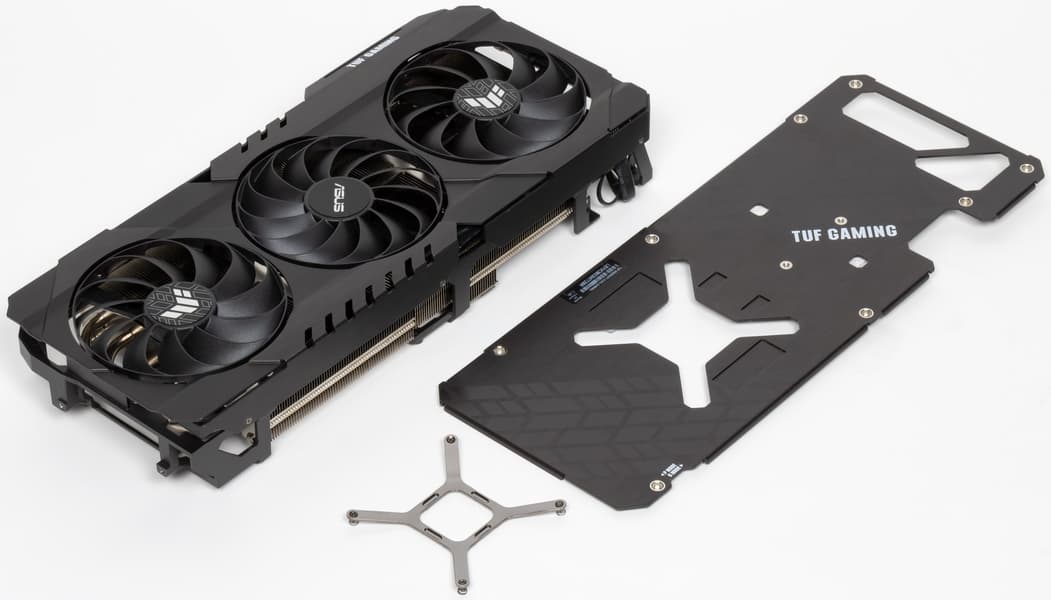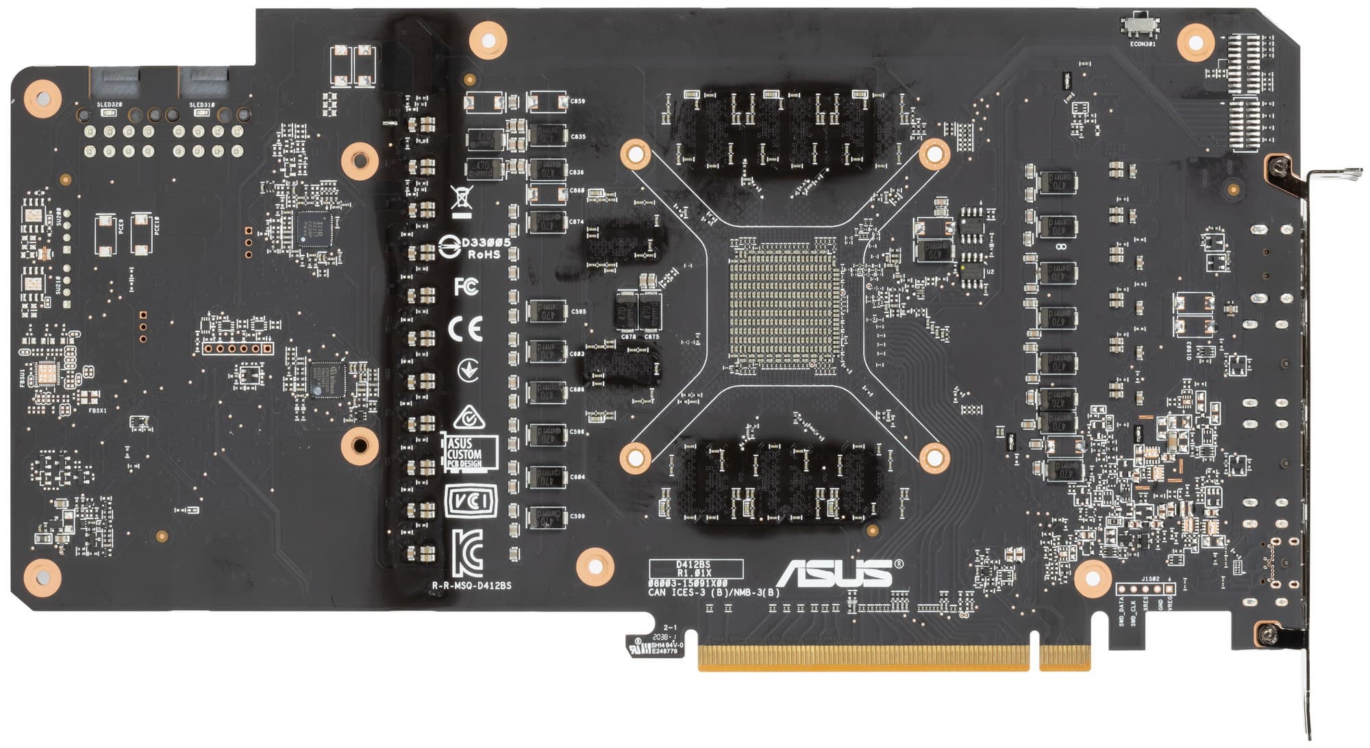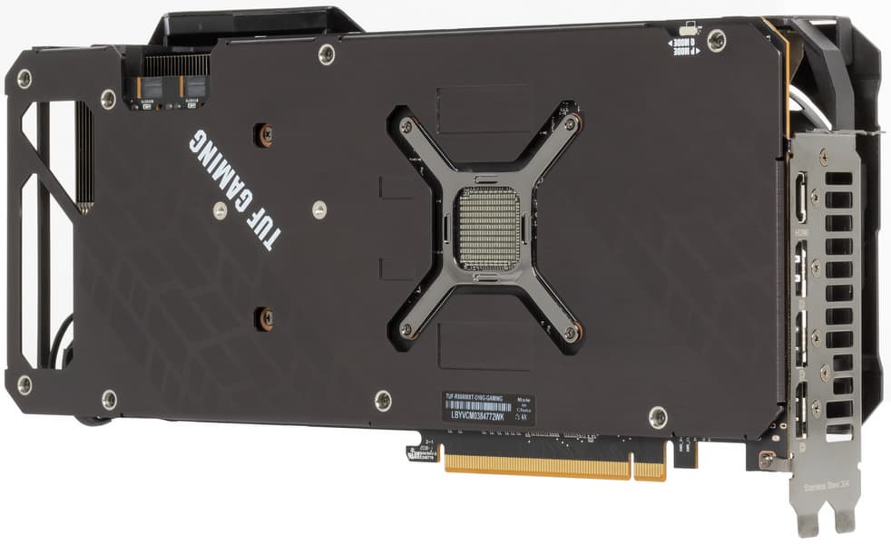 Основой СО является огромный двухсекционный пластинчатый никелированный радиатор с тепловыми трубками, припаянными к подошве прямого контакта с GPU и микросхемами памяти. Этот же радиатор служит охладителем и для компонентов преобразователей питания VRM с помощью небольших подошв. Рамы, служащей как охладителем, так и ребром жесткости всей конструкции, будучи прикрученной к крепежной планке видеокарты, в данном случае нет (это еще одно отличие серии TUF от ROG, где такая рама имеется). Задняя пластина выполнена из алюминия с электрозащитным покрытием и имеет двойное предназначение: служит элементом защиты PCB и через термоинтерфейс участвует в охлаждении оборотной стороны карты в зонах микросхем памяти и преобразователей питания.