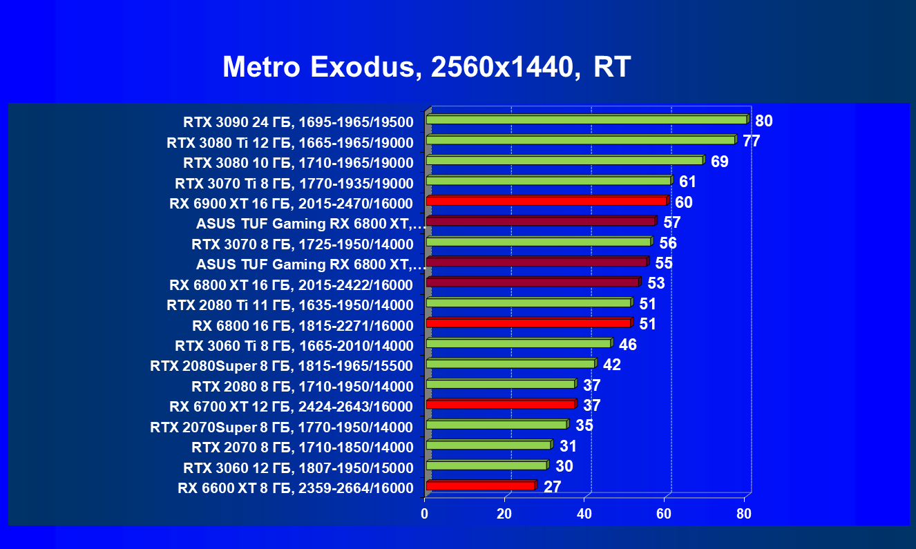 Еще со времен анонса серии Radeon RX 6000 мы знаем, что Radeon RX 6800 XT позиционируется как прямой конкурент GeForce RTX 3080, и это действительно оправдано в большинстве игр с классической растеризацией. Более того, как GeForce RTX 3080, так и Radeon RX 6800 XT могут обеспечить комфорт в играх с максимальными настройками графики в разрешении 4К. Конечно же, не во всех играх такое возможно, но в большинстве — точно. Понятно, что с более низким разрешением Radeon RX 6800 XT справляется играючи. Карта Asus в плане производительности чуть быстрее референс-аналога.